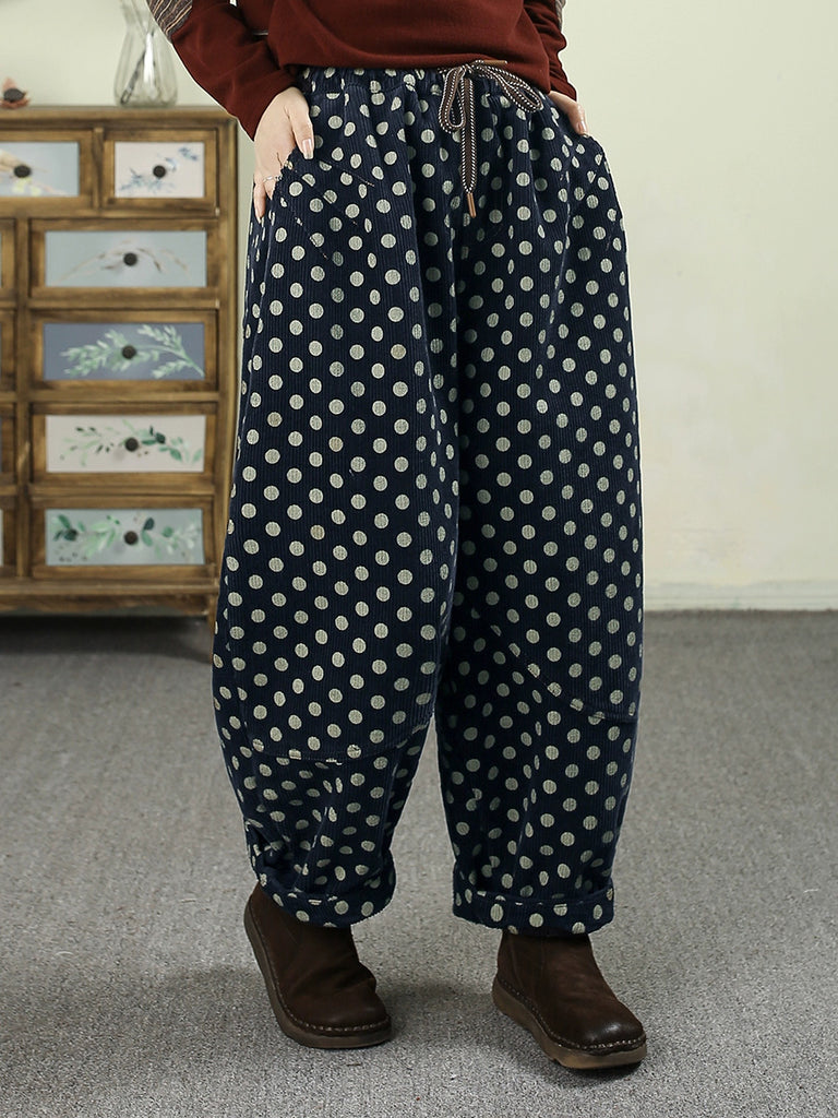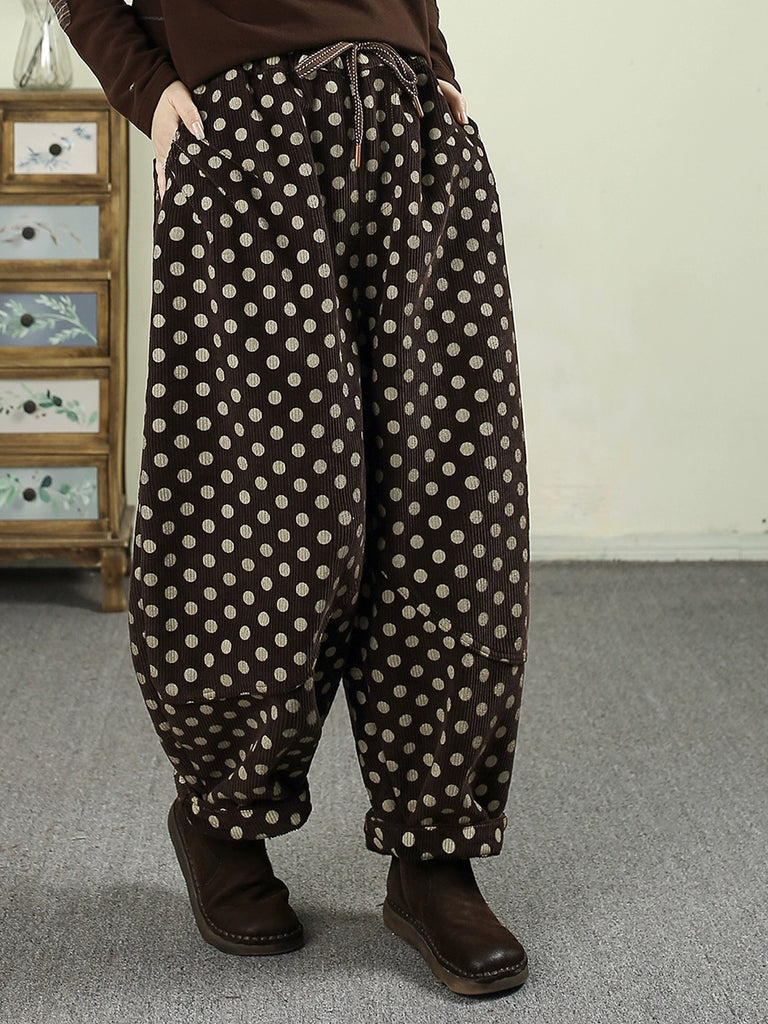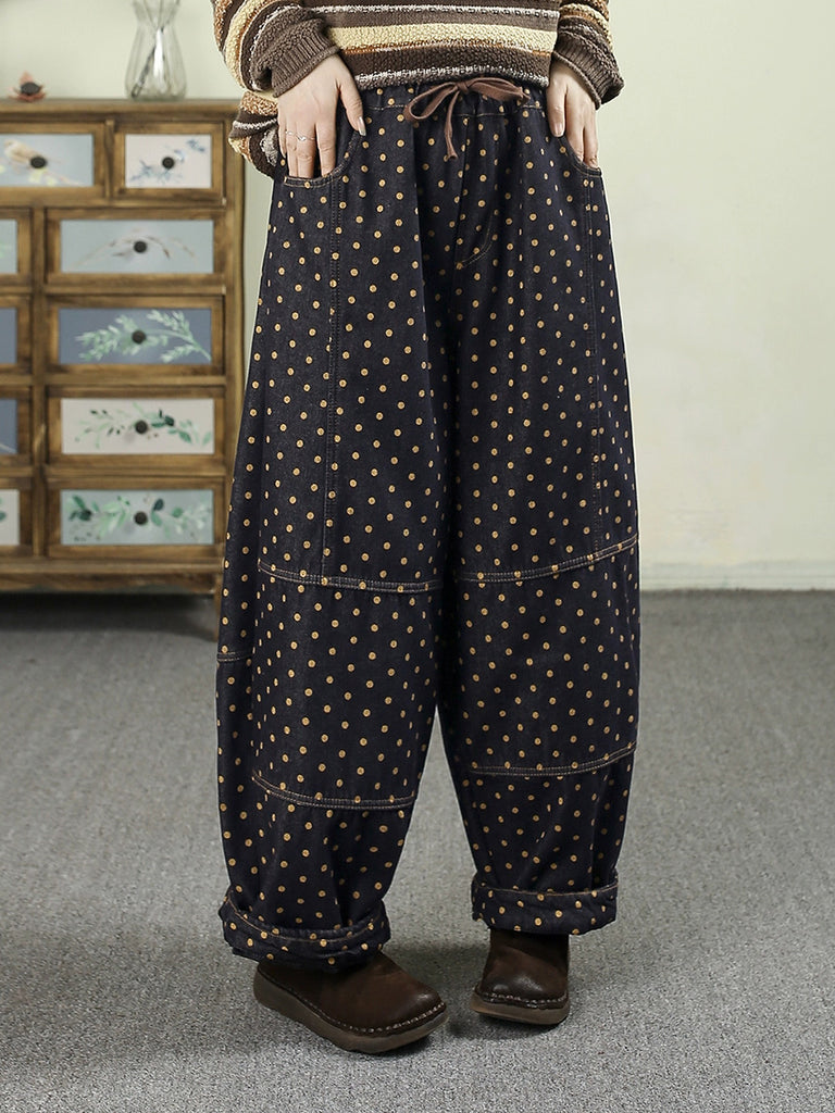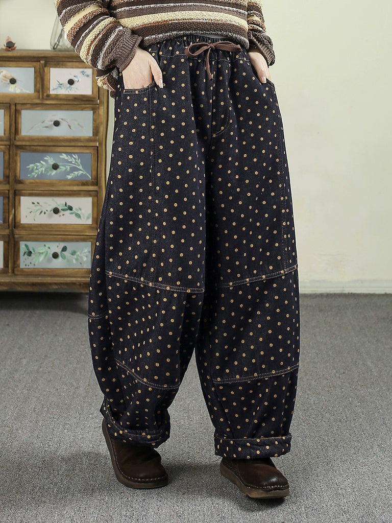 Pantaloni harem invernali da donna in denim retrò a pois con fodera in pile