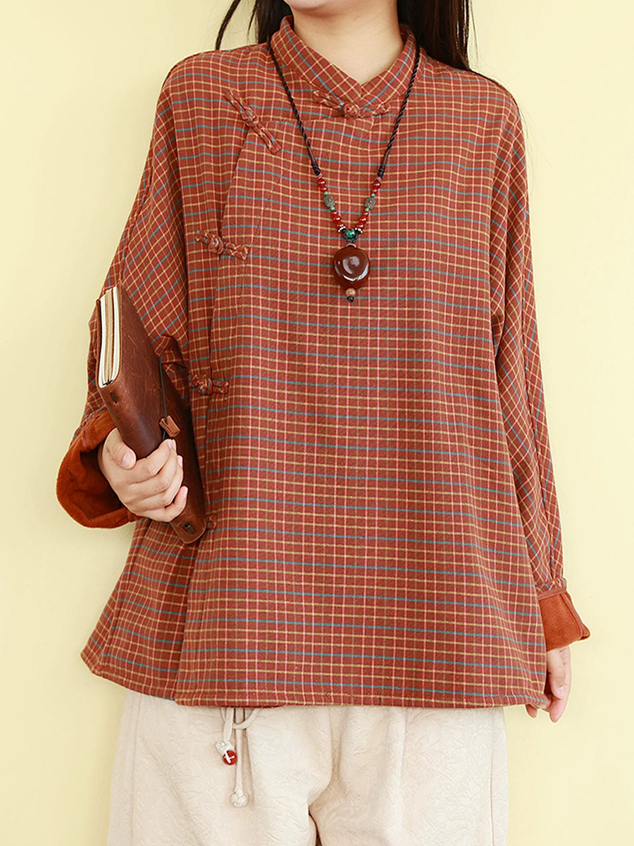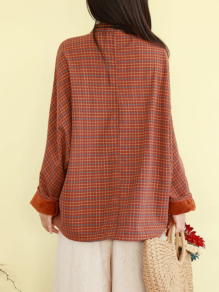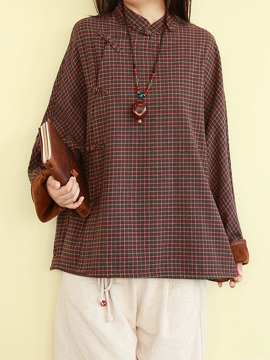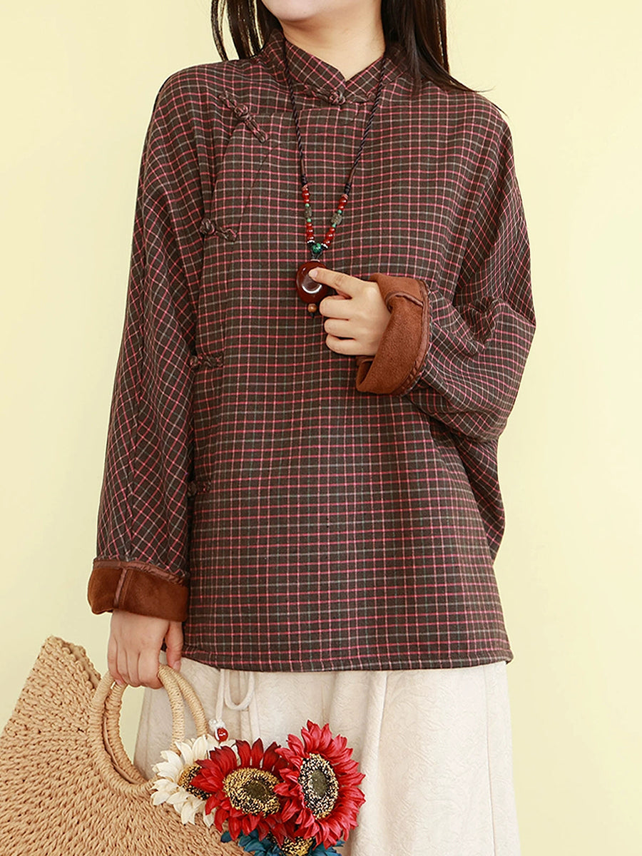 Camicetta invernale da donna con colletto rialzato e fodera in pile, motivo scozzese etnico