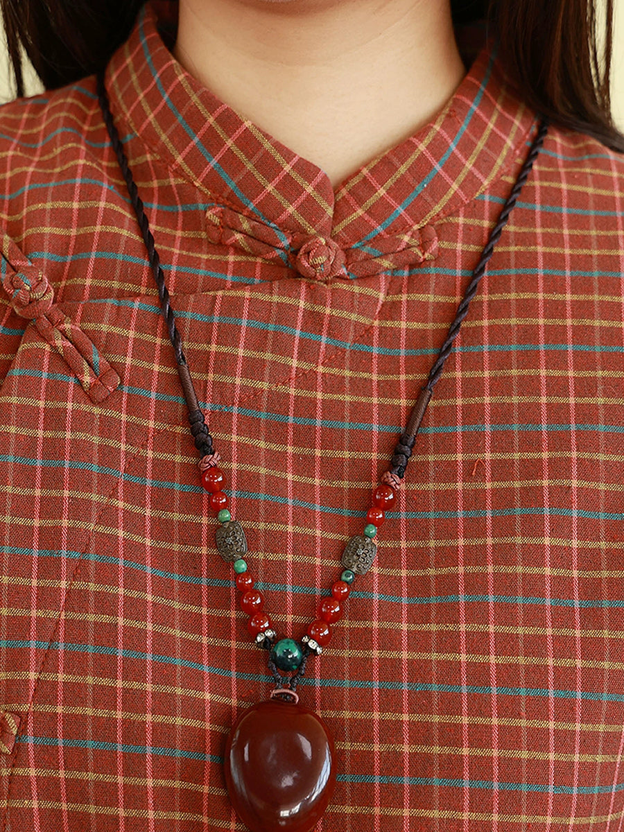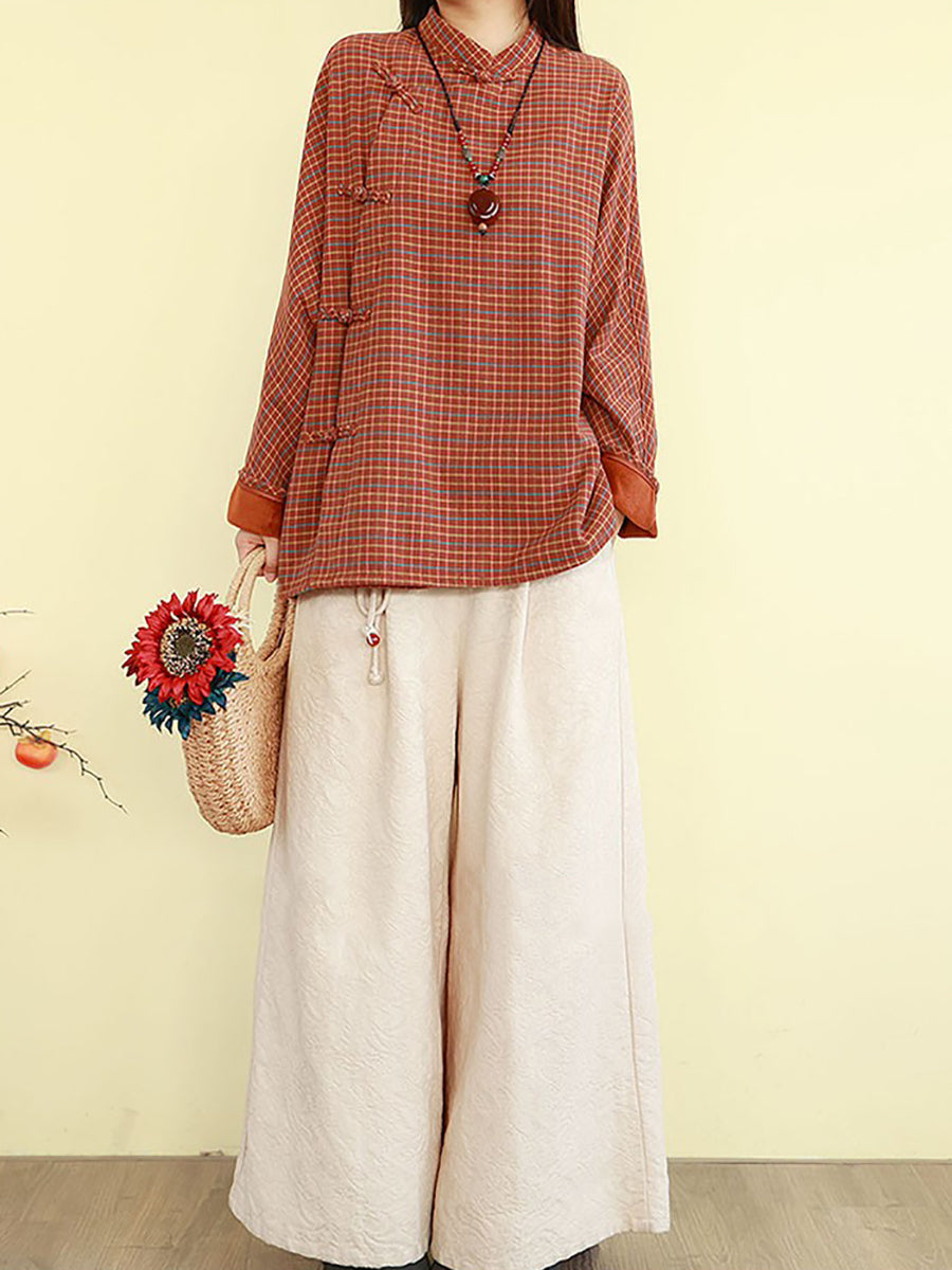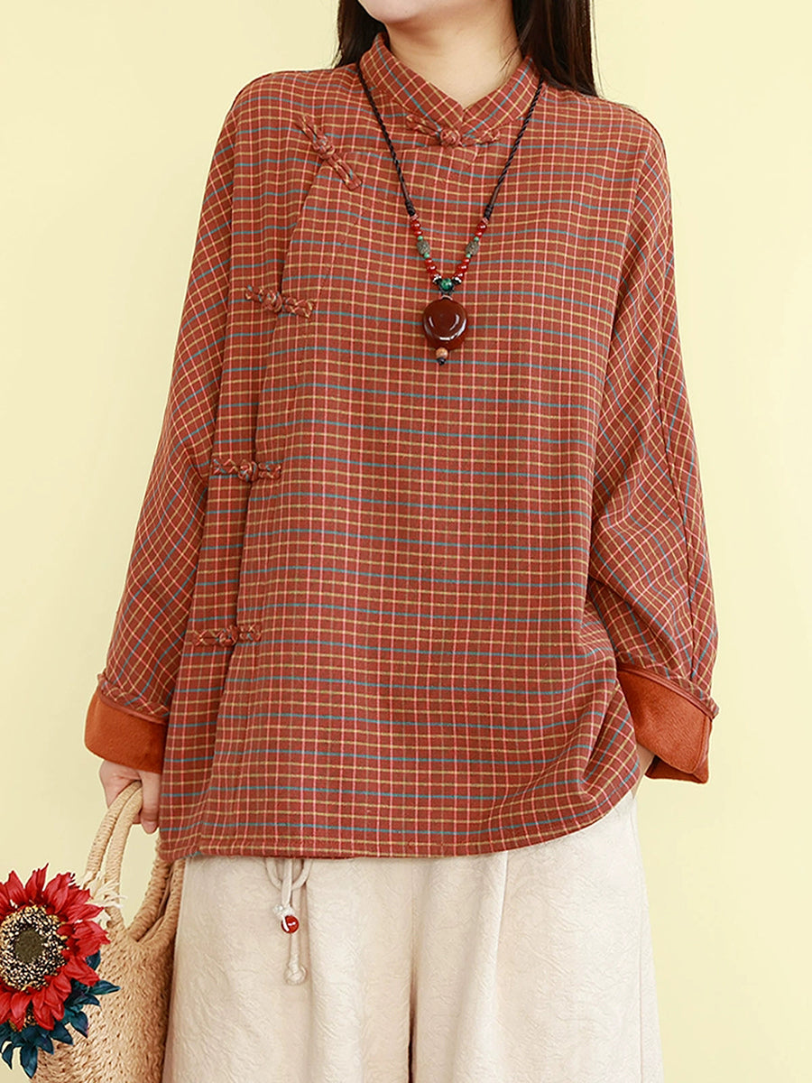 Camicetta invernale da donna con colletto rialzato e fodera in pile, motivo scozzese etnico