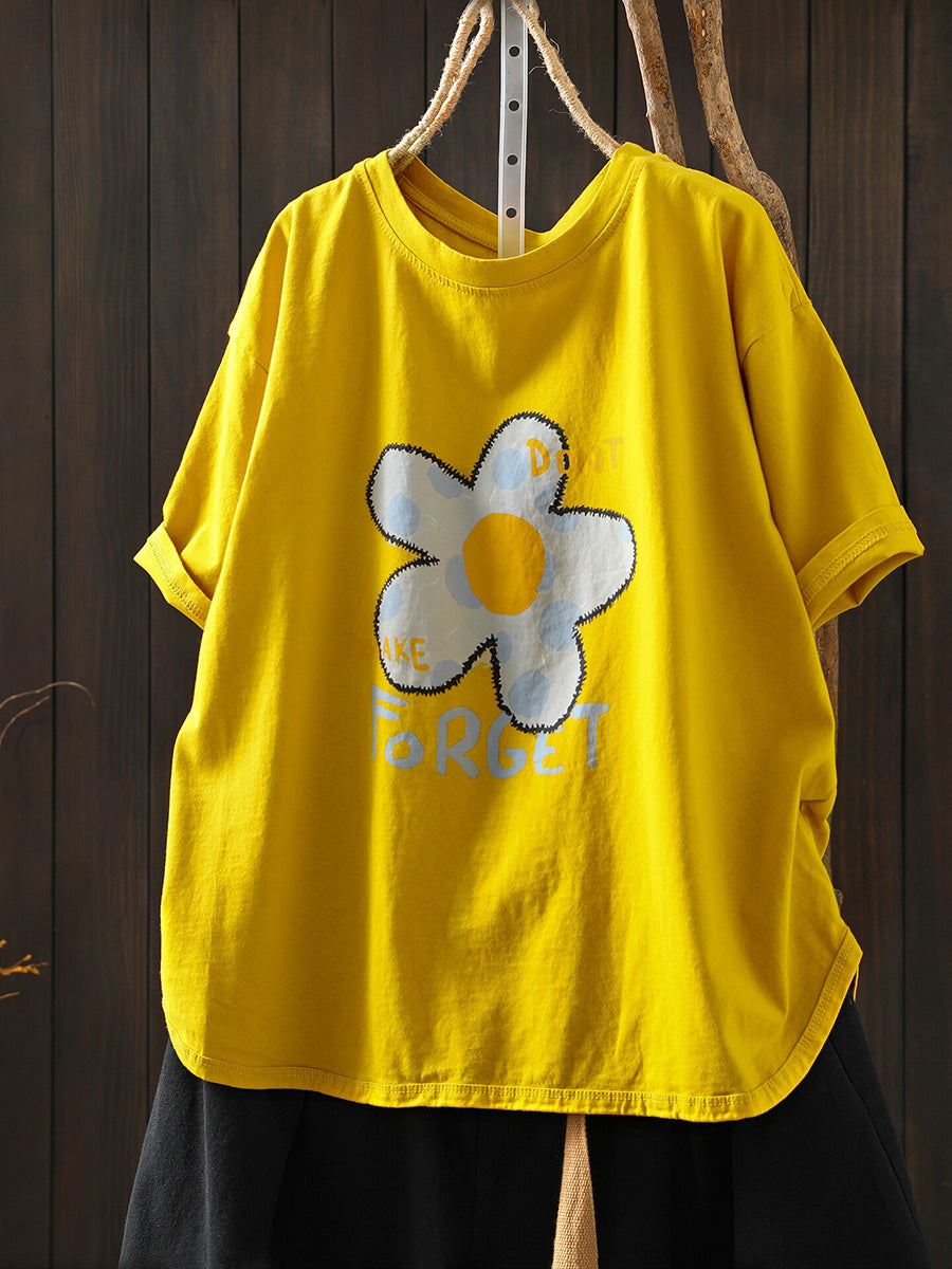 T-shirt da donna estiva in cotone con stampa floreale e scollo a O.