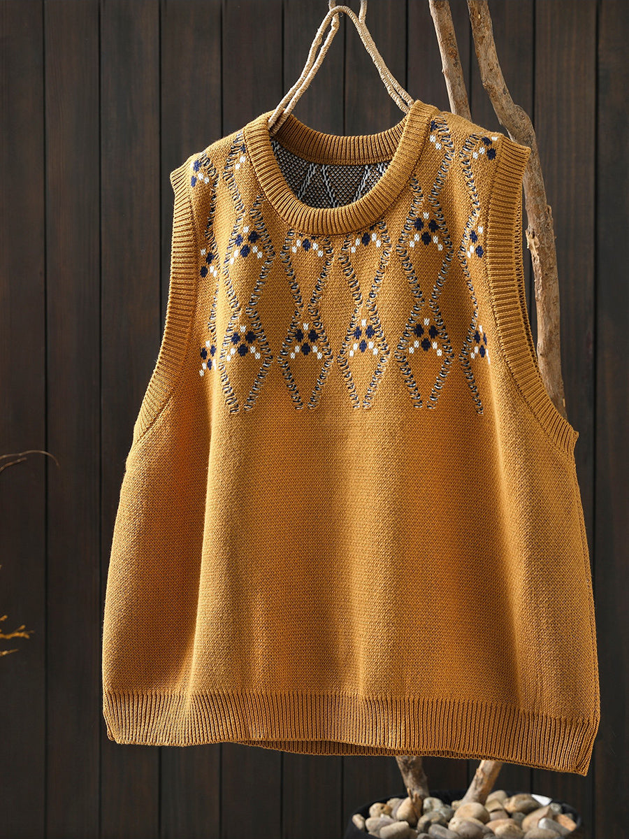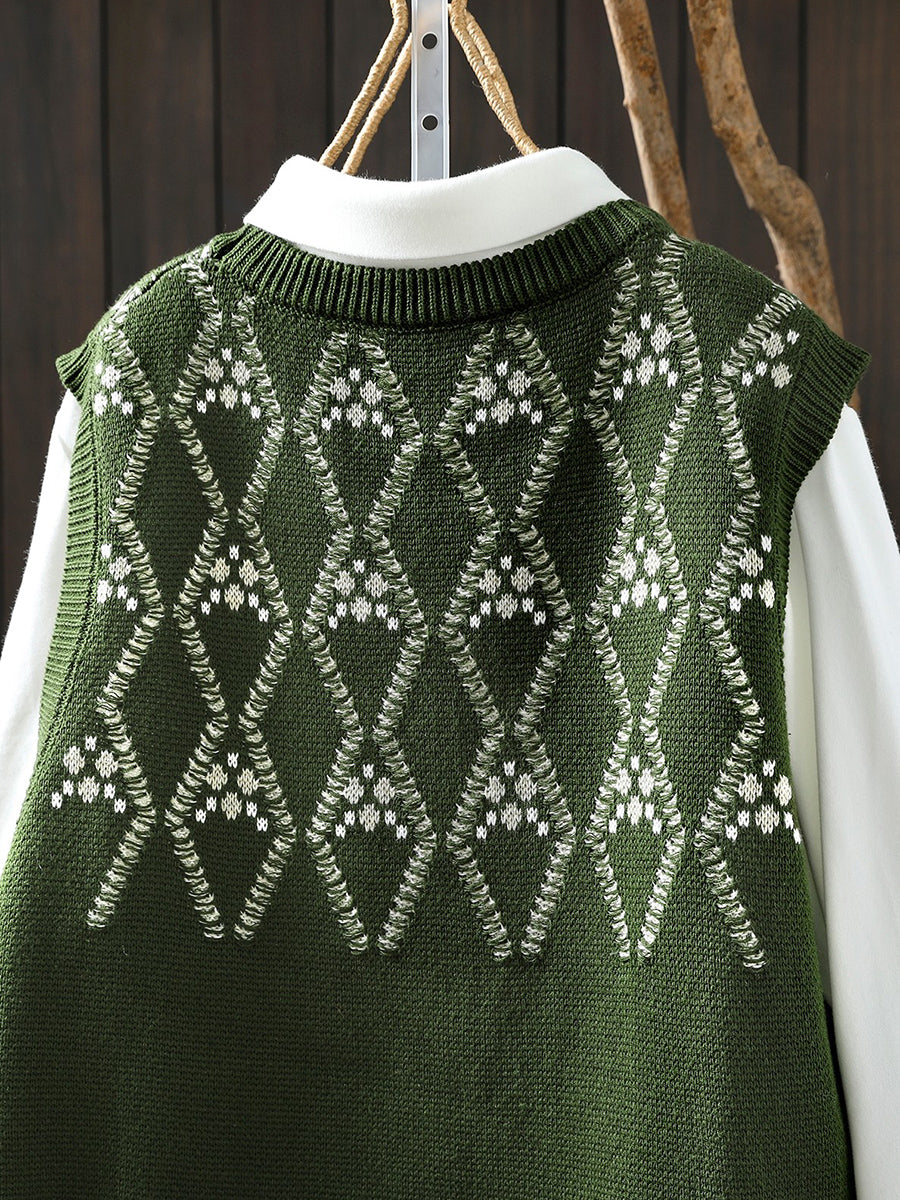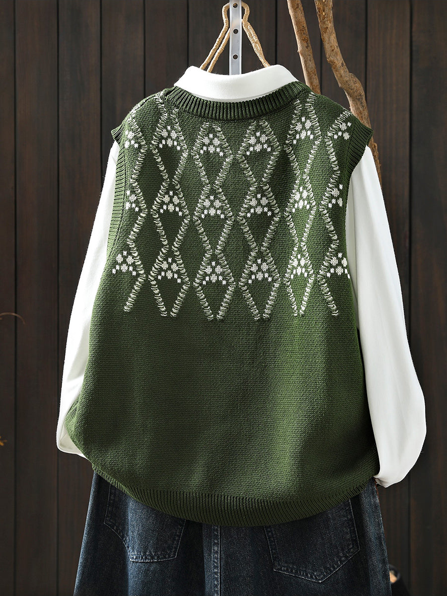 Gilet lavorato a maglia con scollo a V e motivo romboidale artistico autunnale da donna