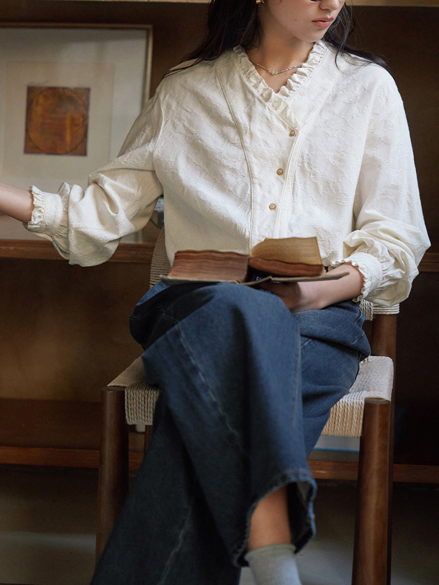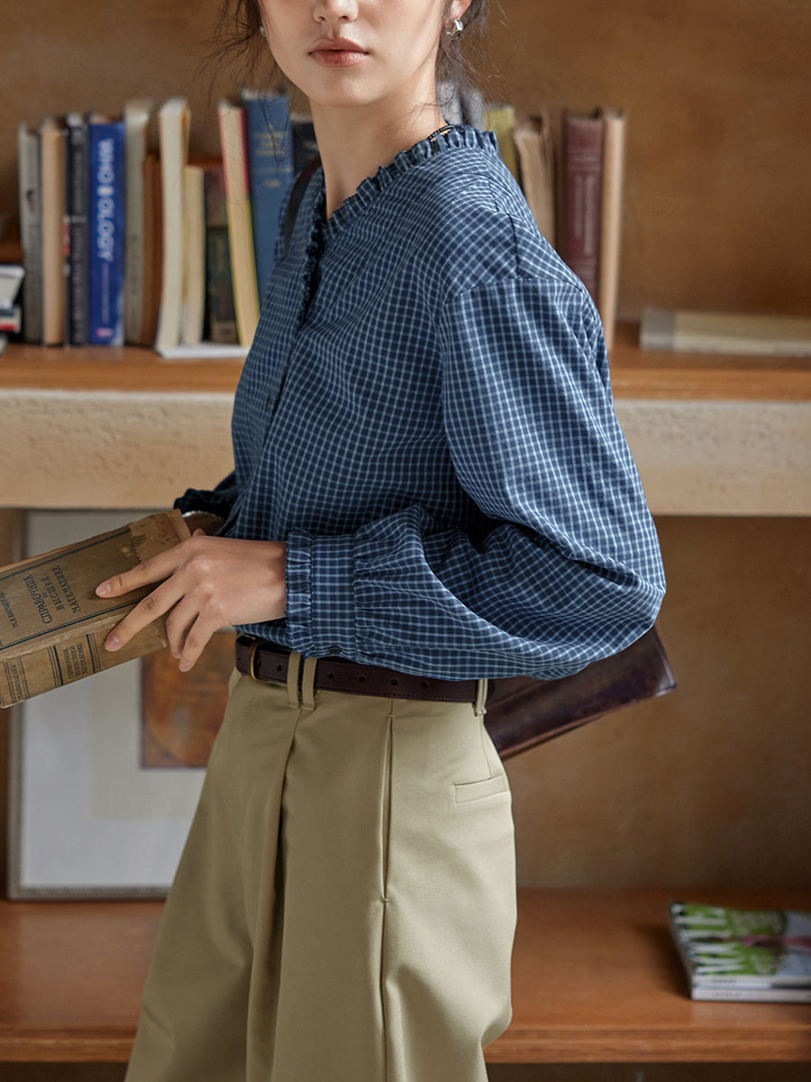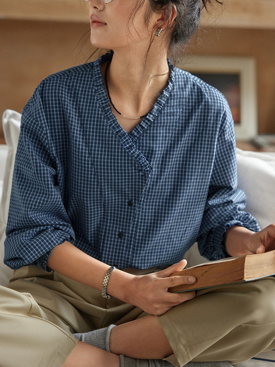 Camicia da donna a quadri con scollo a V, 100% cotone