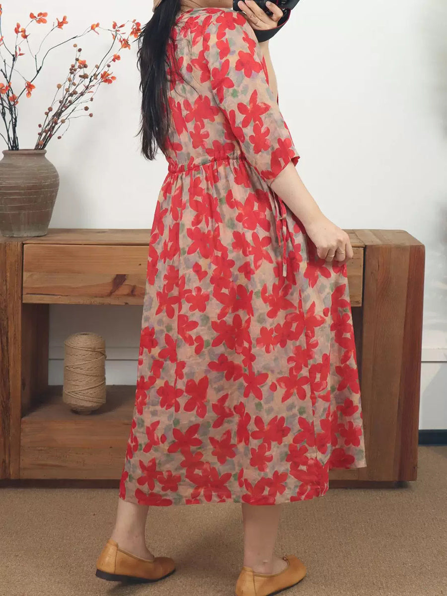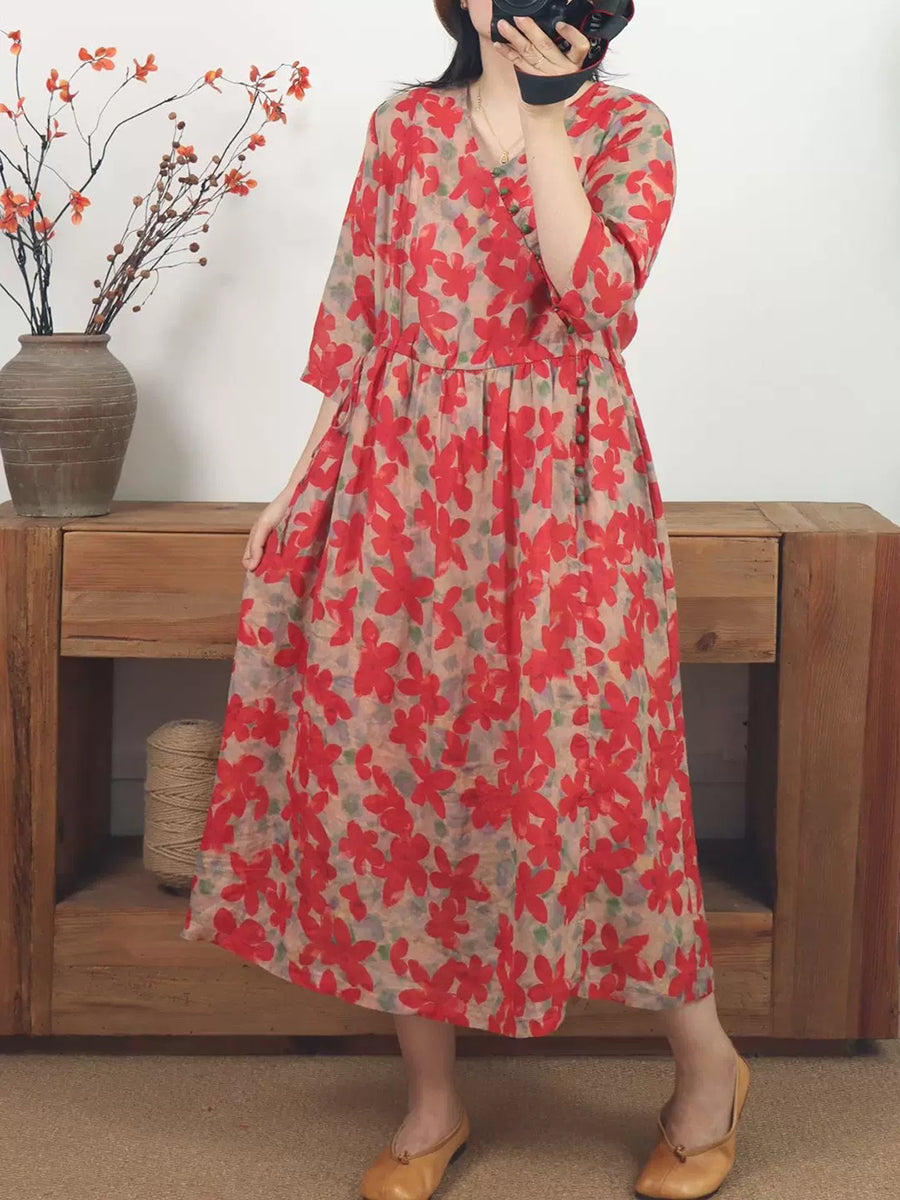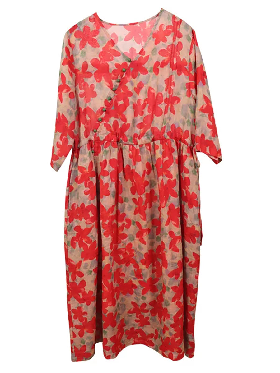 Abito estivo da donna in ramia con scollo a V e fiori artistici