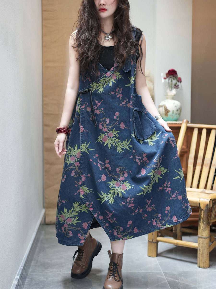 Abito salopette da donna estivo vintage con stampa floreale in denim