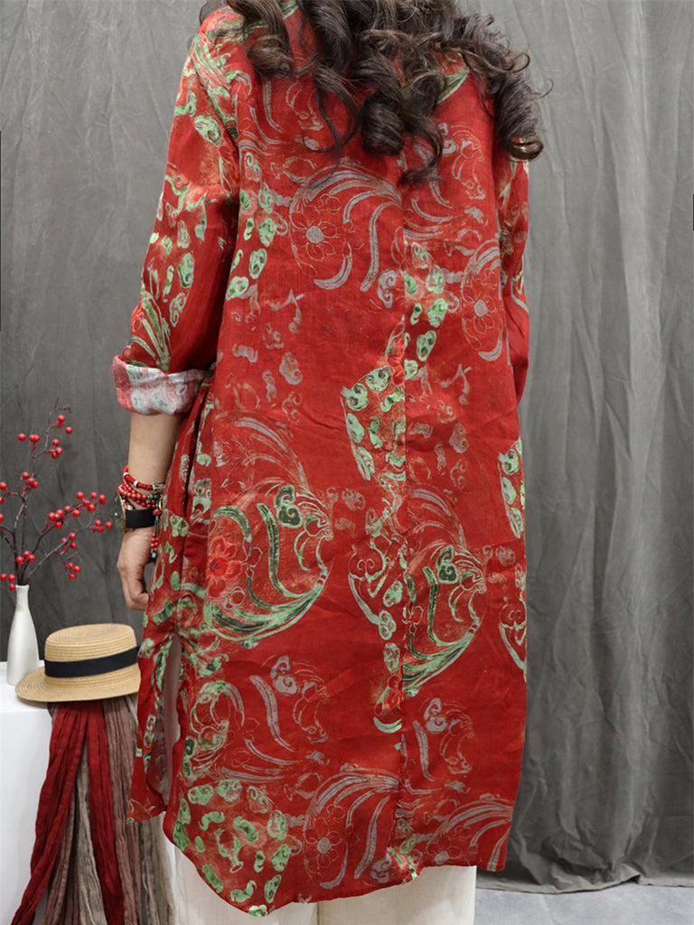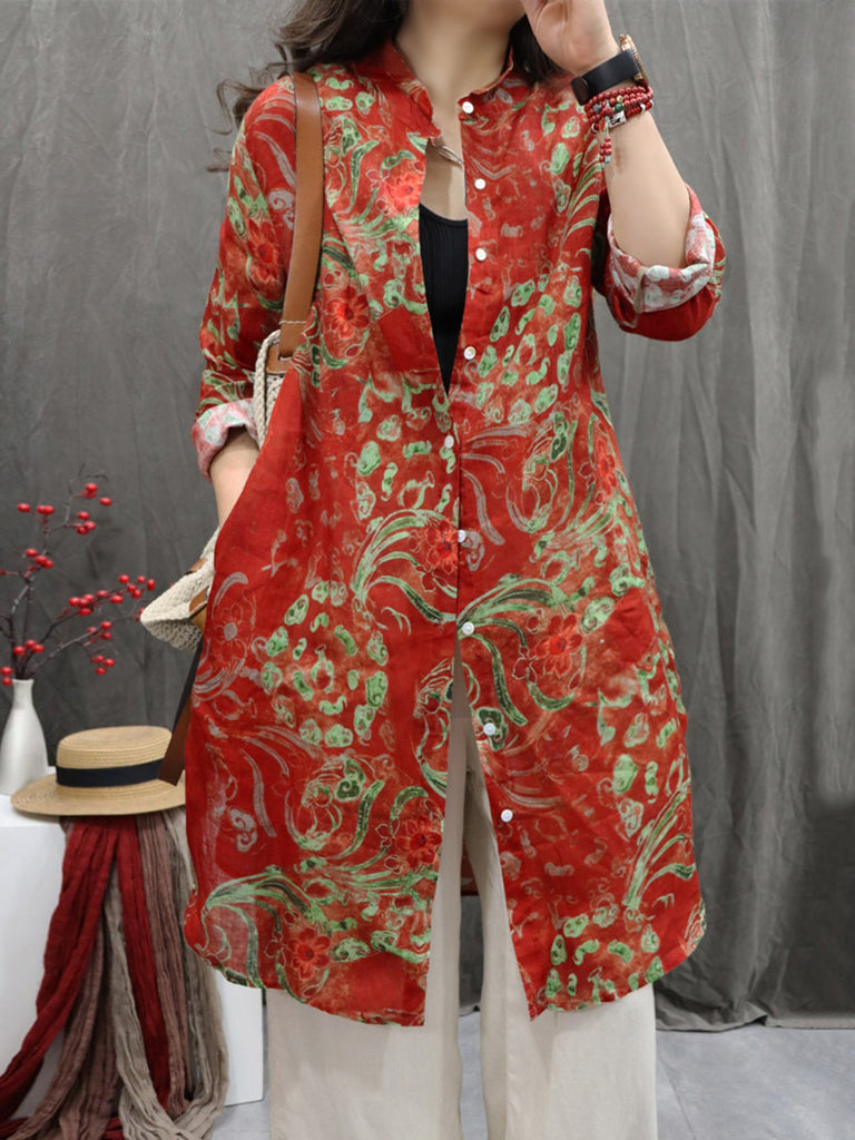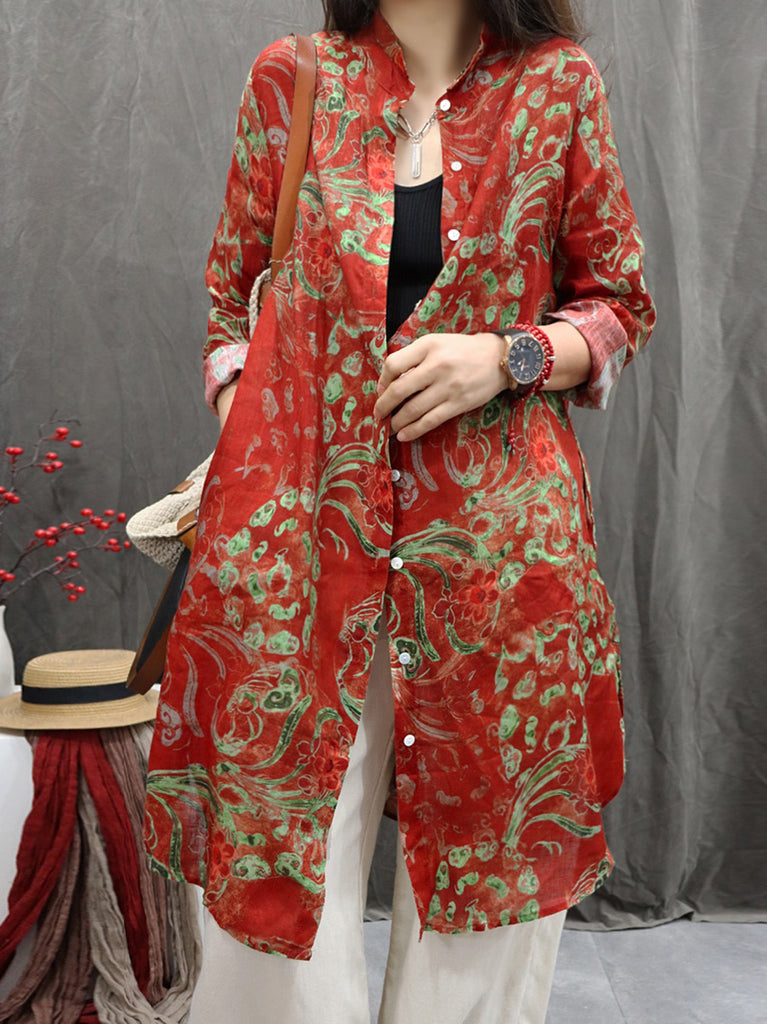 Camicia lunga da donna in lino 100% con colletto a fiori vintage