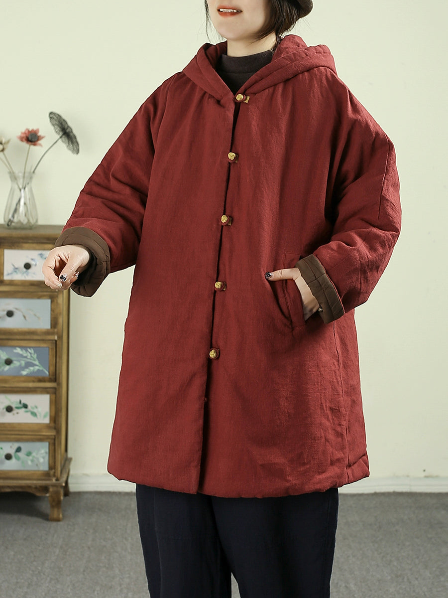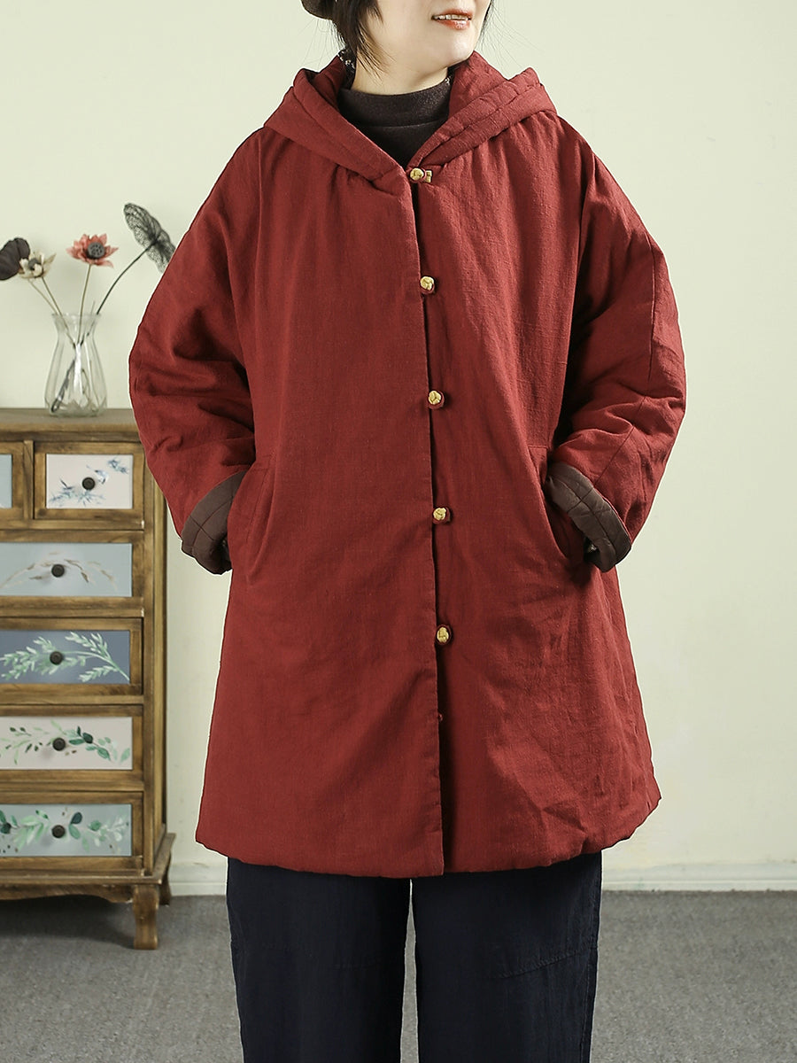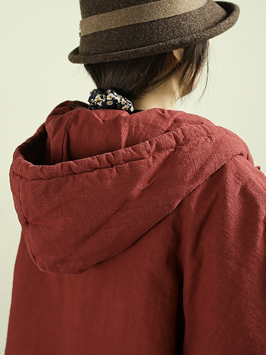 Dames winter retro jas met capuchon, effen kleur, 100% linnen.
