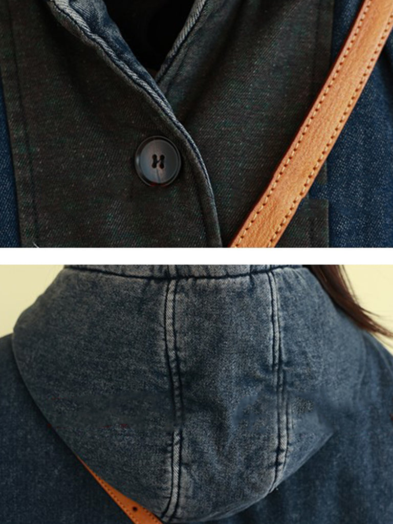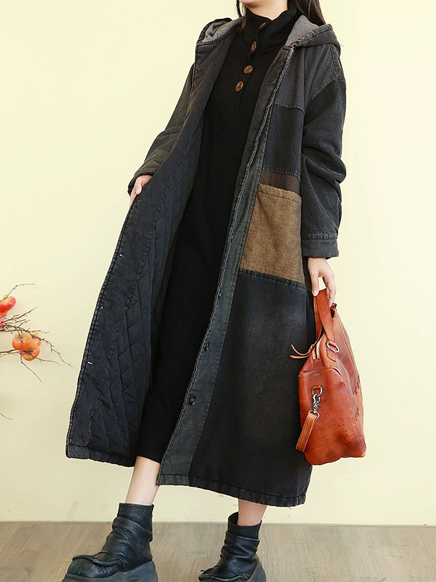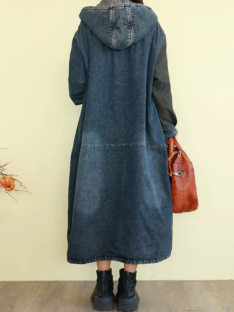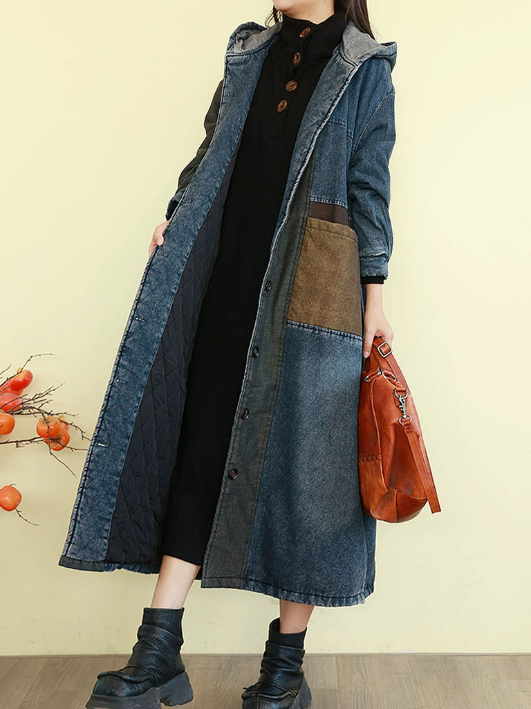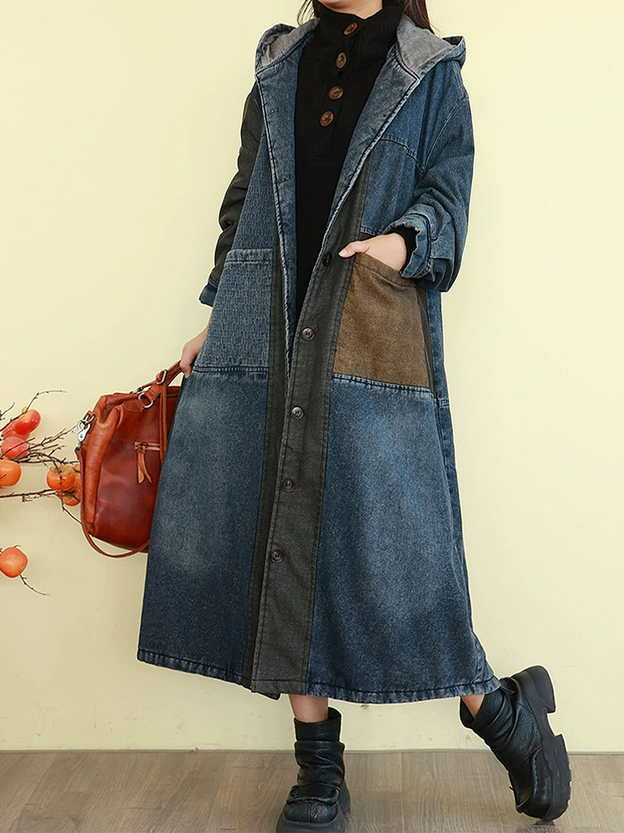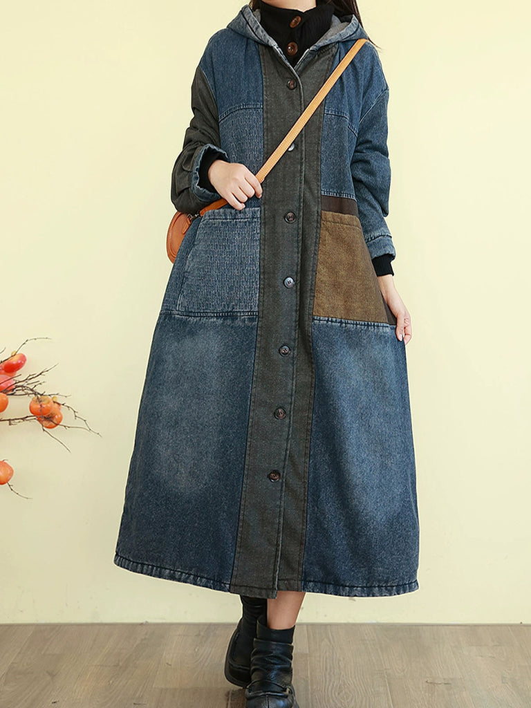 Dames Winter Retro Colorblock Denim Gewatteerde Jas met Capuchon