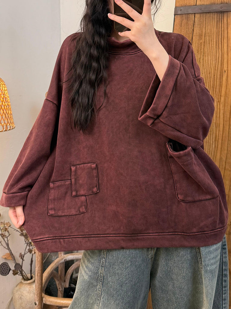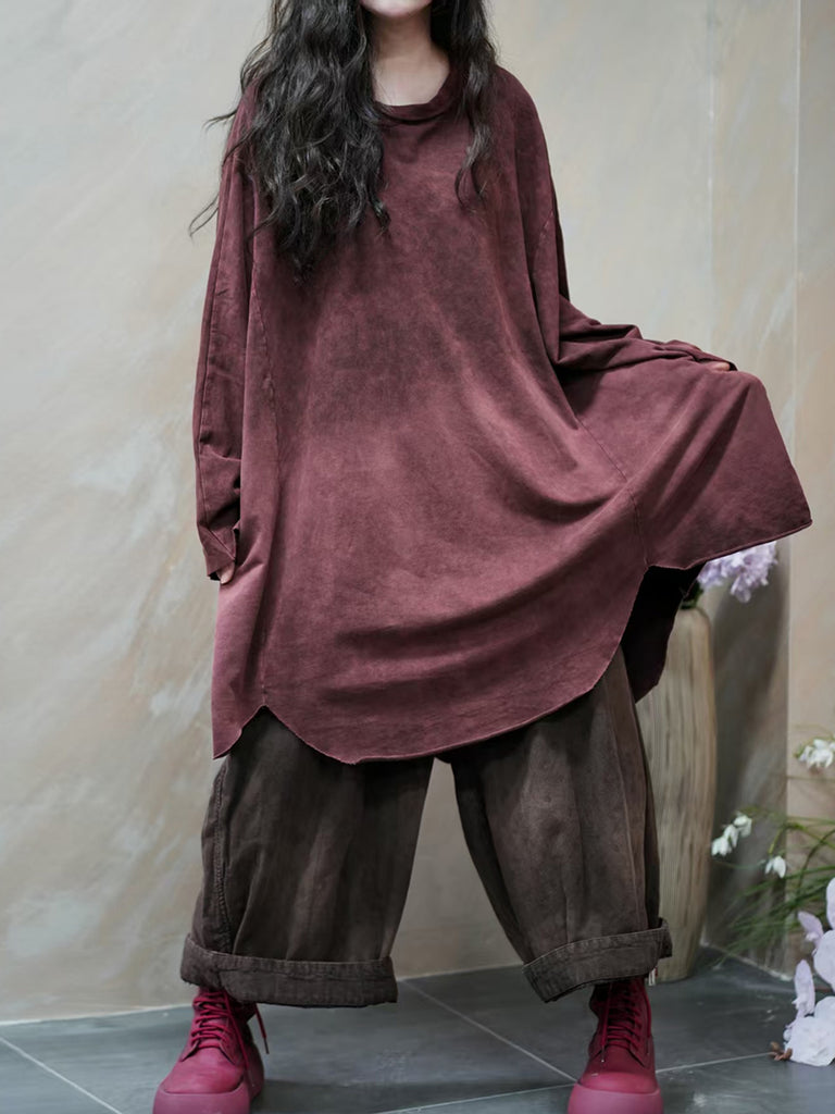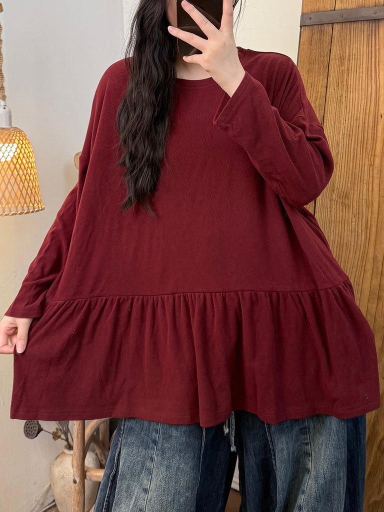 Dames herfst retro puur kleur gesplitst katoenen O-hals shirt