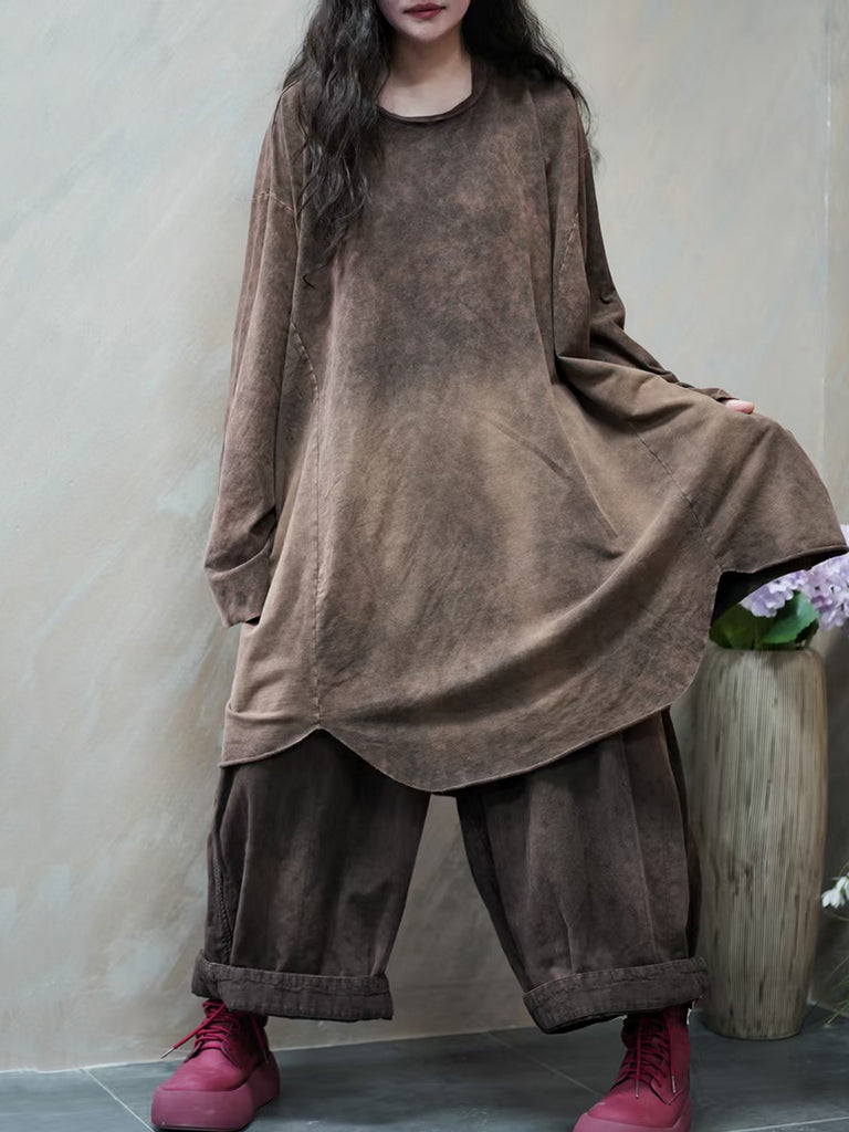 Dames herfst retro tie-dye o-hals blouse van 100% katoen