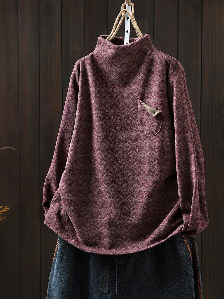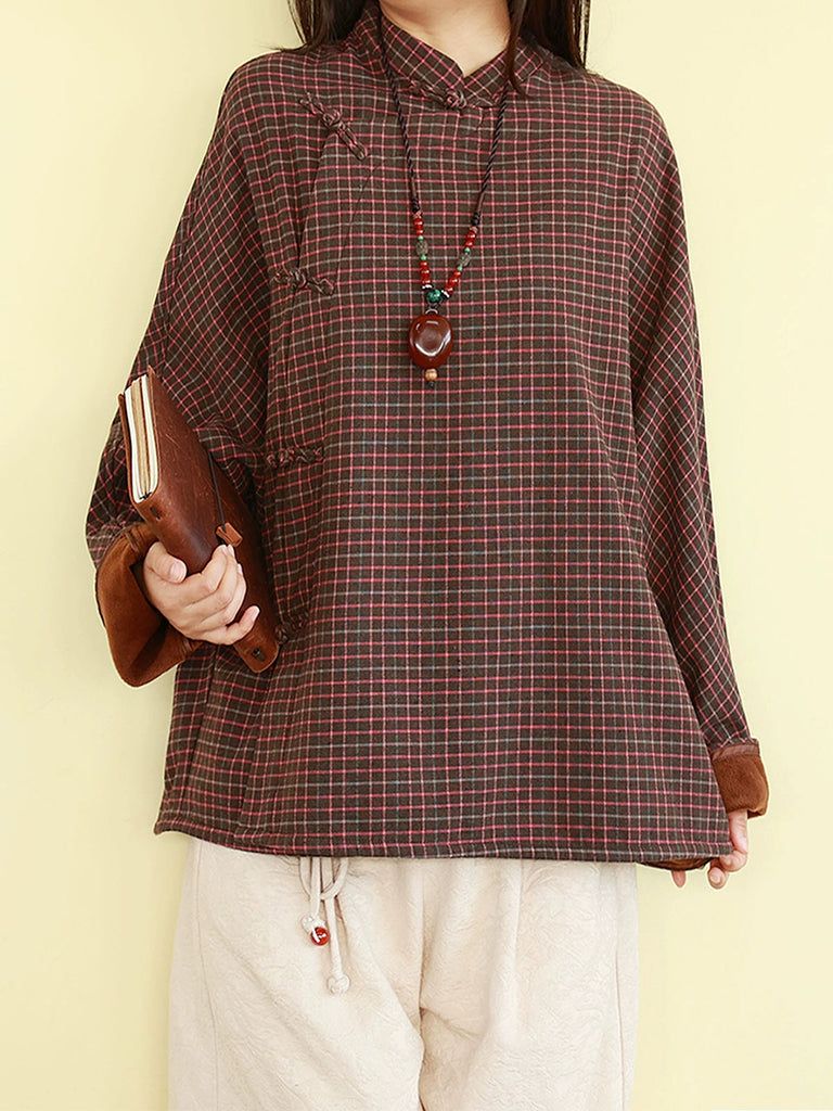 Dames Winter Etnische Geruite Staande Kraag Fleece Gevoerde Blouse