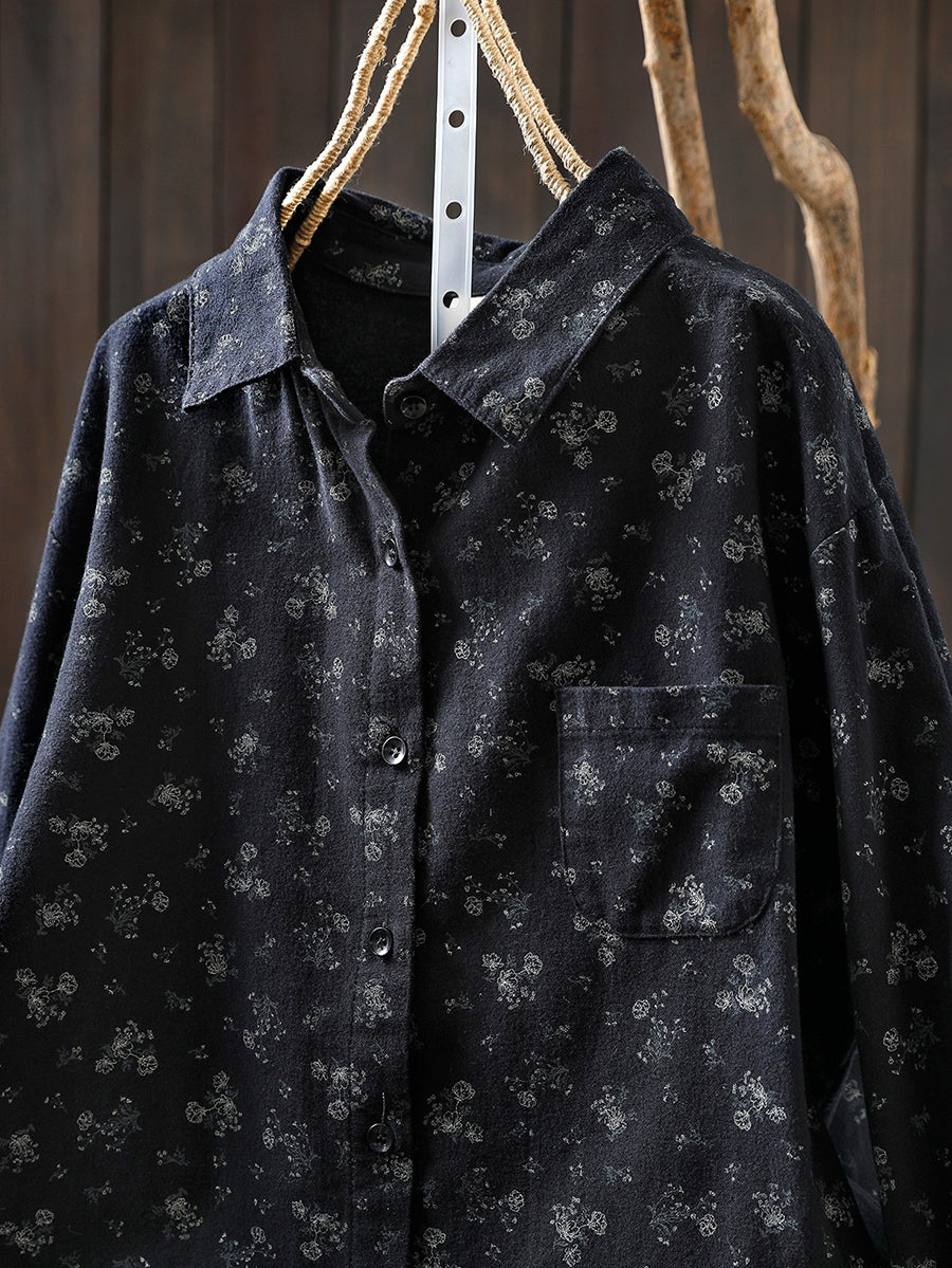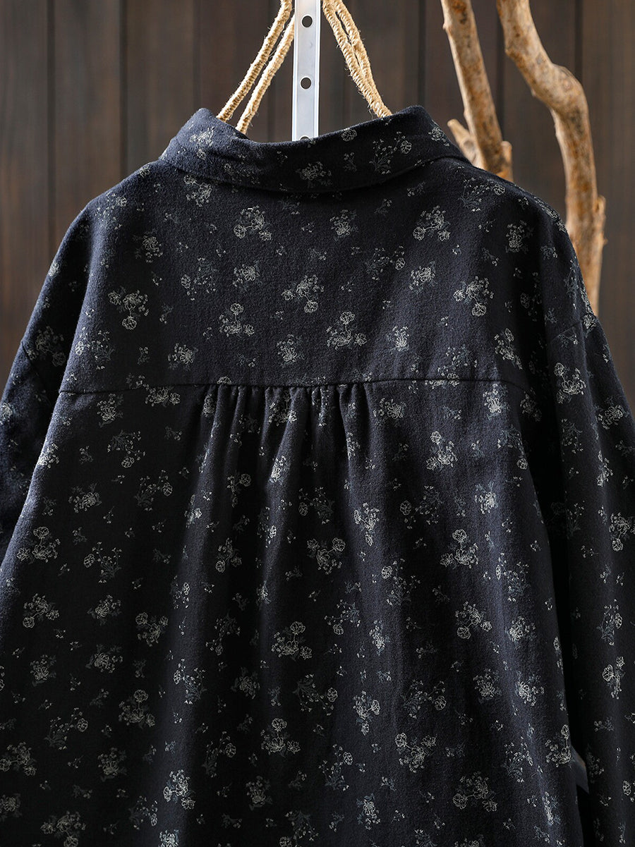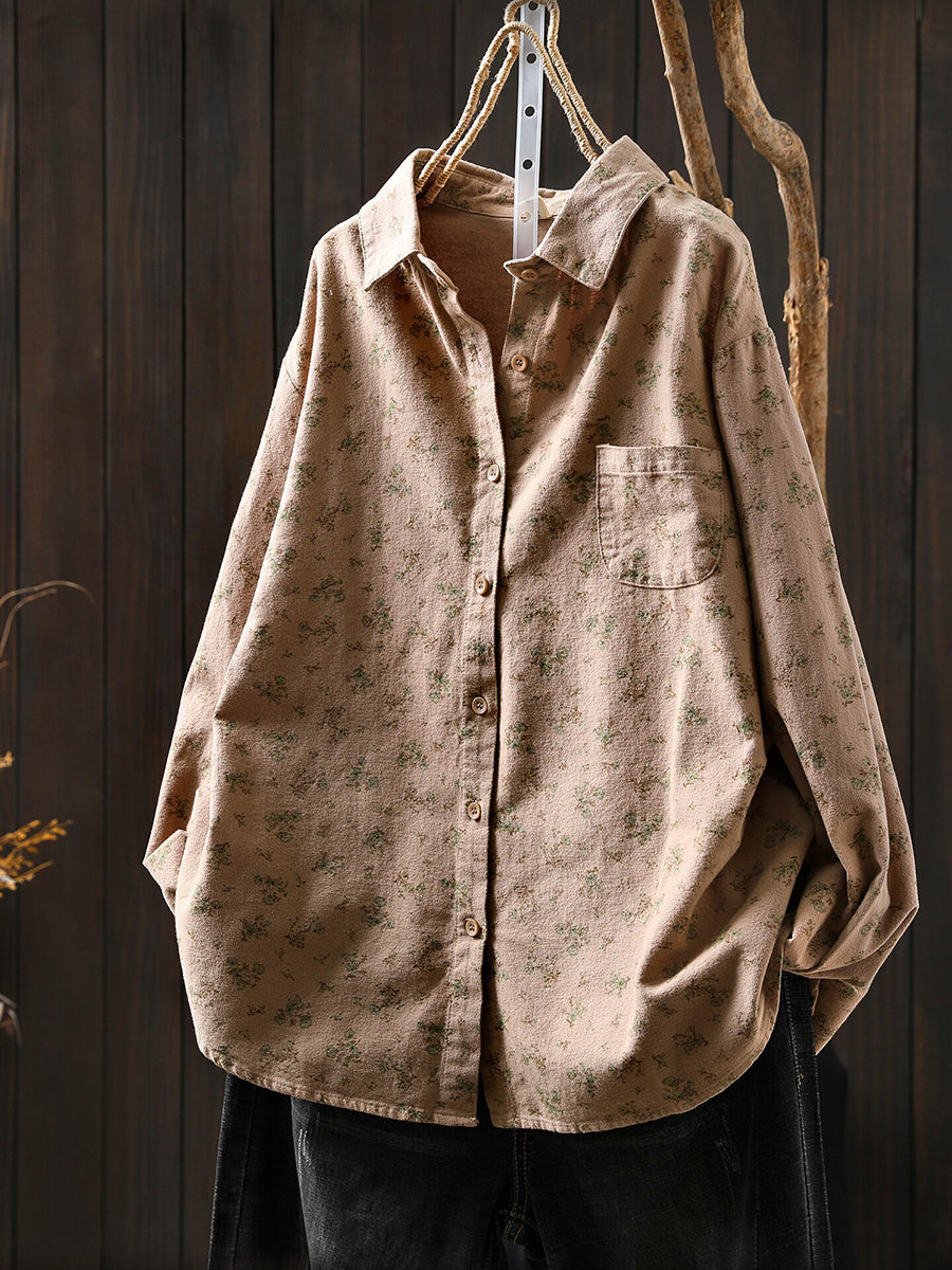 Damesblouse van katoen met bloemenprint en omgeslagen kraag, in artistieke herfststijl.