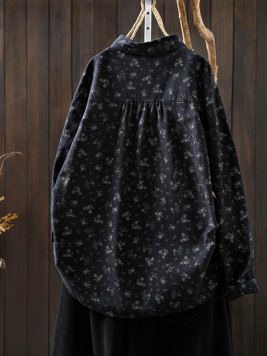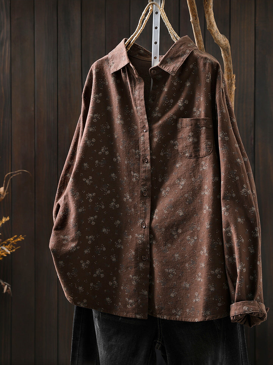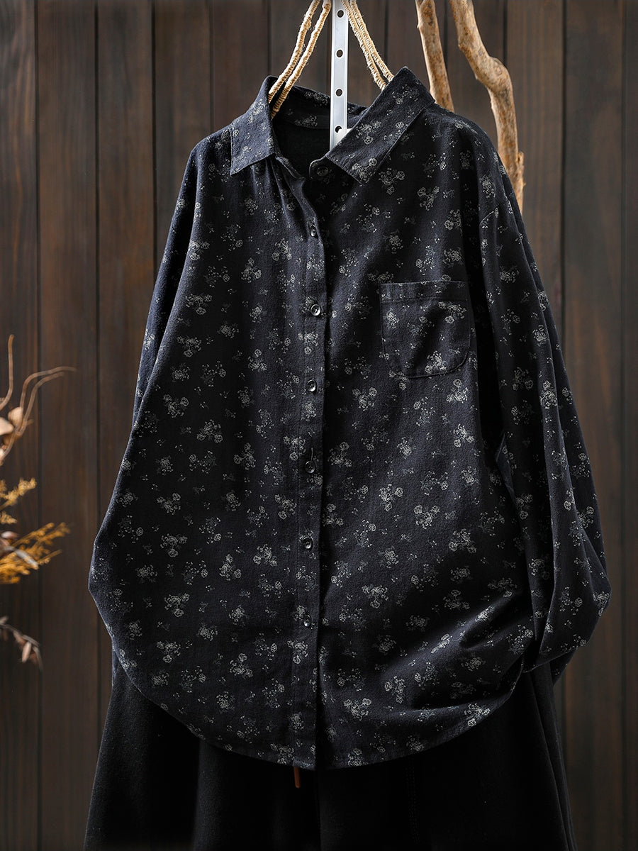 Damesblouse van katoen met bloemenprint en omgeslagen kraag, in artistieke herfststijl.