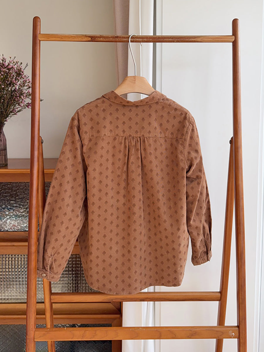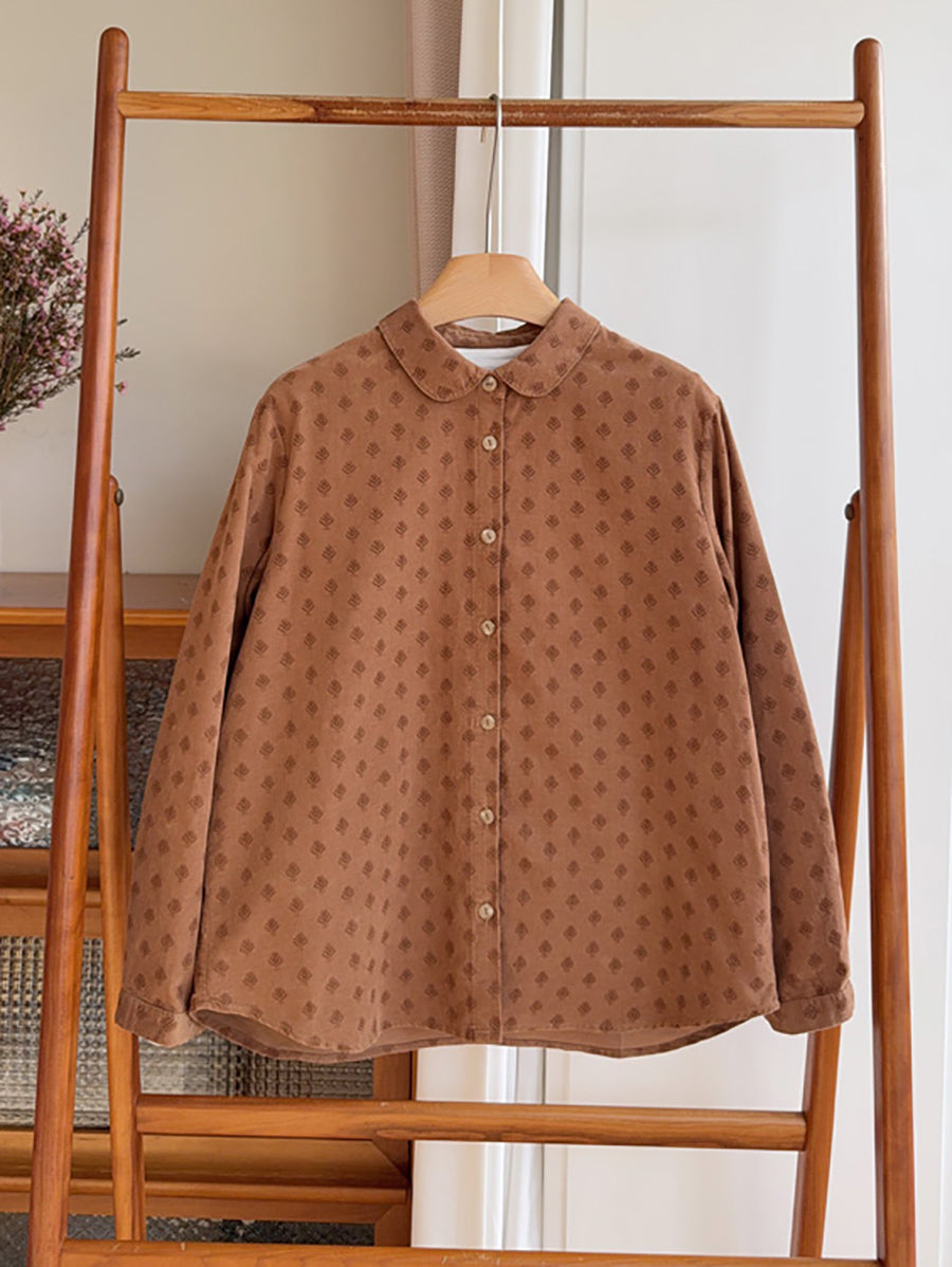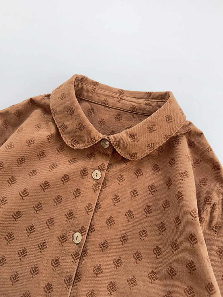 Dameshemd met artistieke herfstprint en stippen, gemaakt van corduroy met omgeslagen kraag.