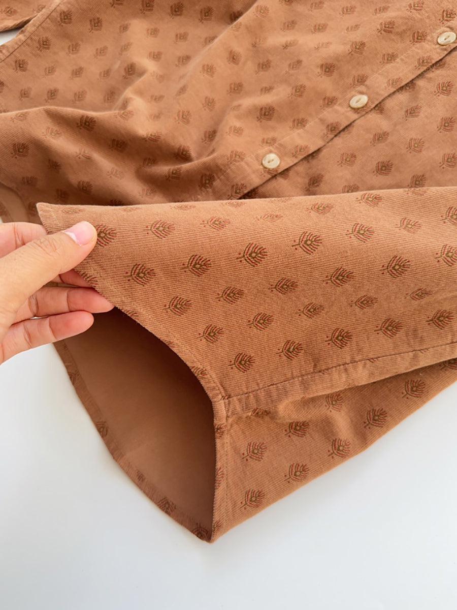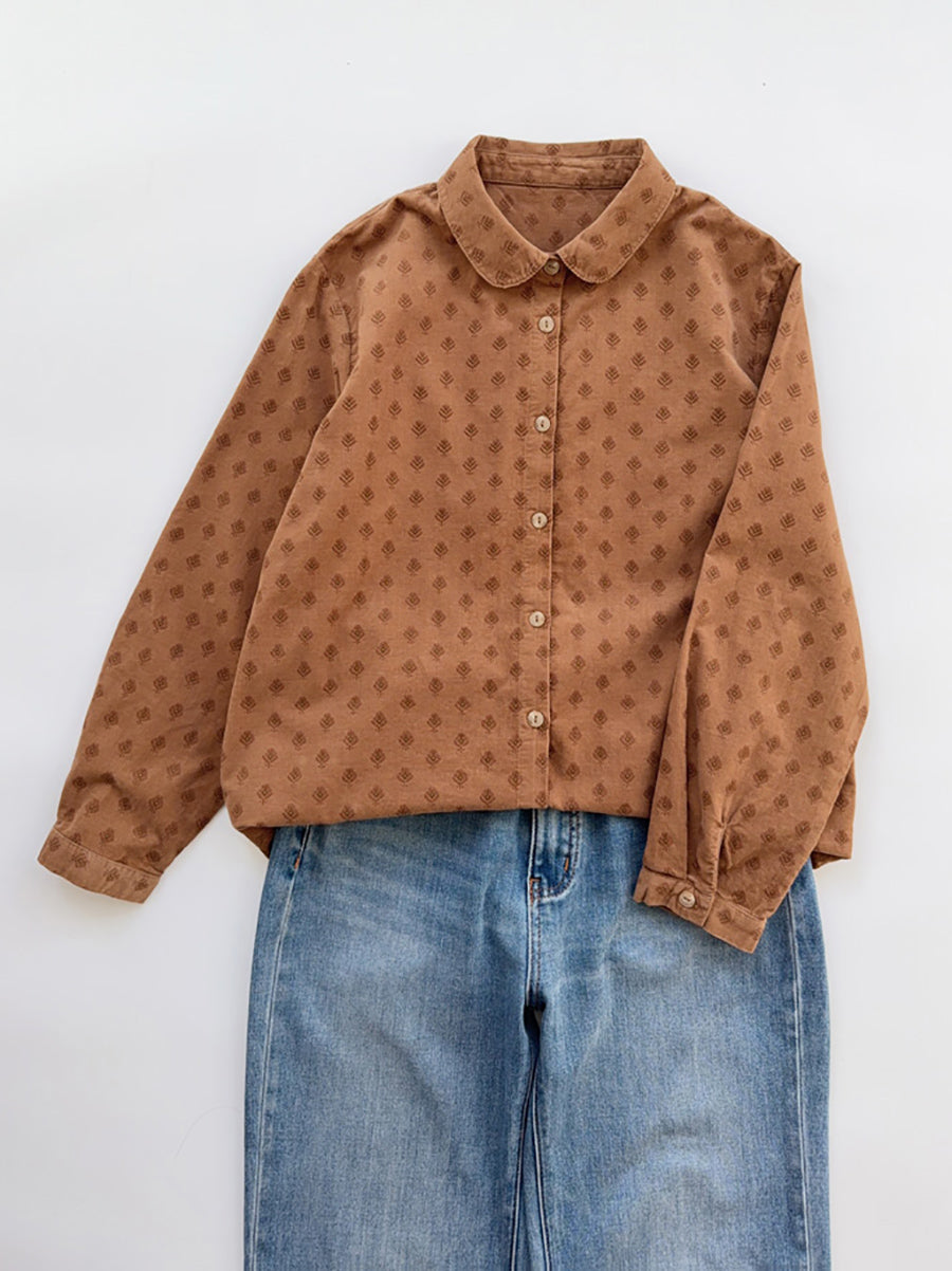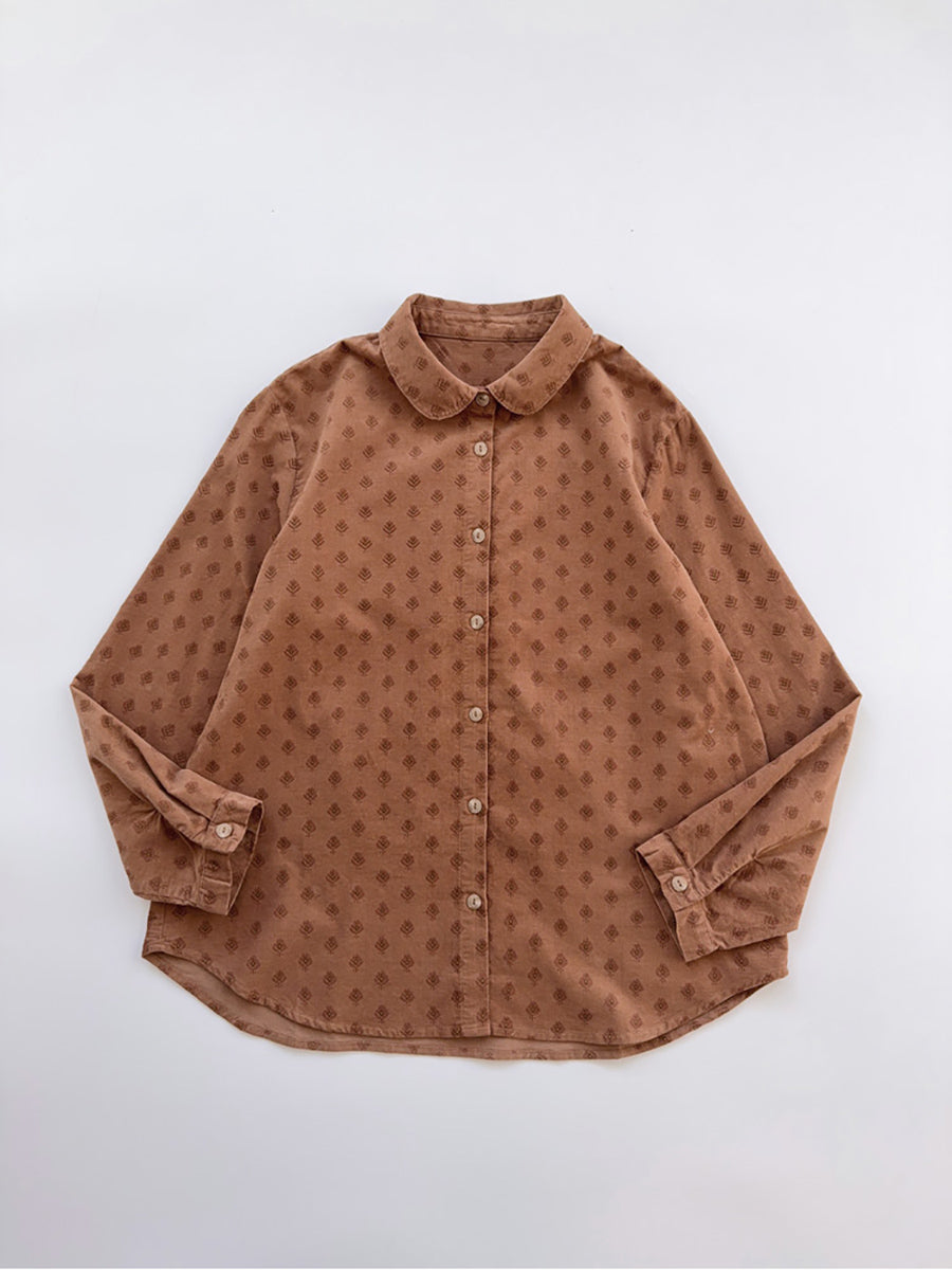 Dameshemd met artistieke herfstprint en stippen, gemaakt van corduroy met omgeslagen kraag.