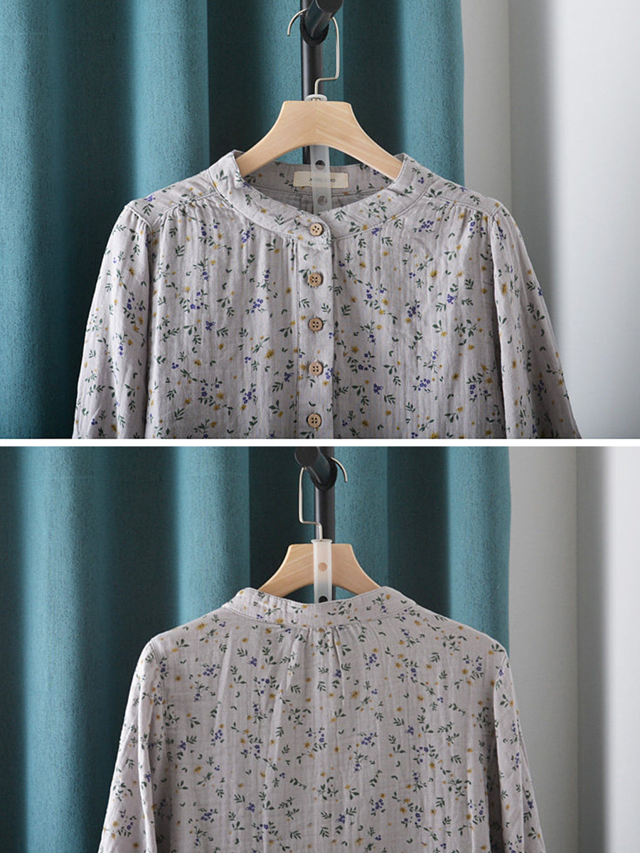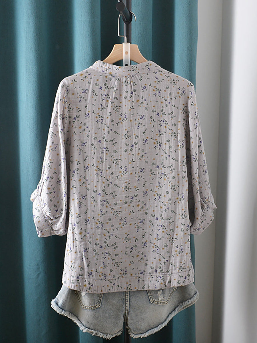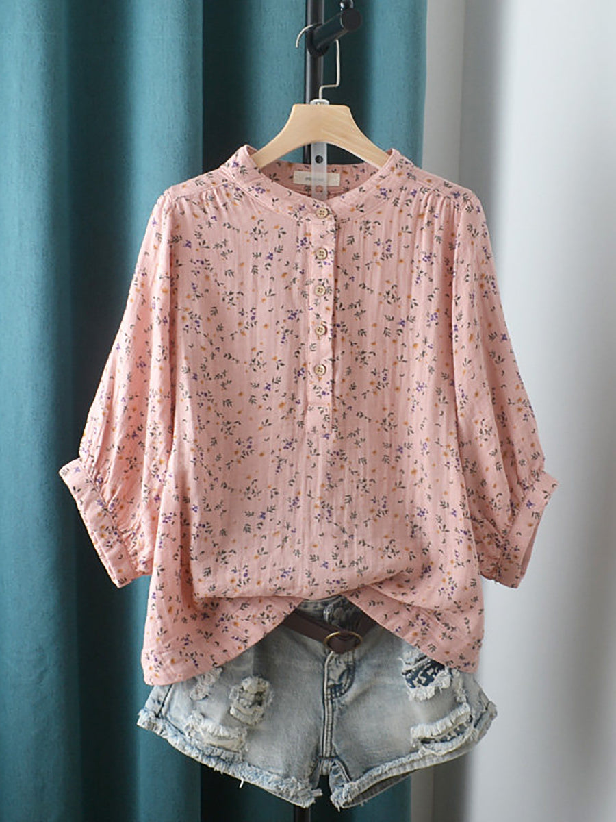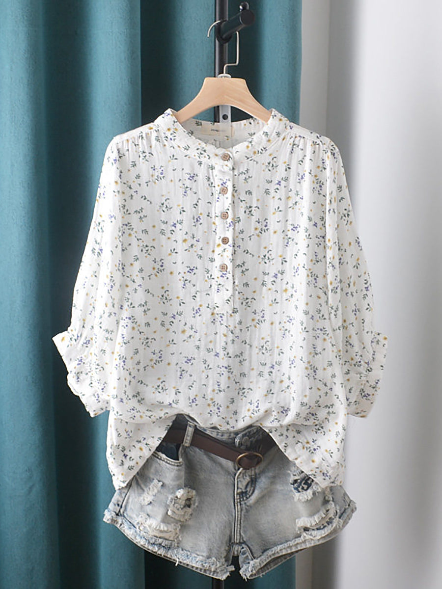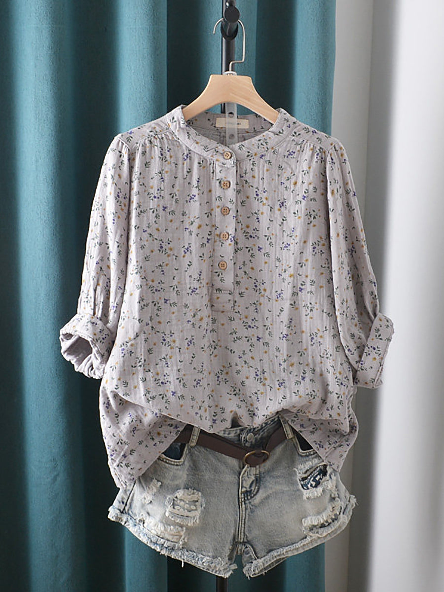 Dames zomerblouse met artistieke bloemenprint, 100% katoen en opstaande kraag.