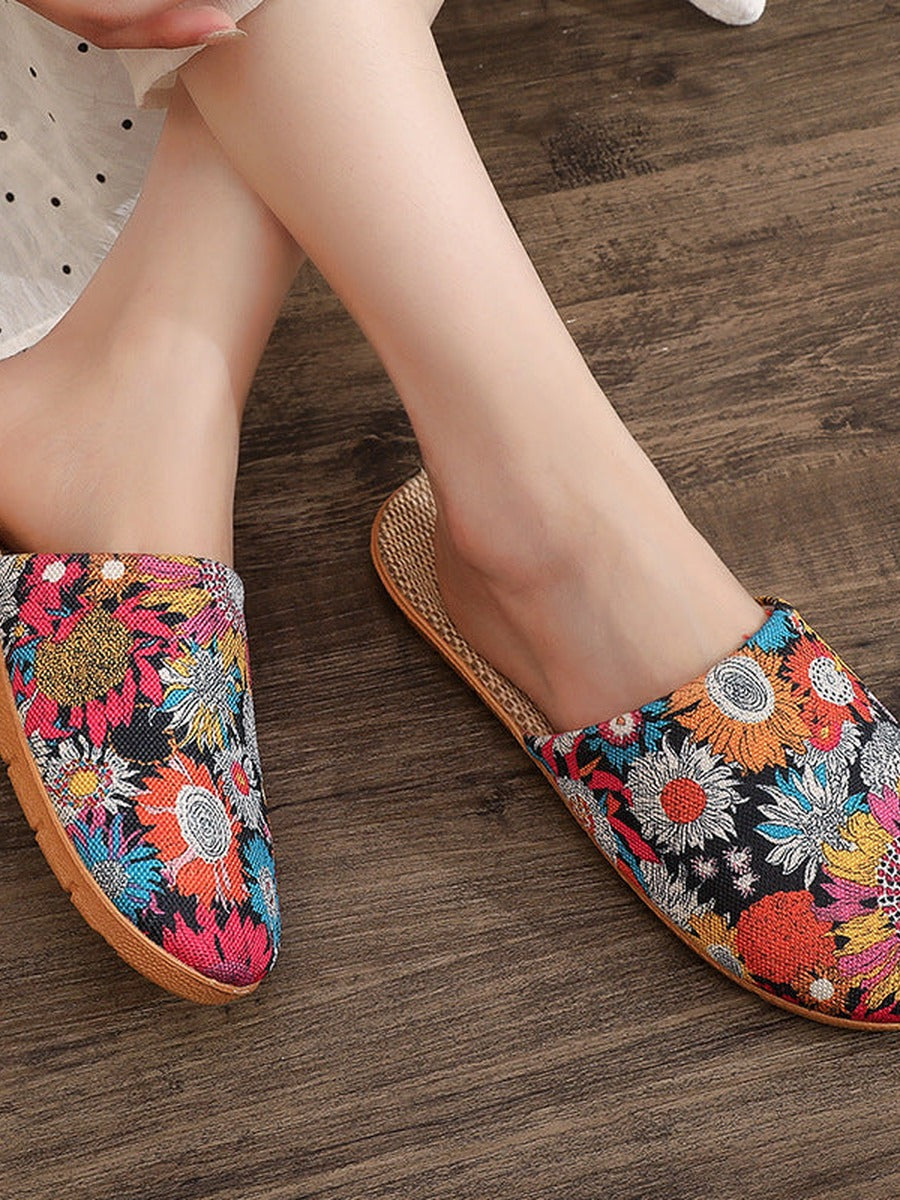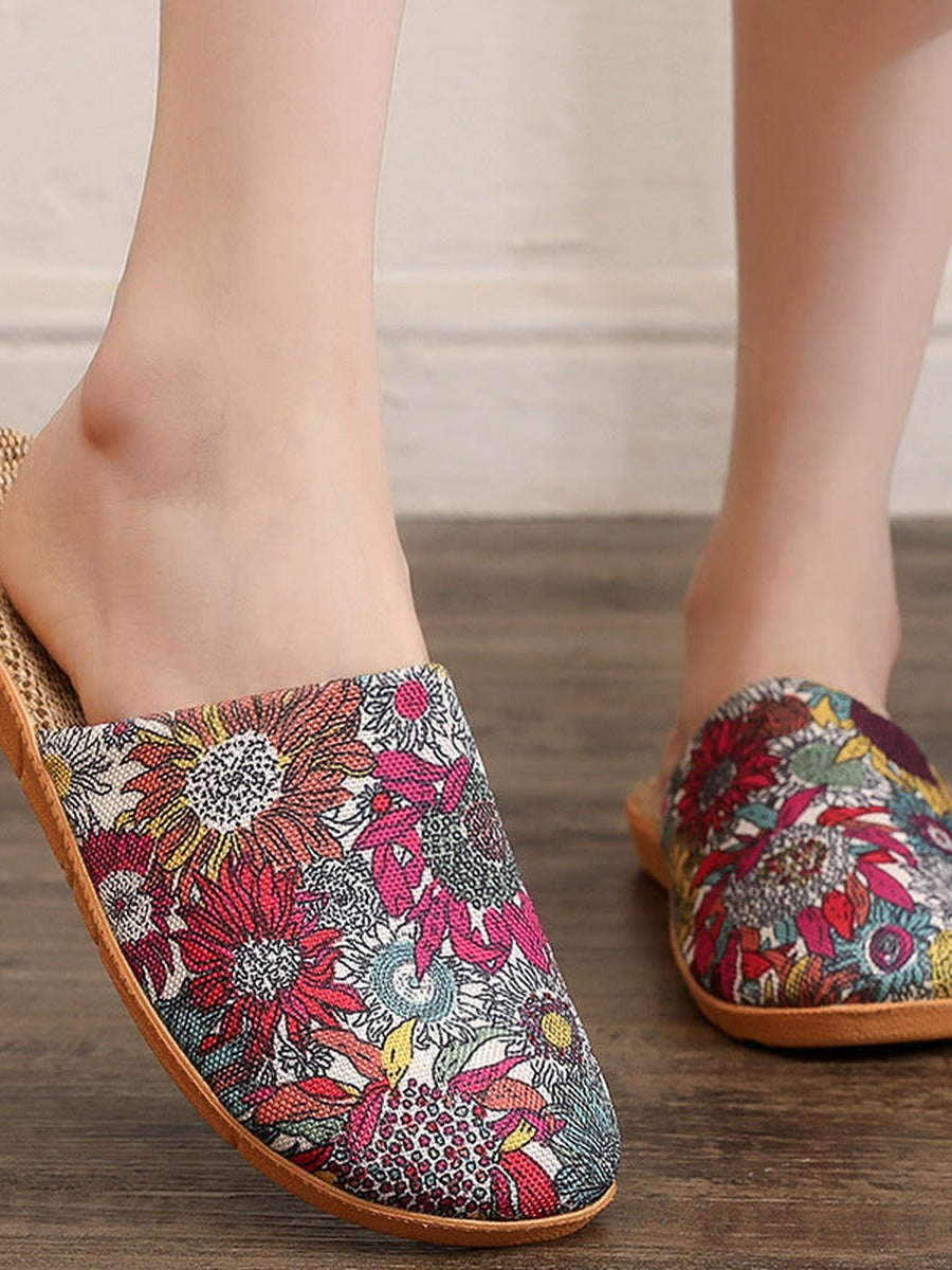 Dames zomerslippers met bloemenprint van linnen en open tenen