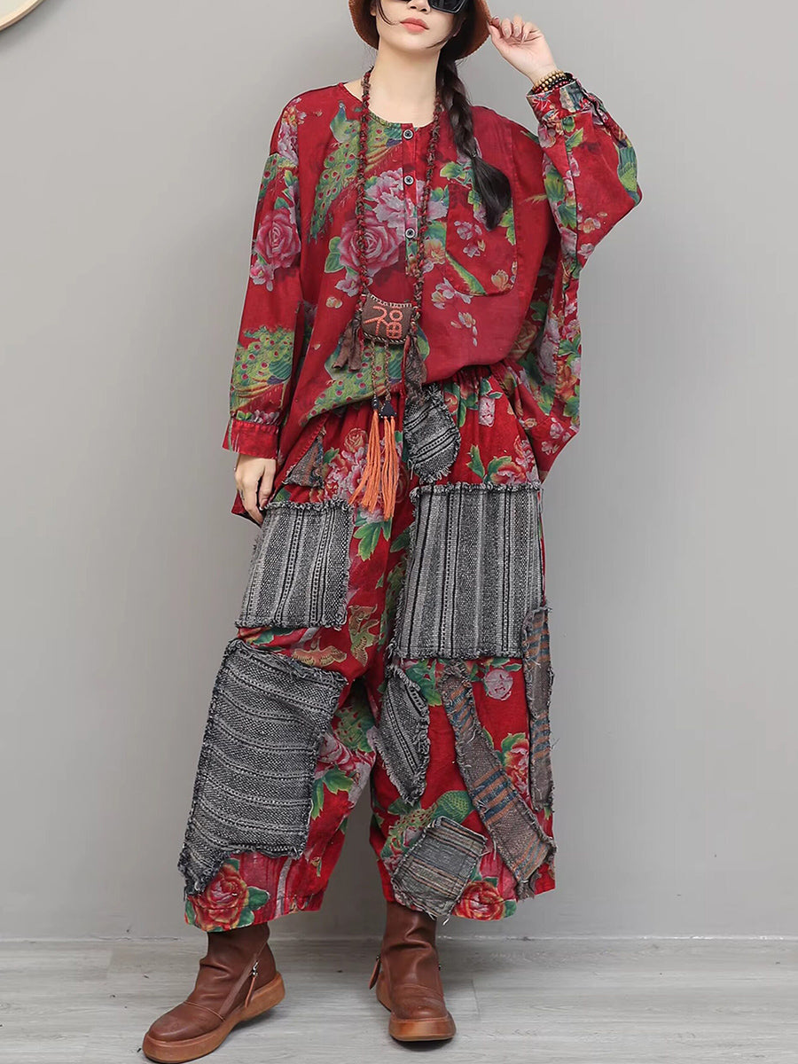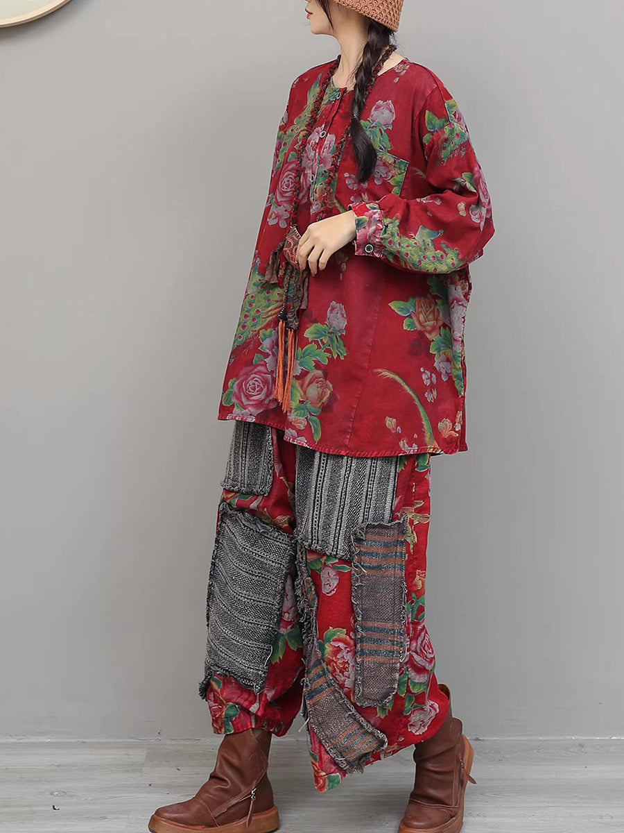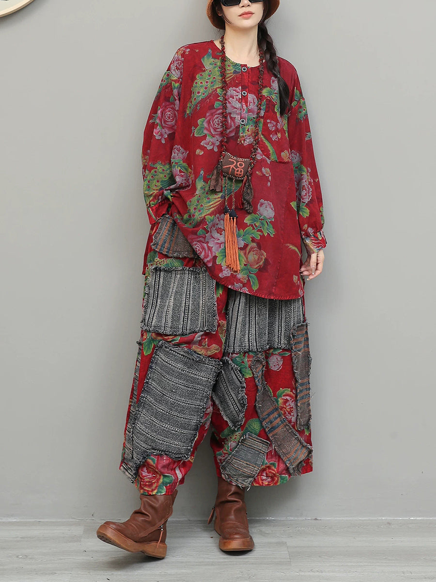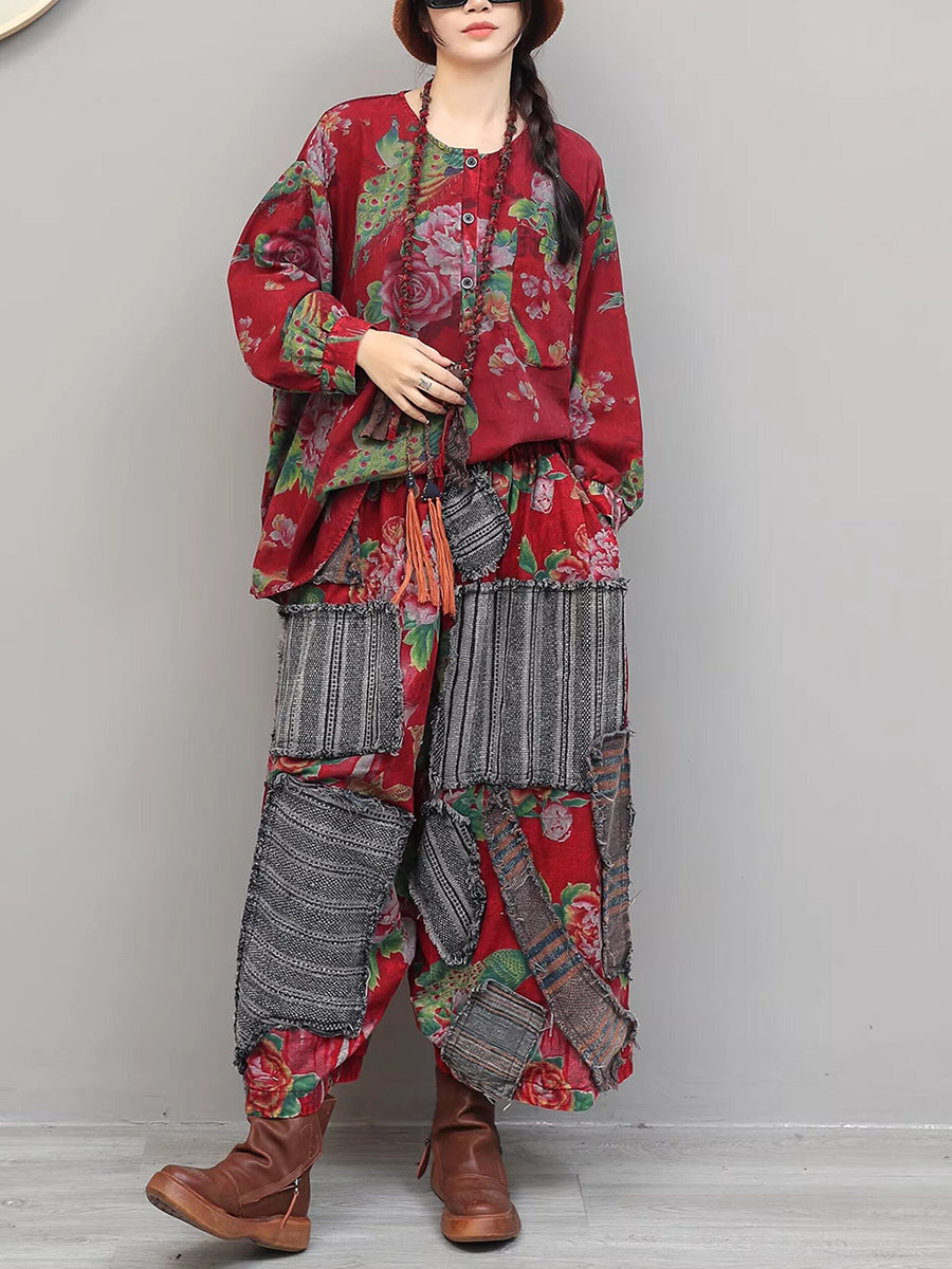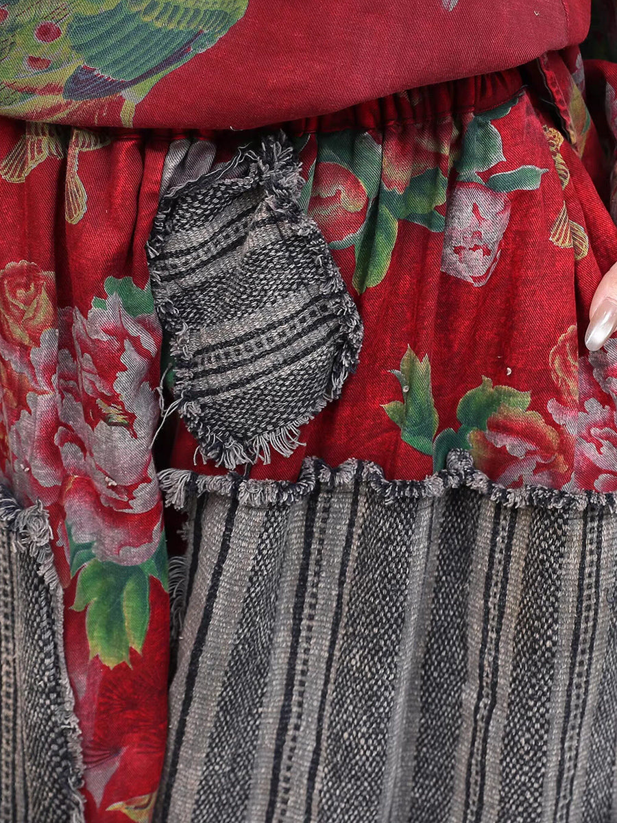 Dame vårdress med vintage blomstermønster og lappeteppe og O-hals