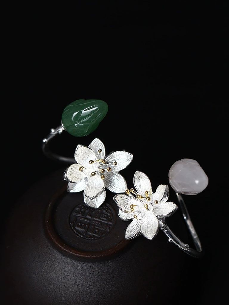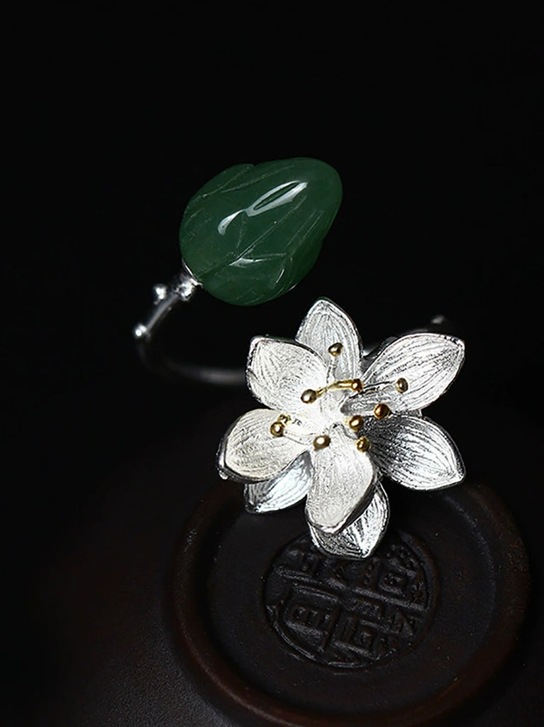 Pierścień damski regulowany z jadeitu lotosu ze srebra S925