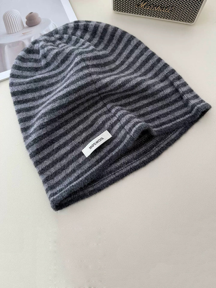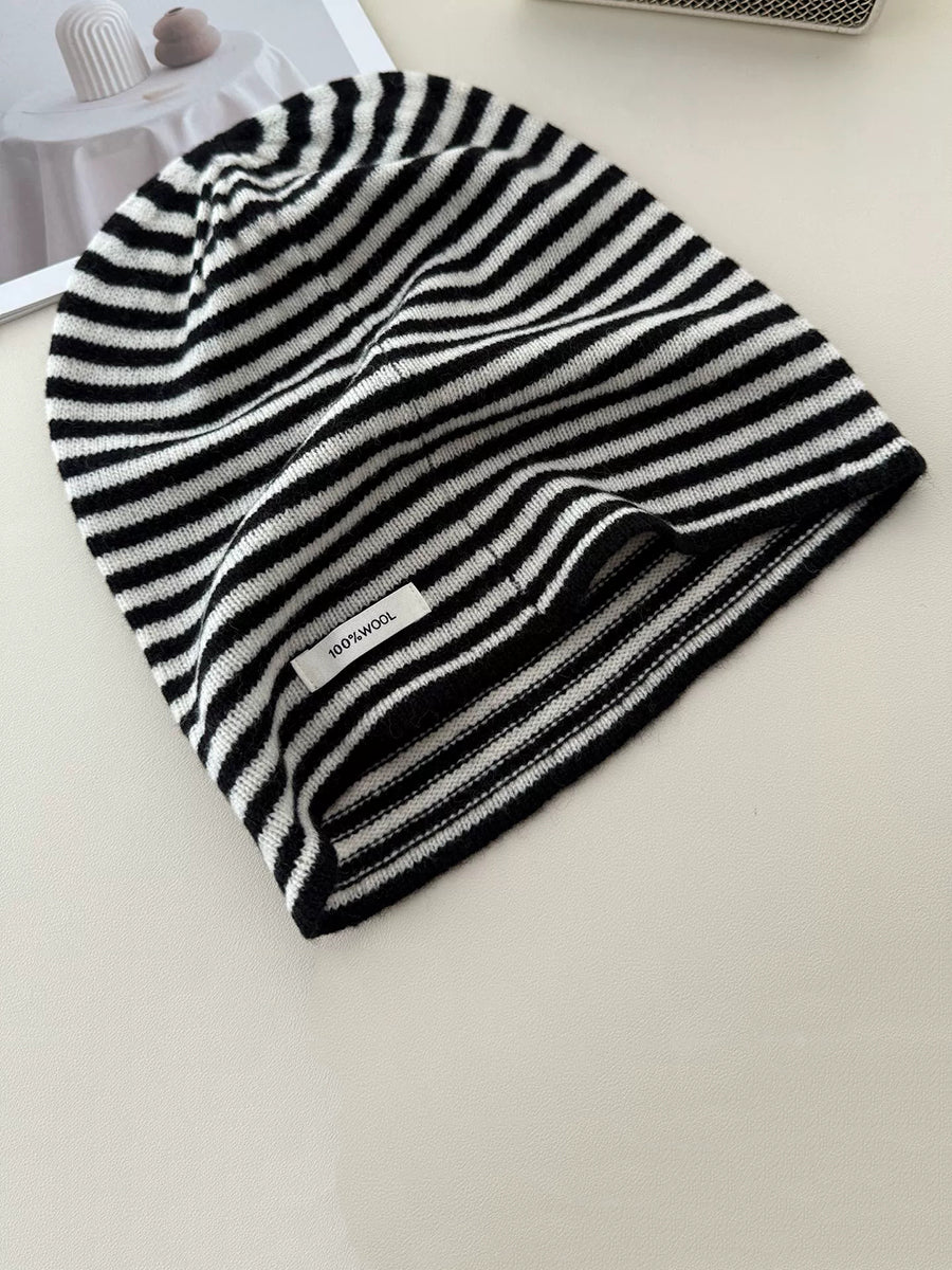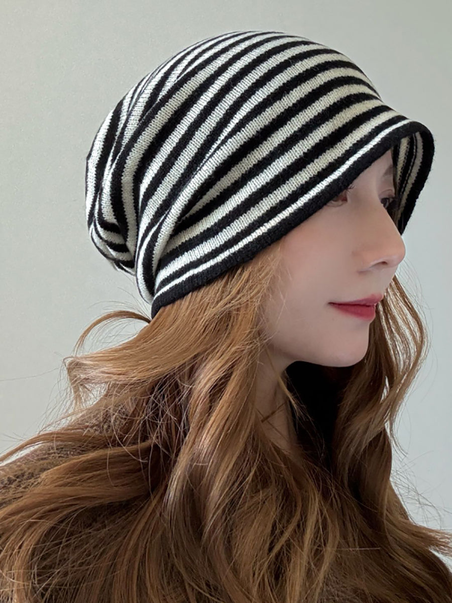 Damska, swobodna, dzianinowa czapka w paski, 100% wełna