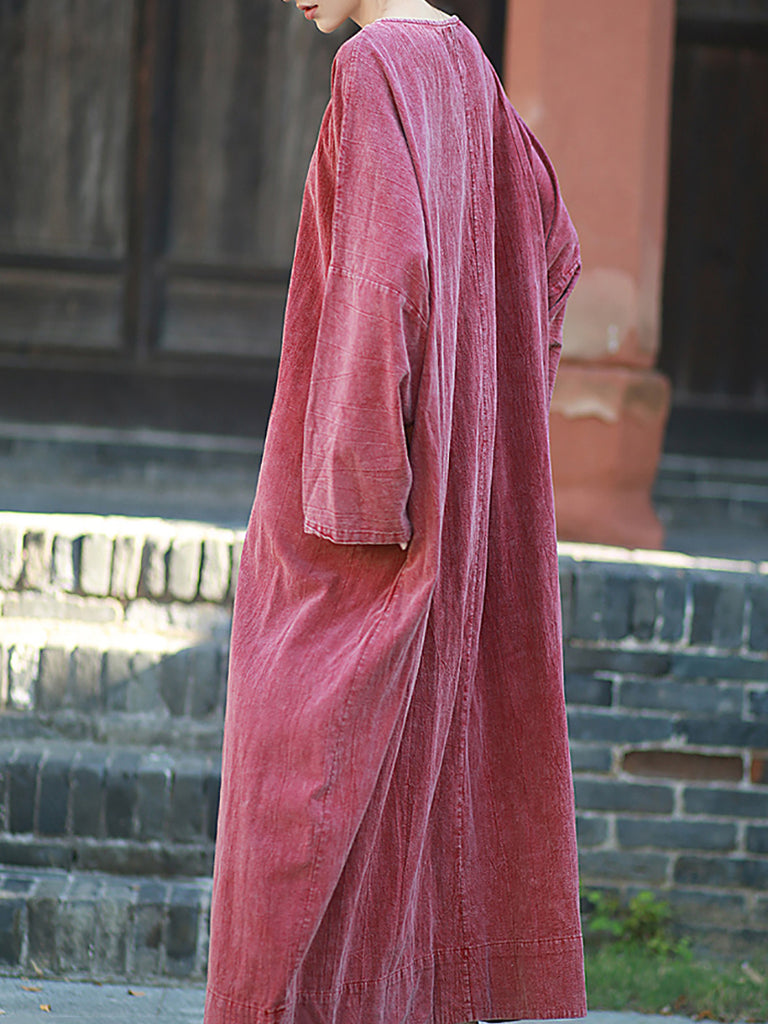 Sukienka damska jesienna w stylu retro z okrągłym dekoltem z bawełny i lnu w jednolitym kolorze