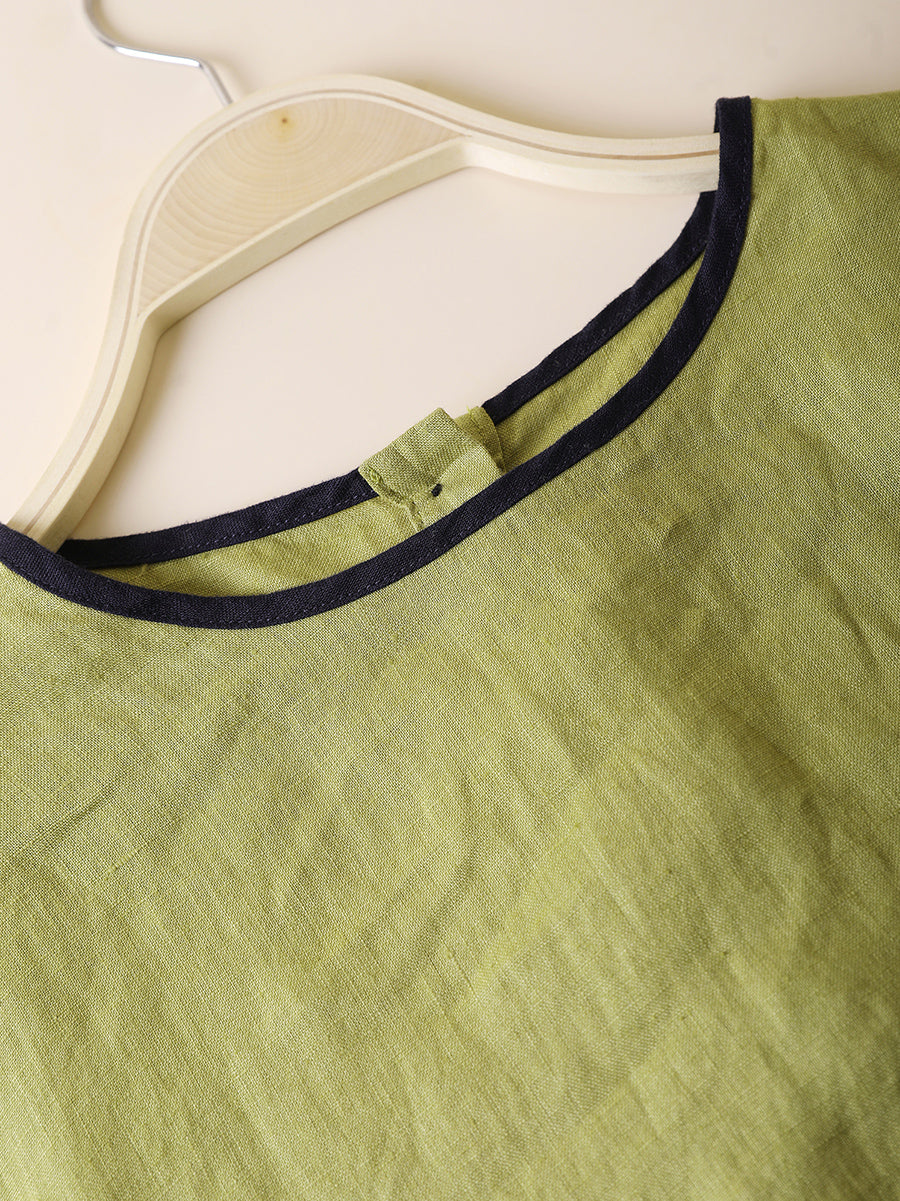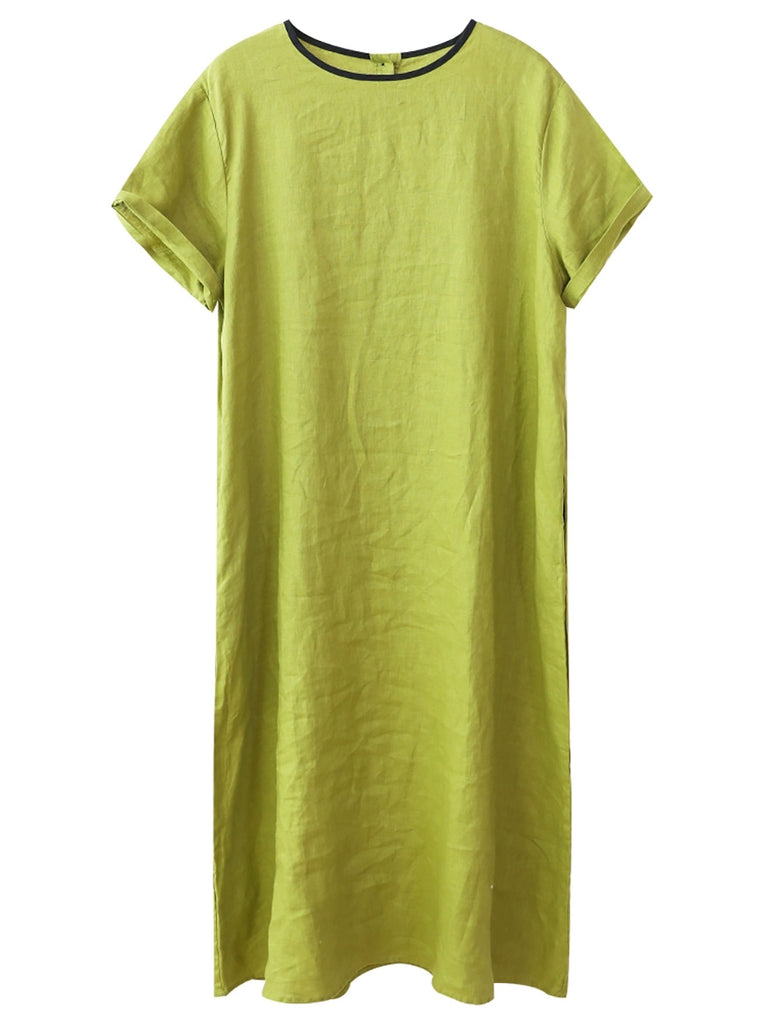 Damska letnia, swobodna, jednokolorowa sukienka z okrągłym dekoltem, wykonana w 100% z lnu