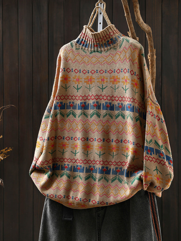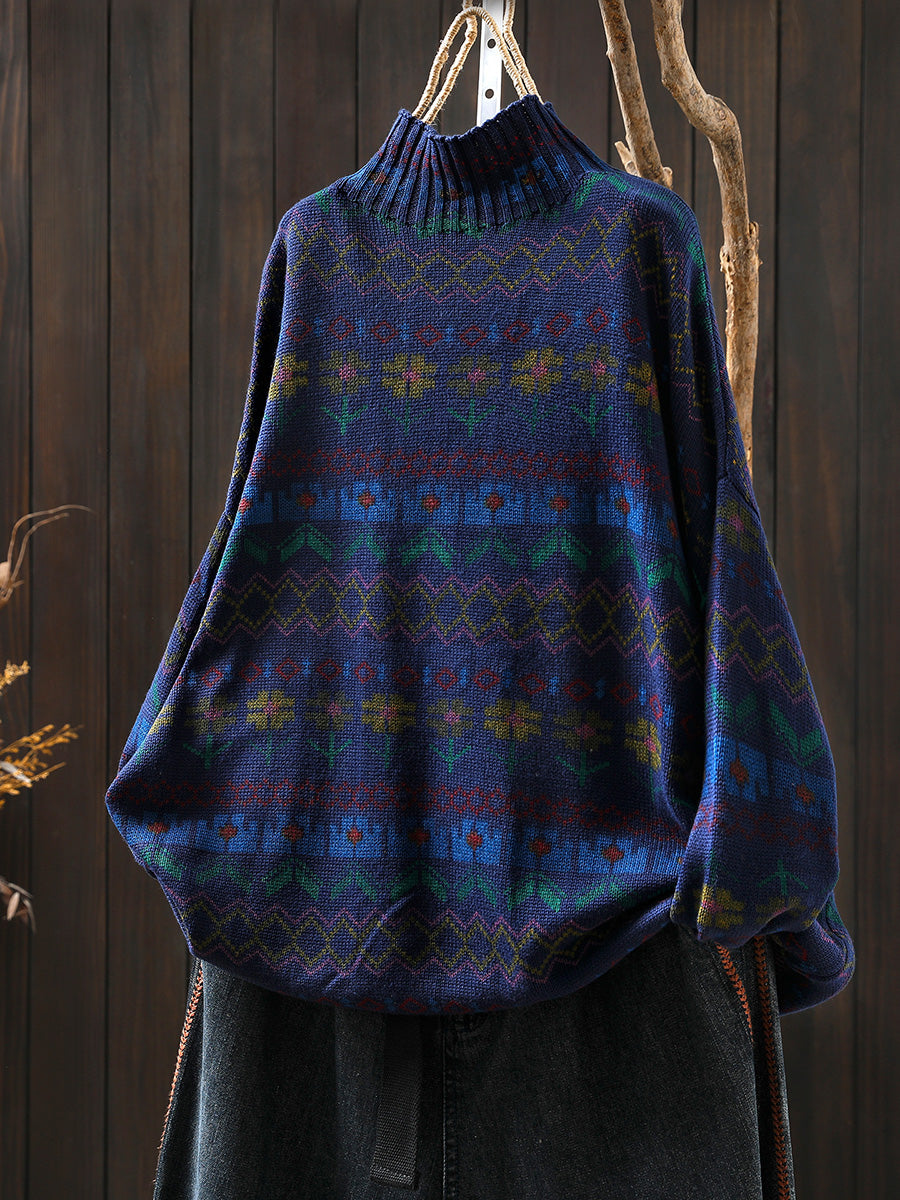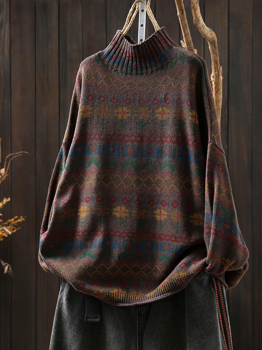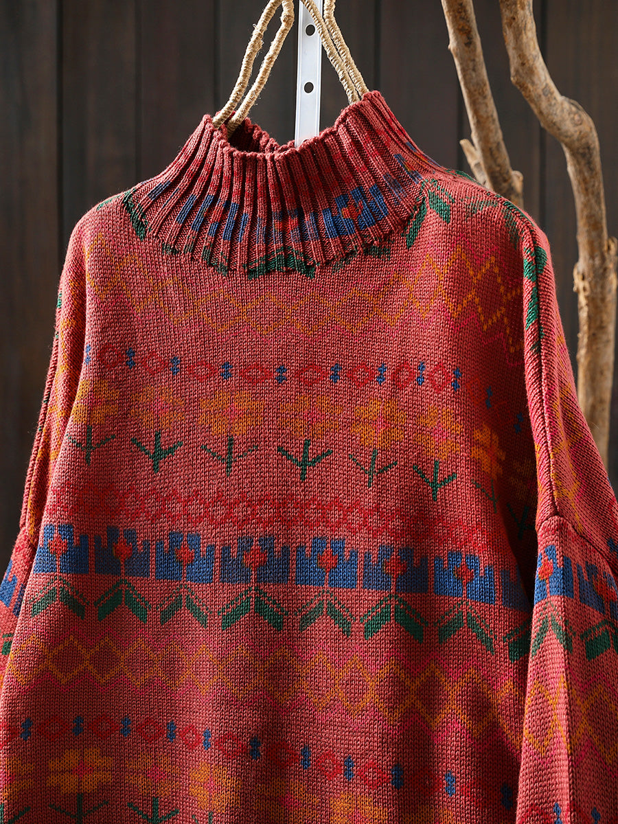 Damski jesienny sweter z półgolfem w kwiaty i artystyczne wzory