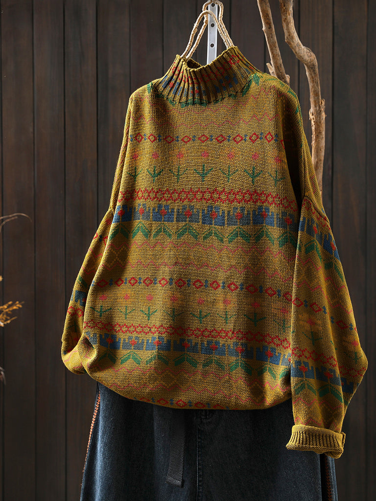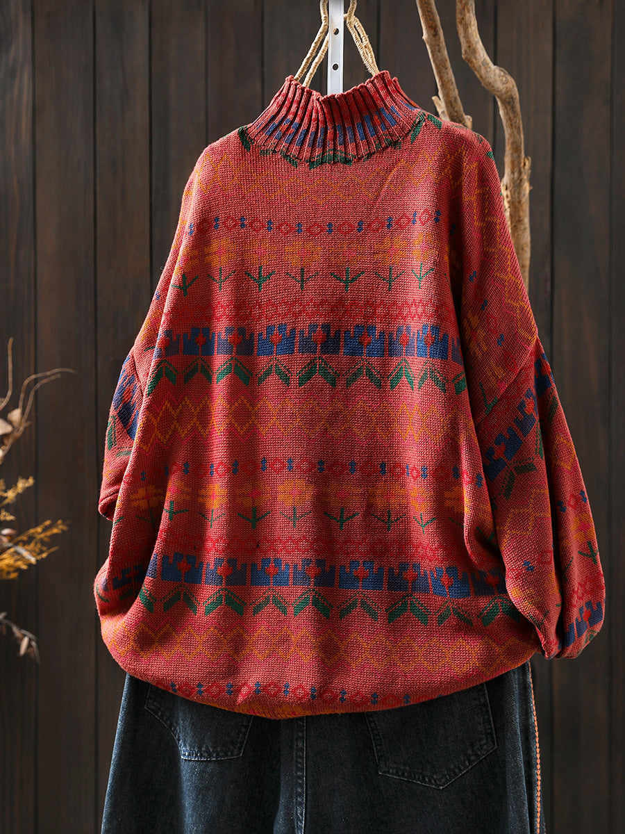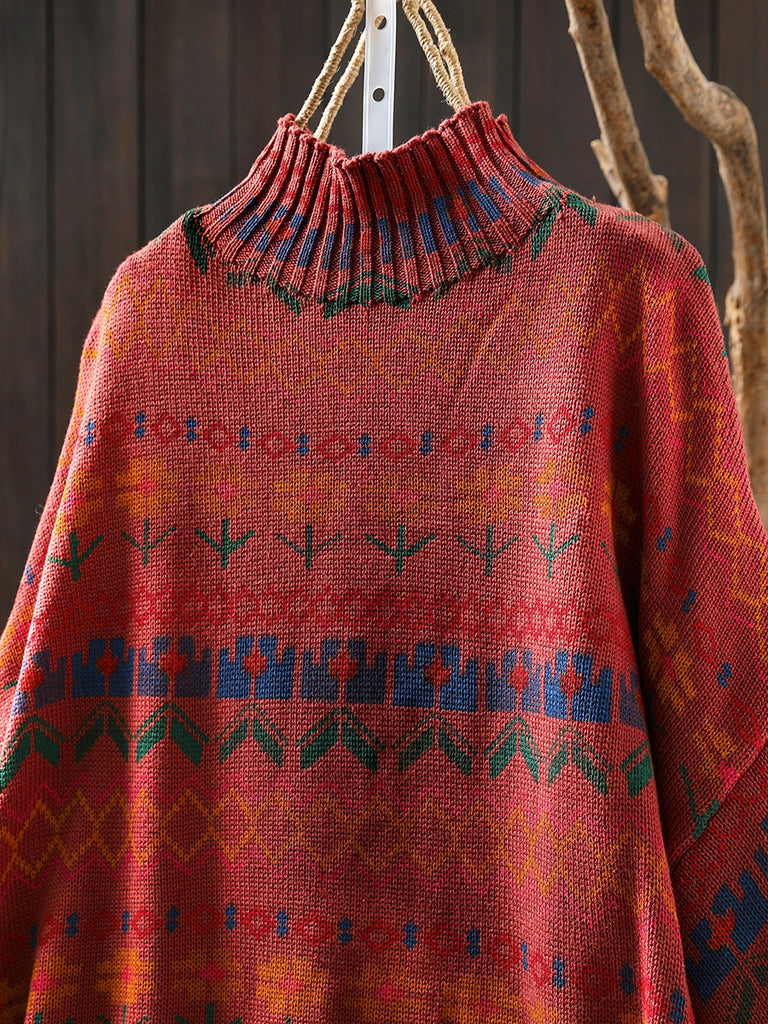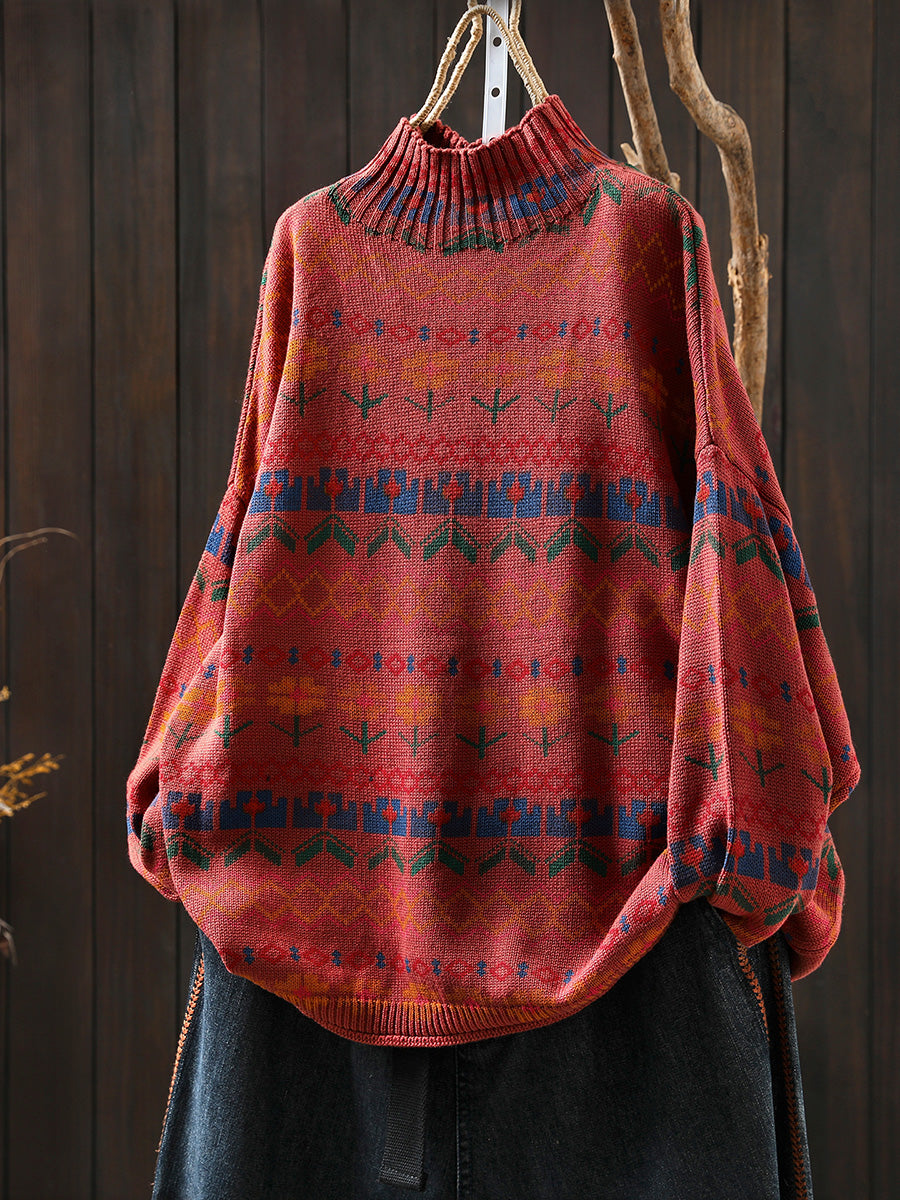 Damski jesienny sweter z półgolfem w kwiaty i artystyczne wzory