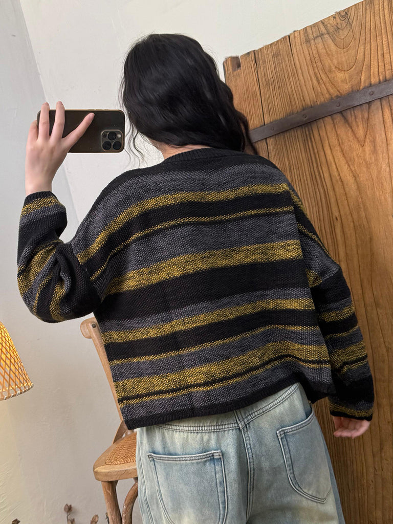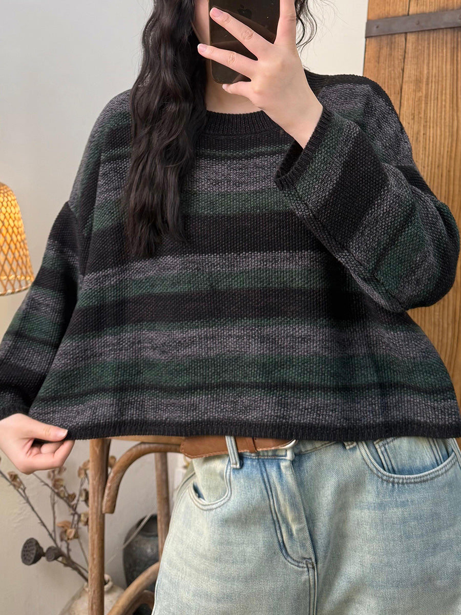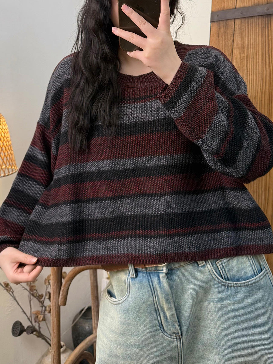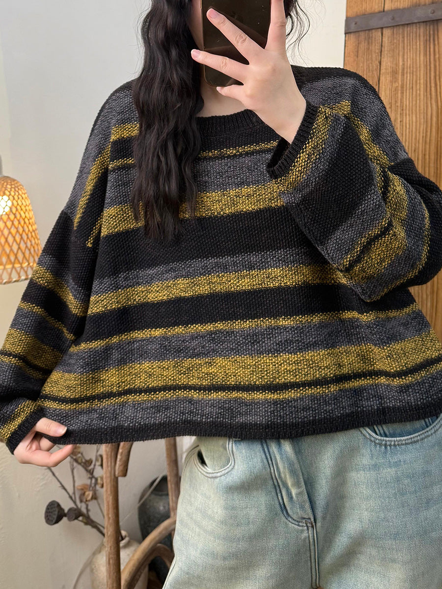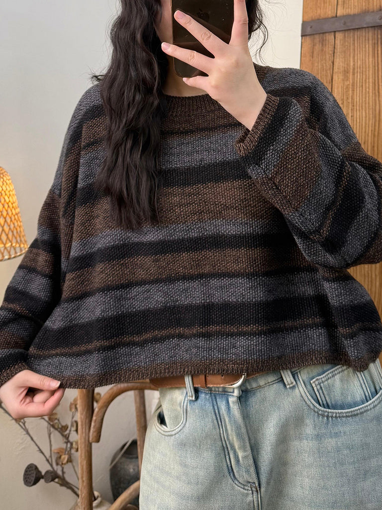 Damski jesienny sweter w paski w stylu retro z okrągłym dekoltem