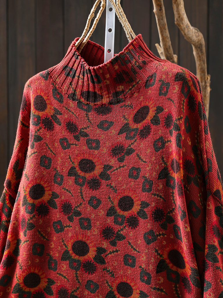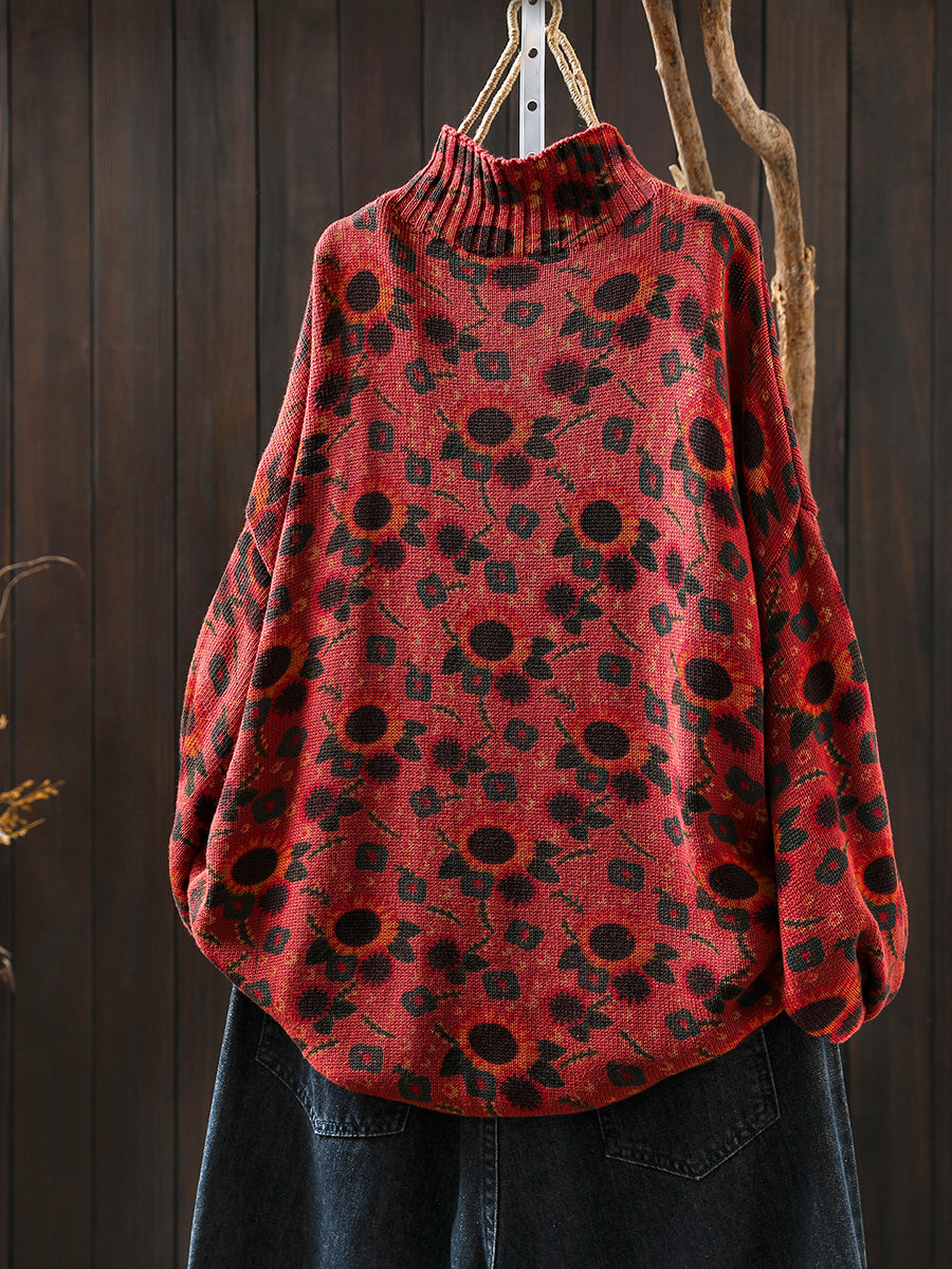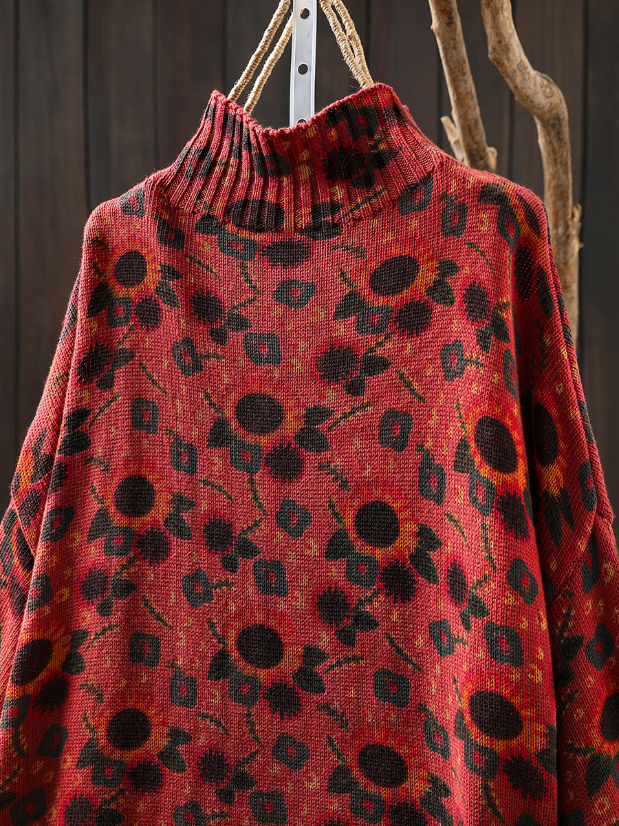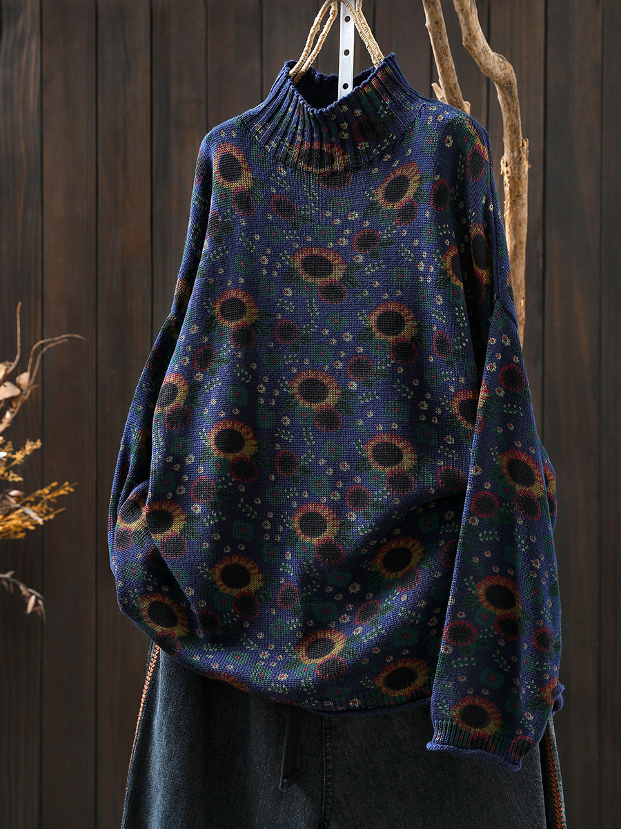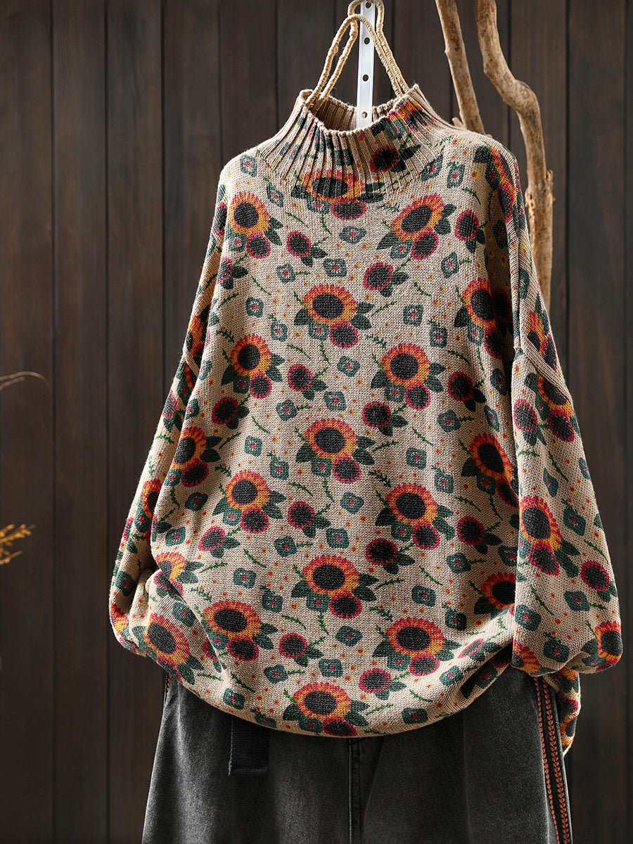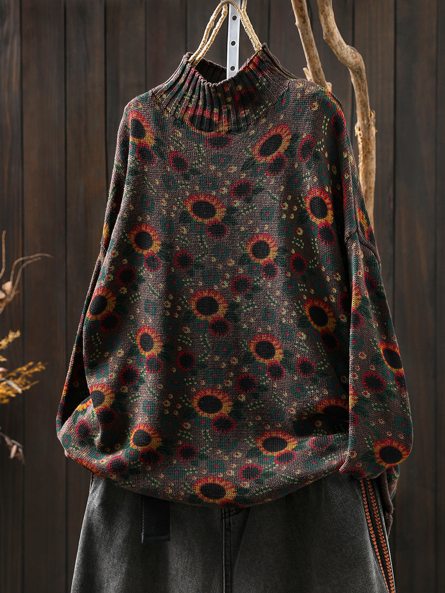 Damski jesienny sweter z półgolfem w słoneczniki