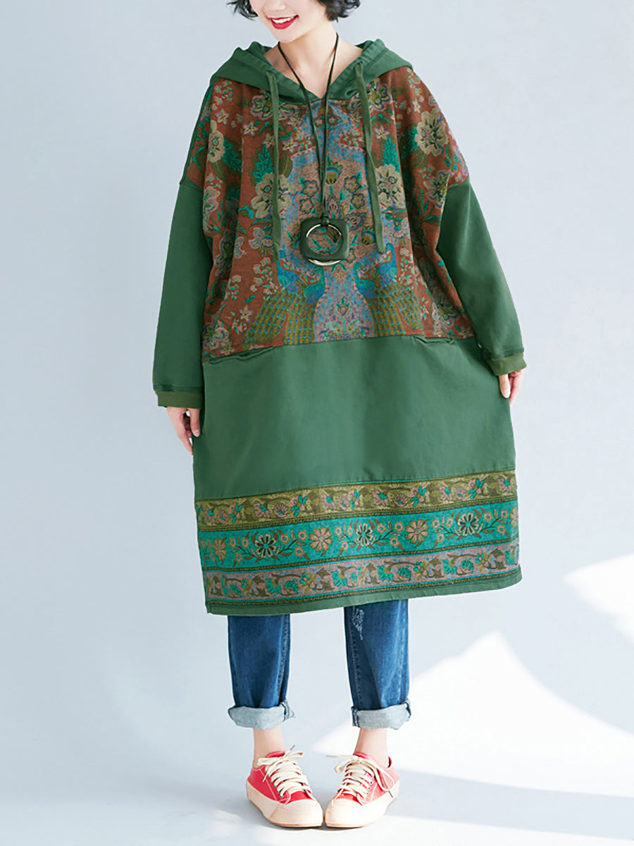 Damska sukienka z długim kapturem i kieszeniami w etnicznym stylu z kwiatowym wzorem