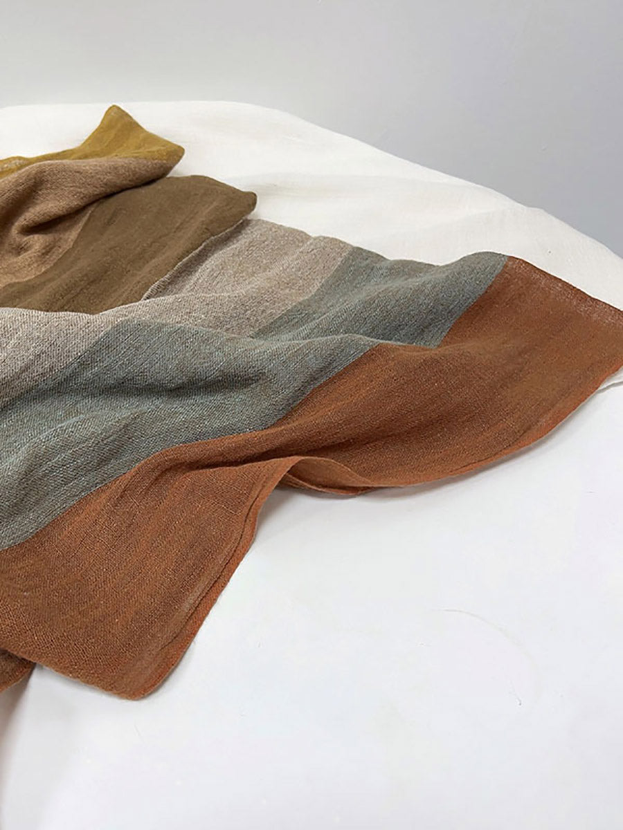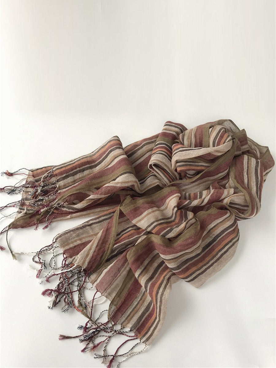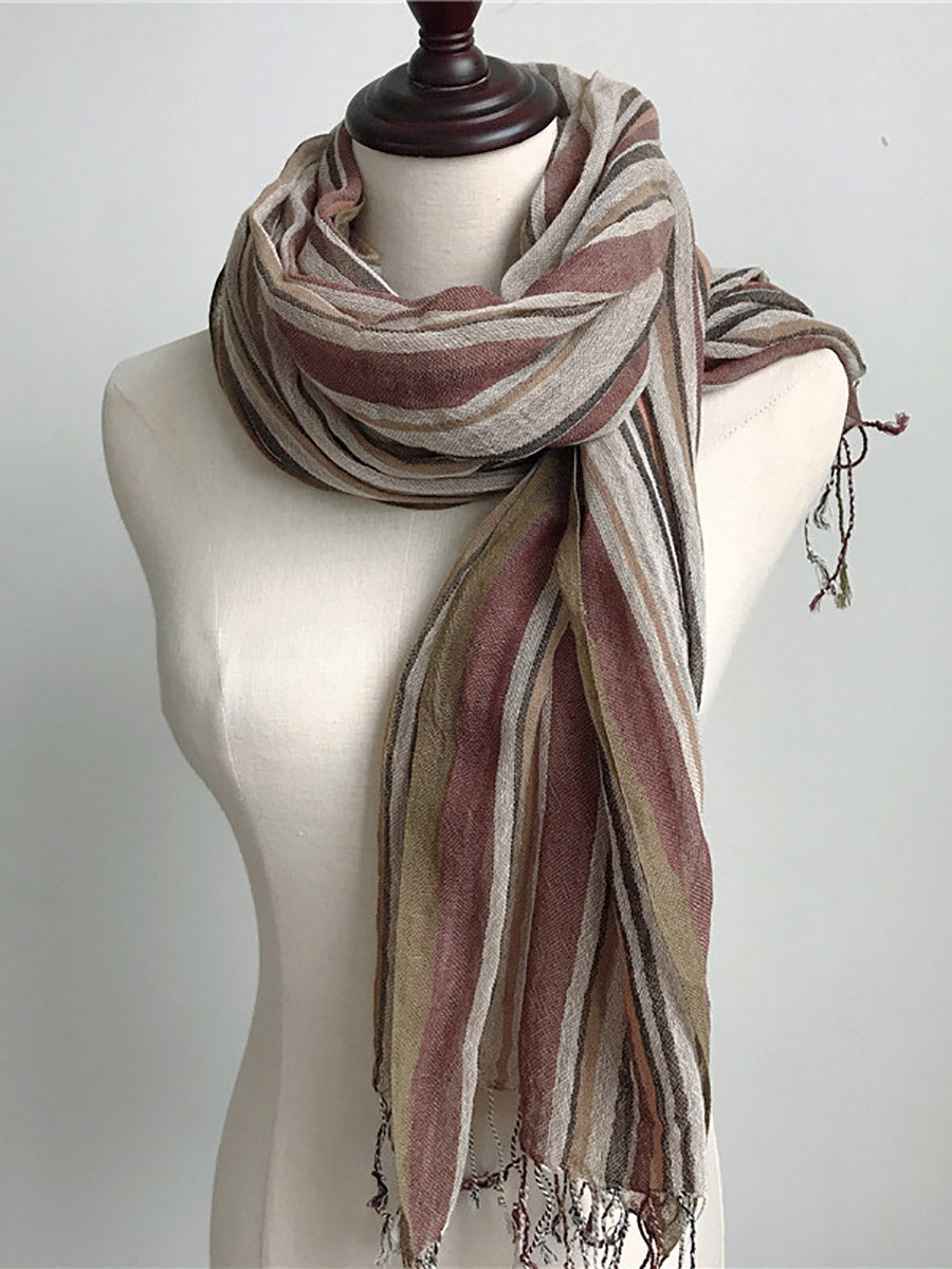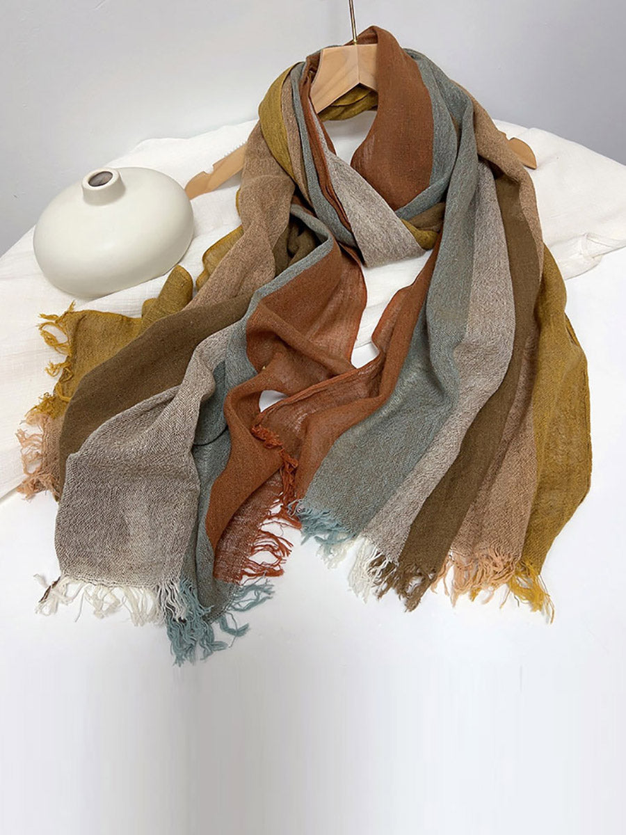 Damski szalik w paski w stylu vintage z kolorowymi blokami i frędzlami z bawełny i lnu