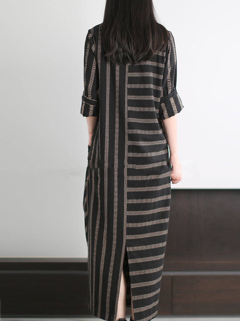 Sukienka lniana z bawełny w paski i dekoltem w serek, jesienna, damska, retro
