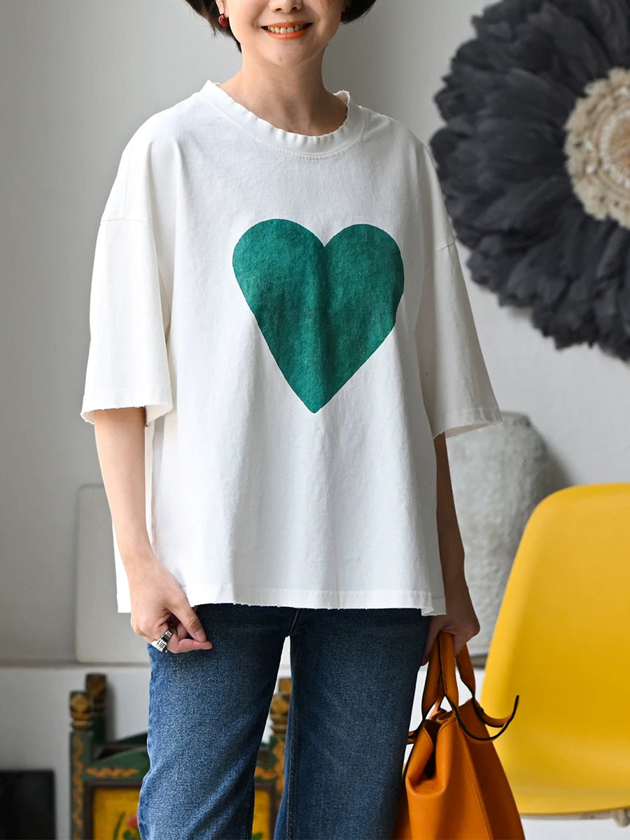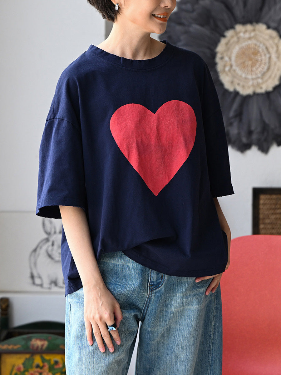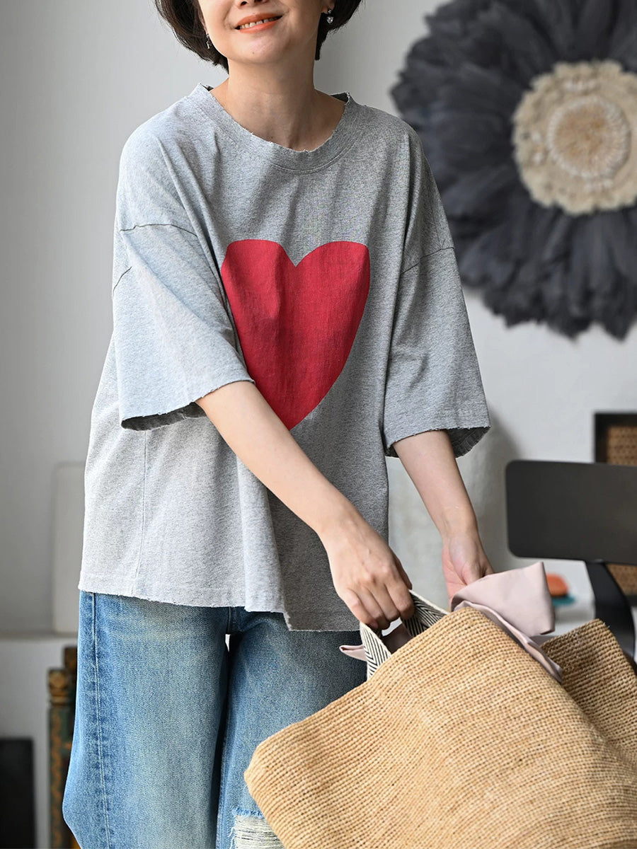 Damska letnia, swobodna koszulka z okrągłym dekoltem w kształcie serca, 100% bawełny