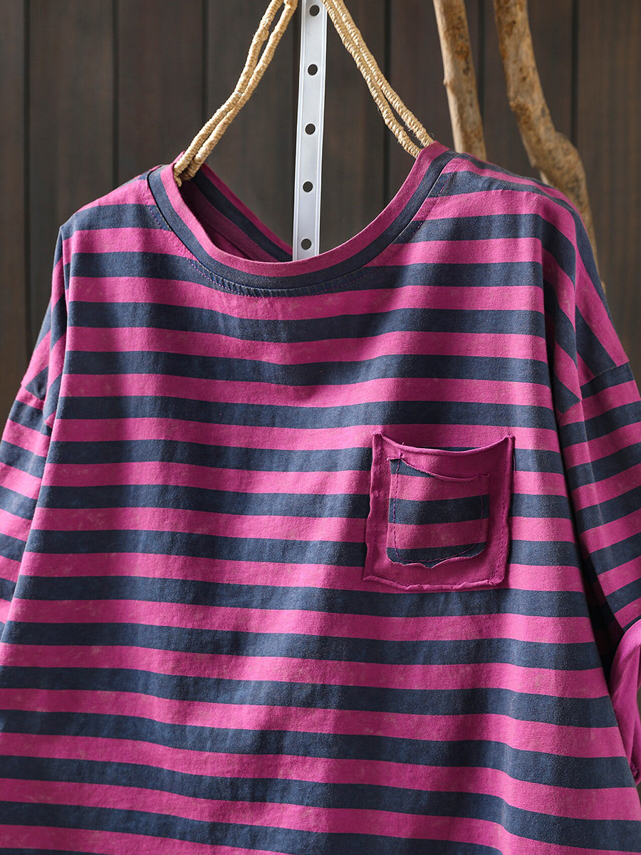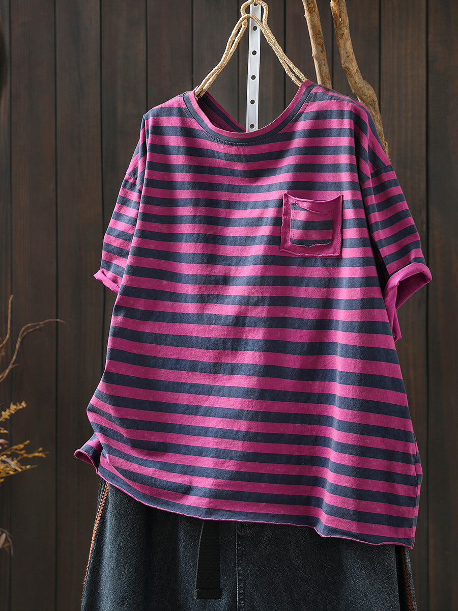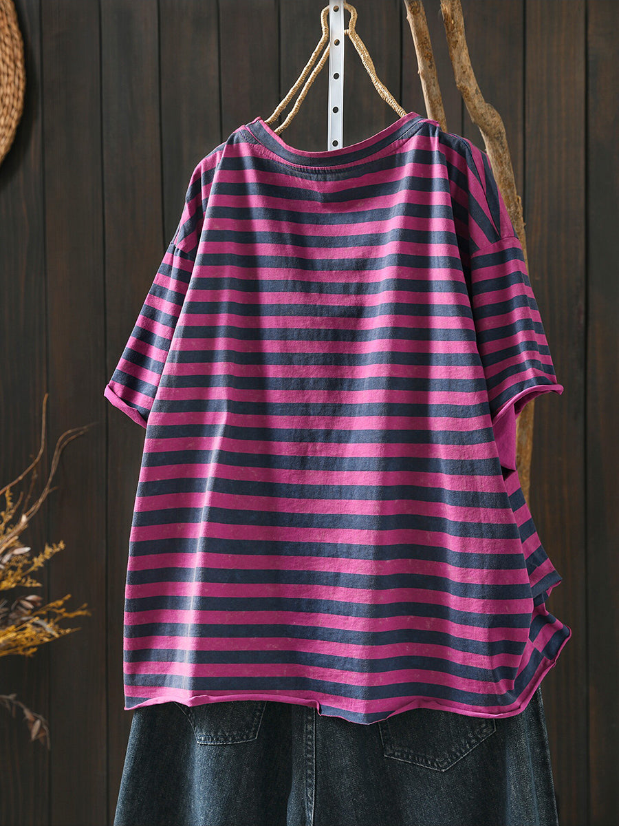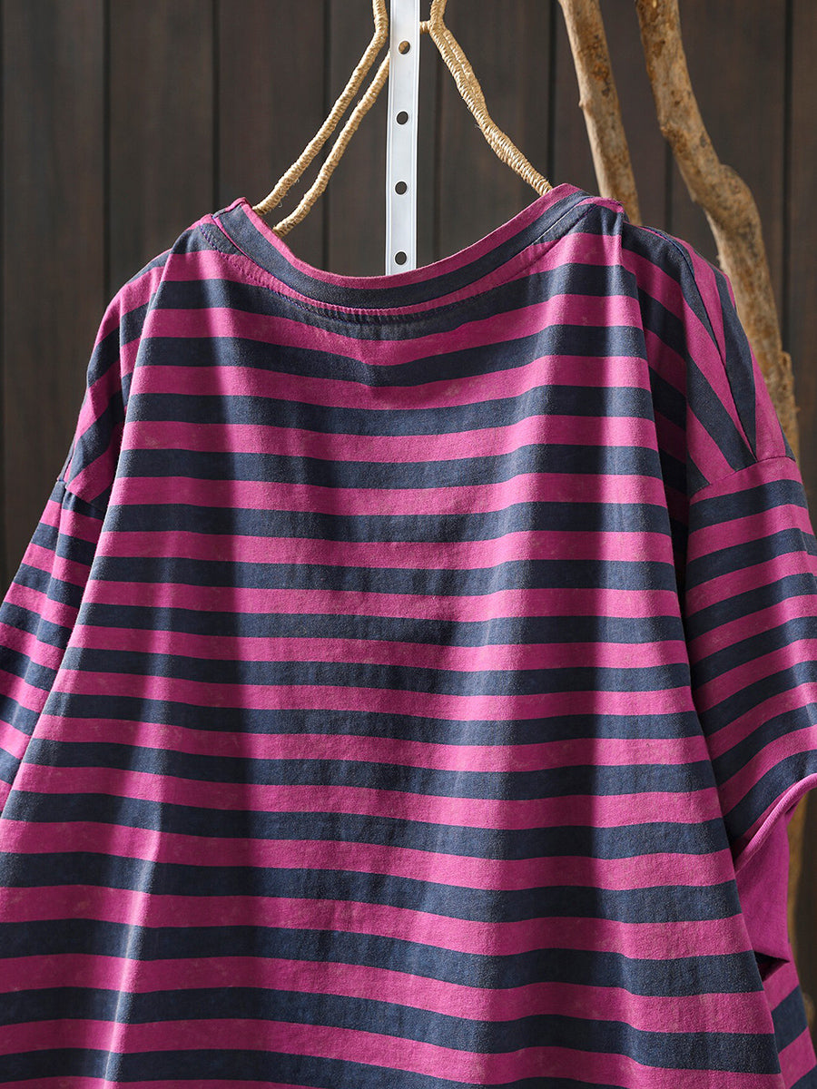 Damska letnia, swobodna koszula w paski z okrągłym dekoltem