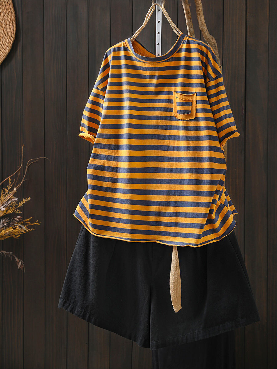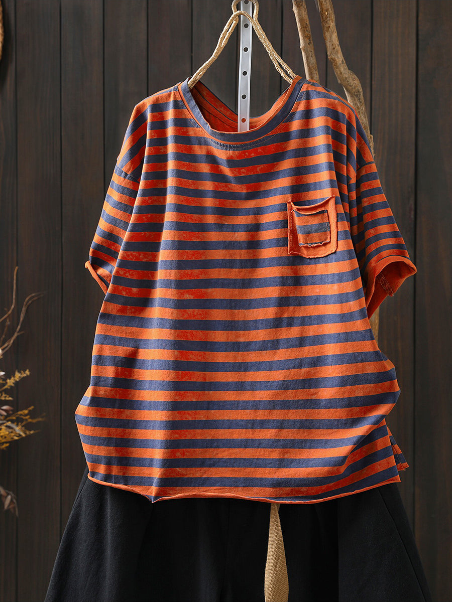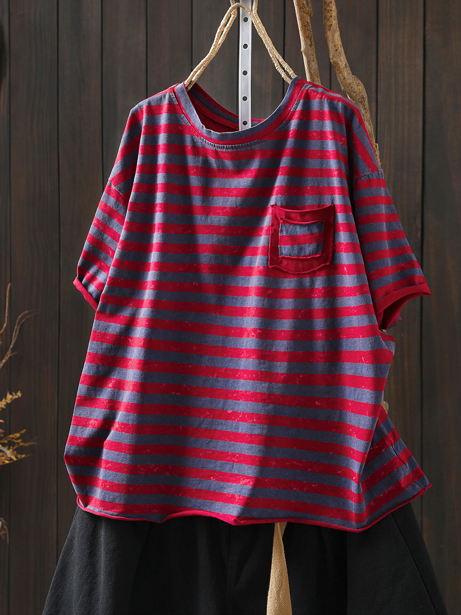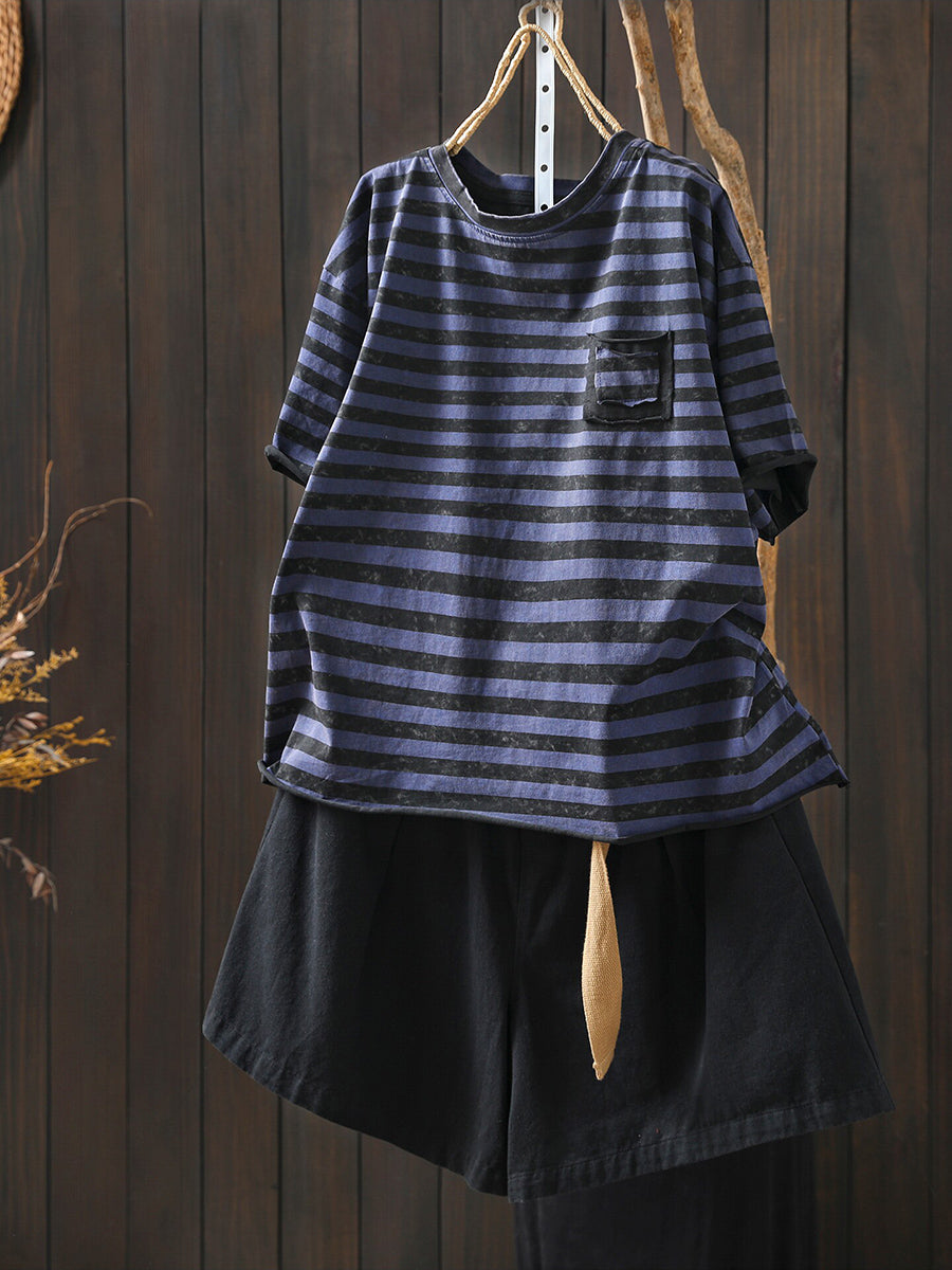 Damska letnia, swobodna koszula w paski z okrągłym dekoltem