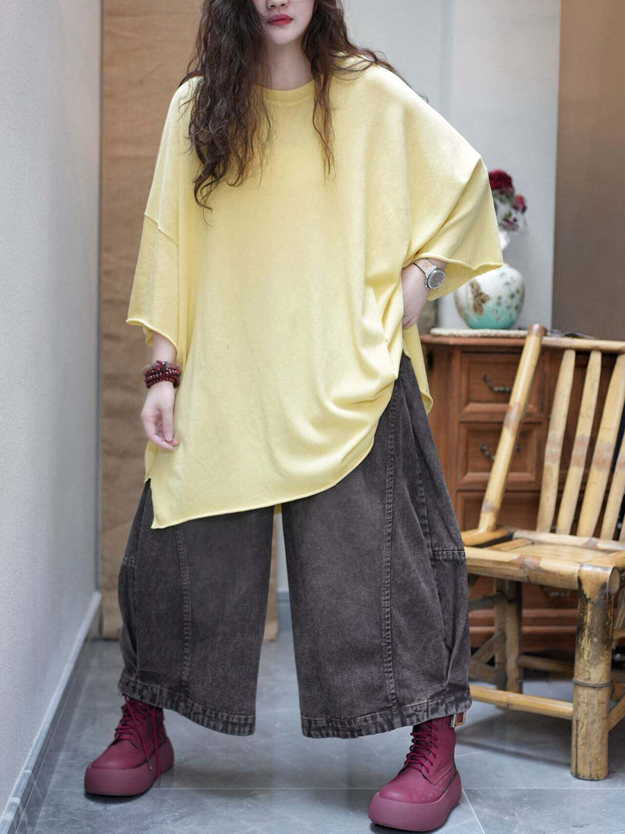Damska letnia luźna koszulka z okrągłym dekoltem z czystej bawełny