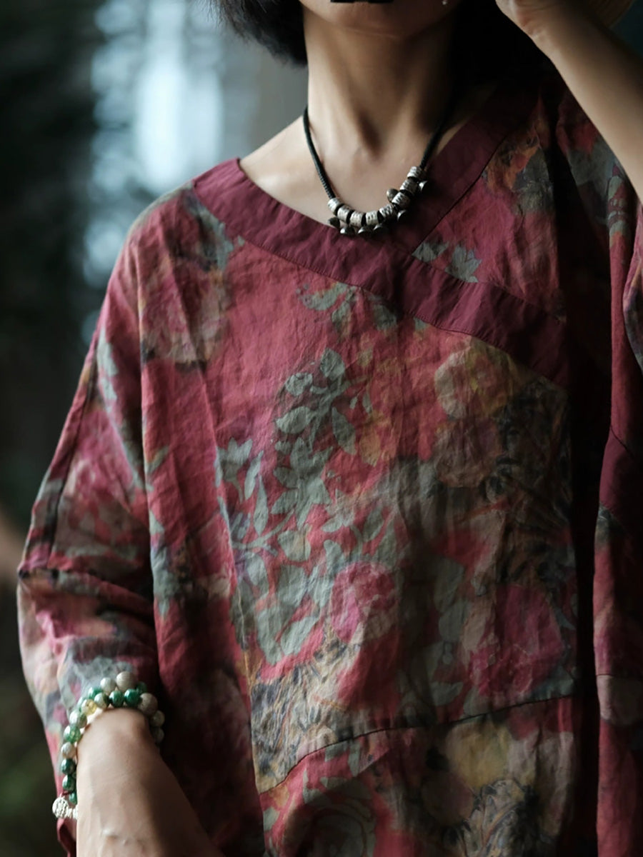 Sukienka damska letnia vintage z kwiatowym wzorem ramii i dekoltem w serek