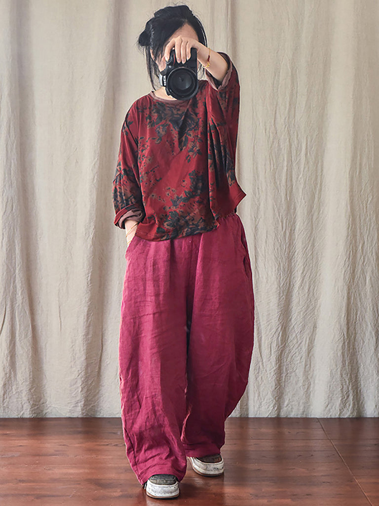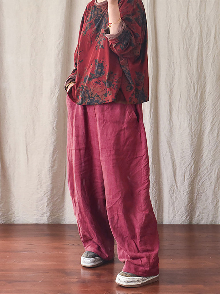 Plus Size Women Linen Pocket Elastic Waist Pure Color Pants