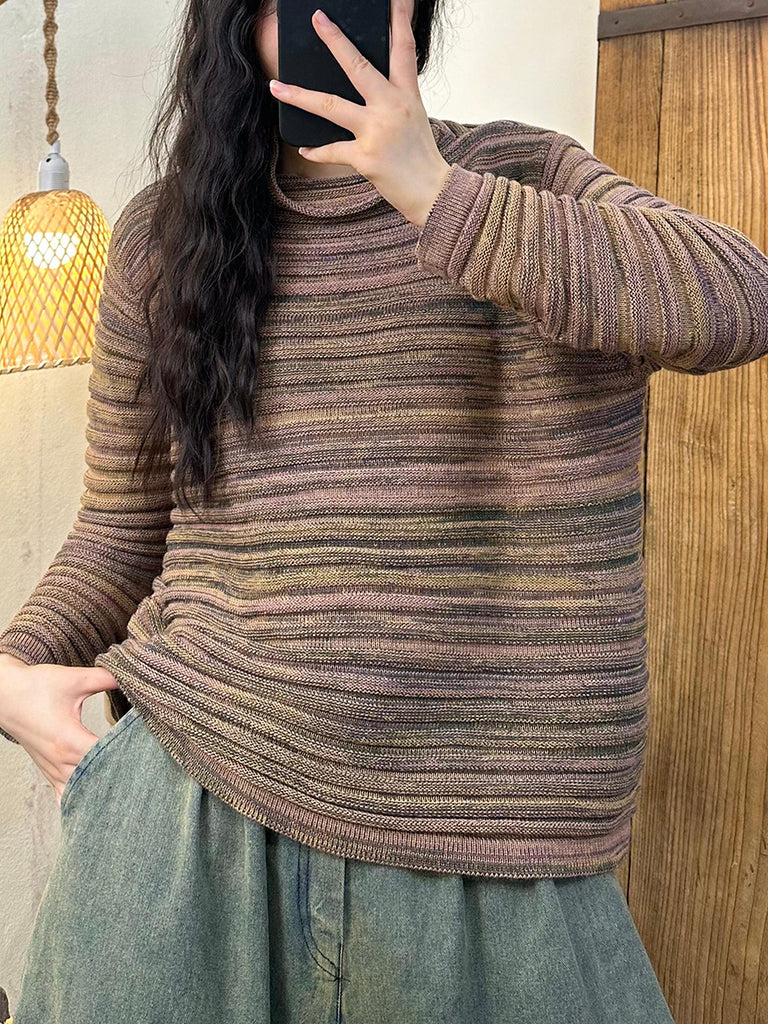 Women Autumn Stacked Collar Colorblock Stripe Sweater