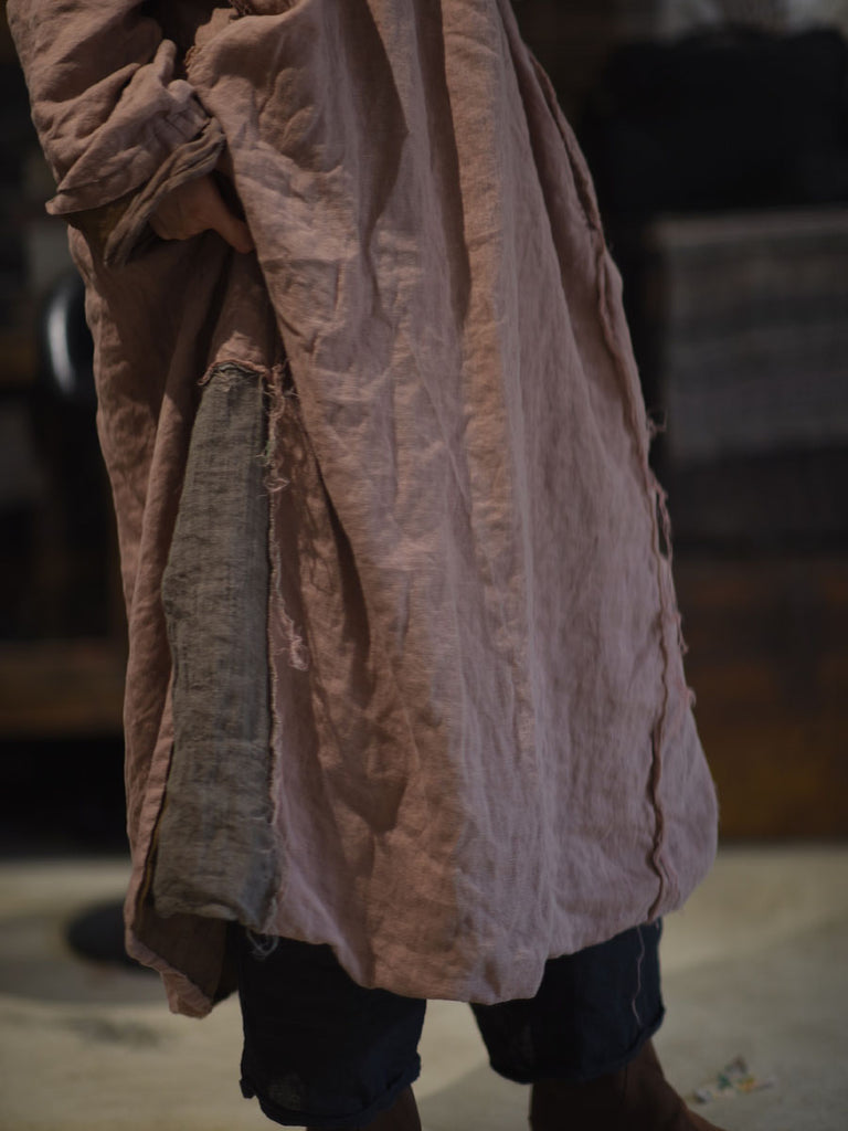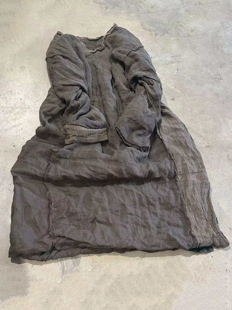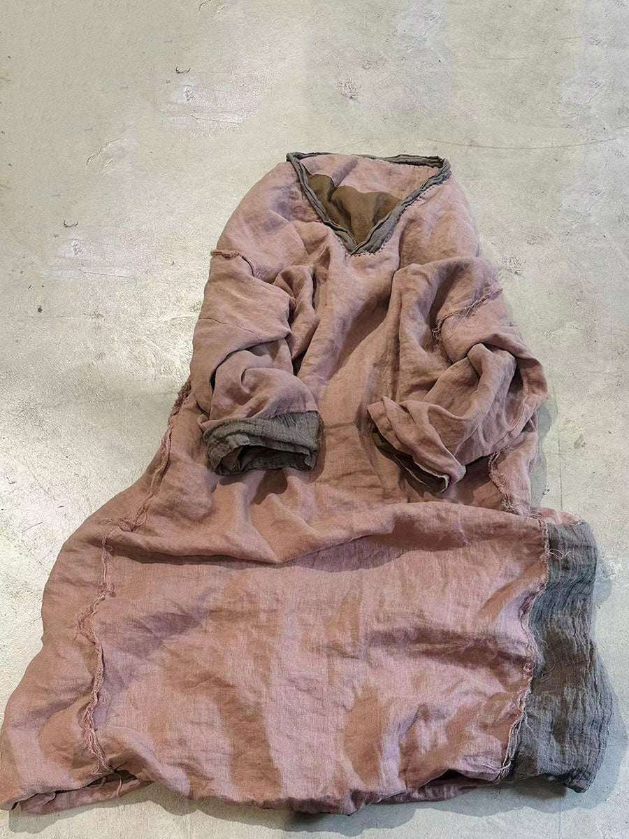 Women Retro Autumn Colorblock Linen Robe Dress