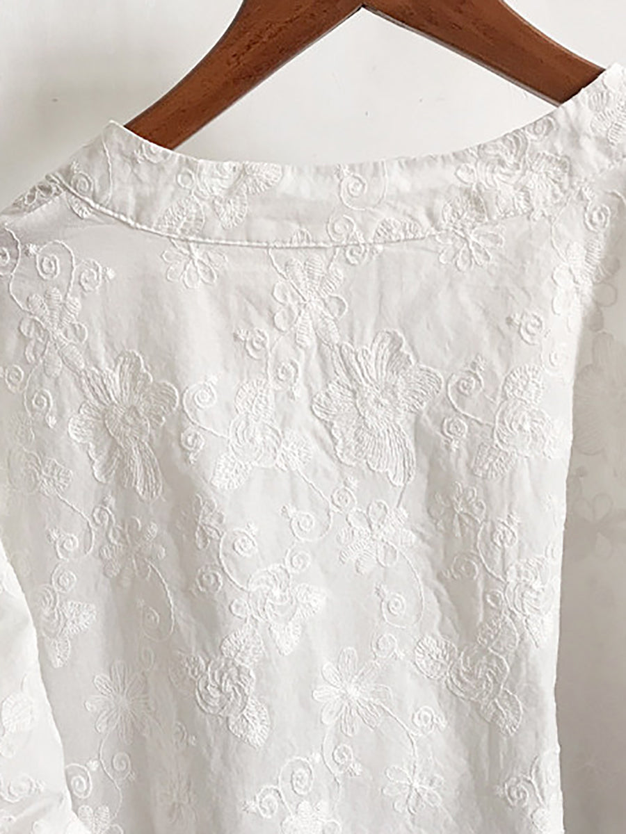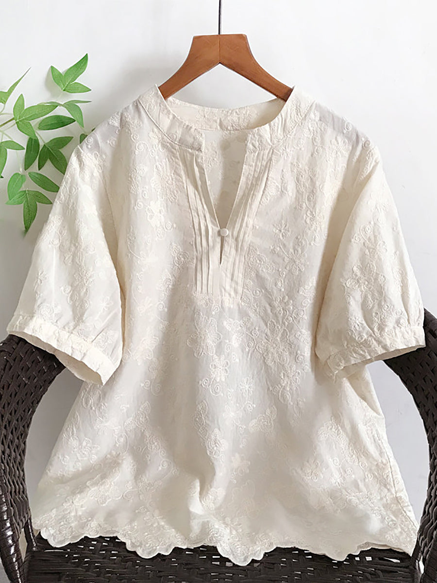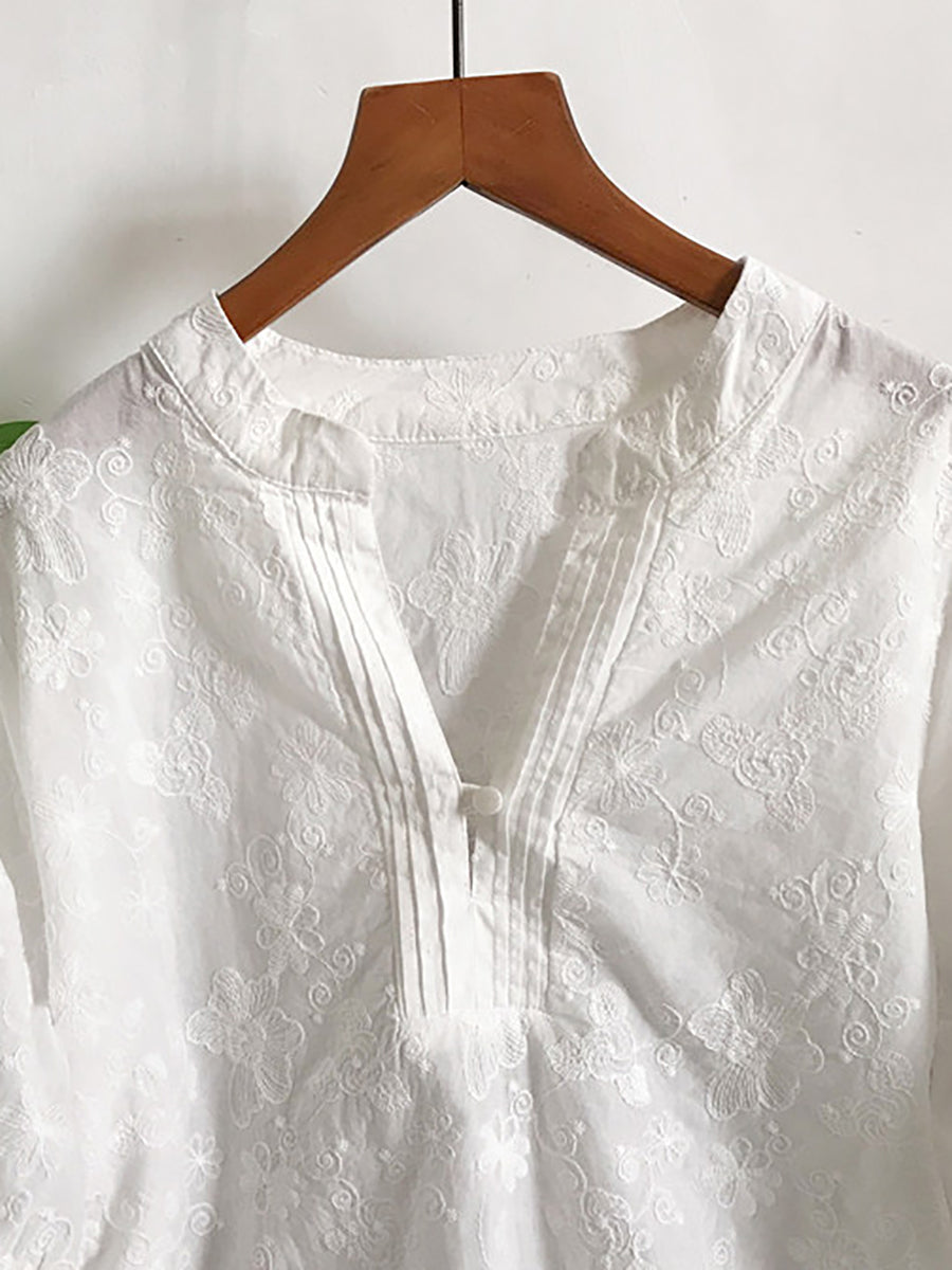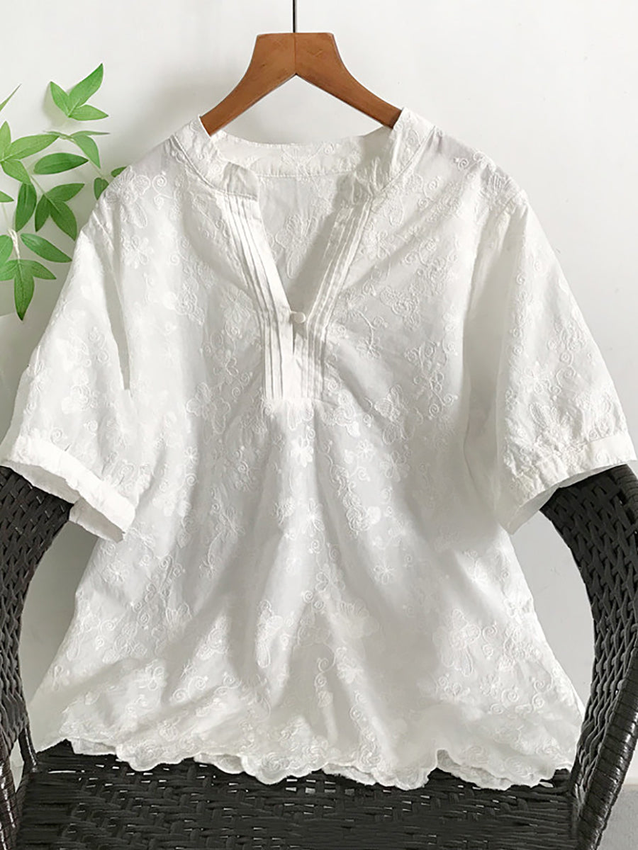 Women Summer Artsy Embroidery V-Neck 100%Cotton Blouse