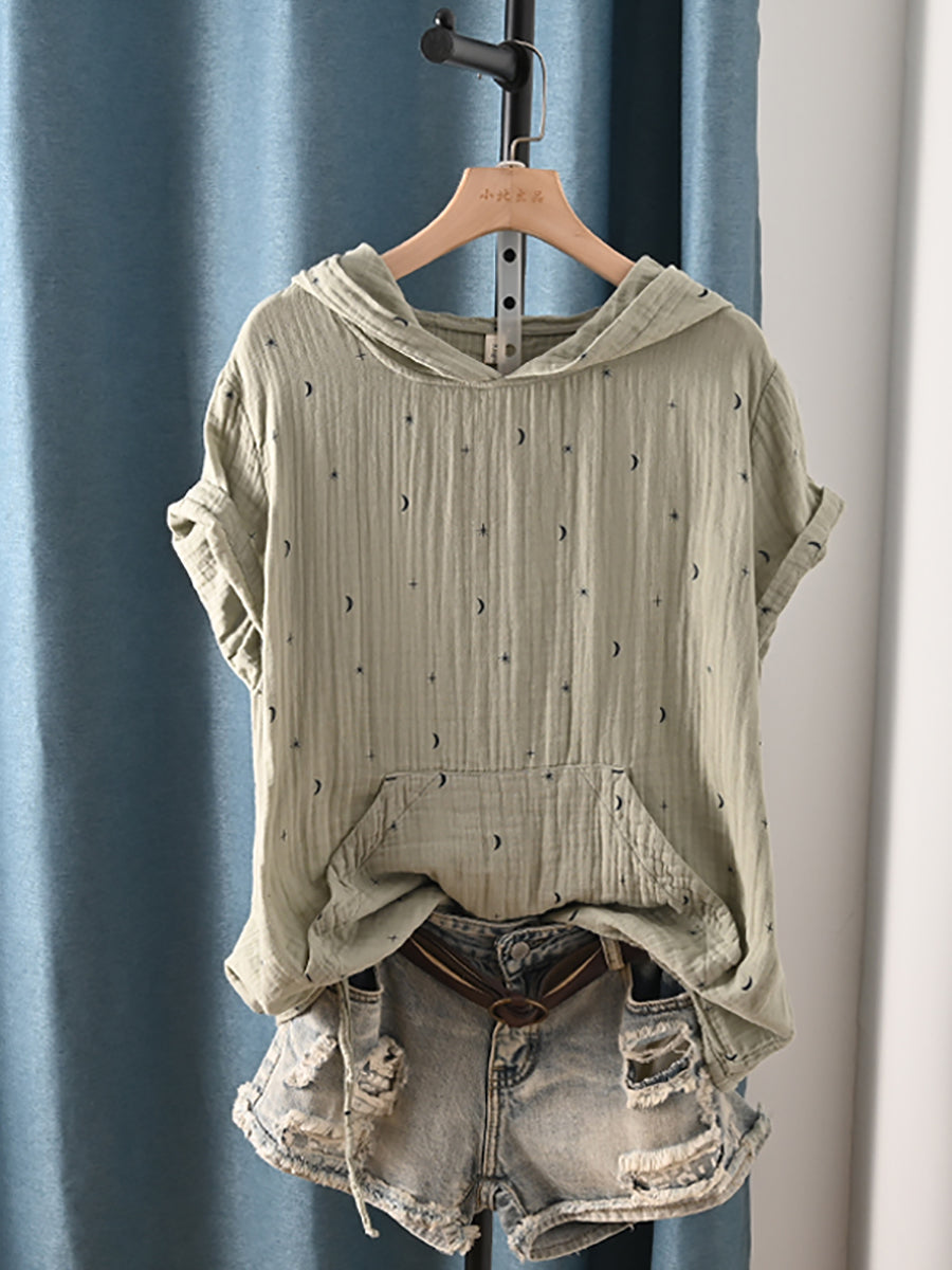Plus Size Women Summer Casual Print Hooded 100%Cotton Shirt