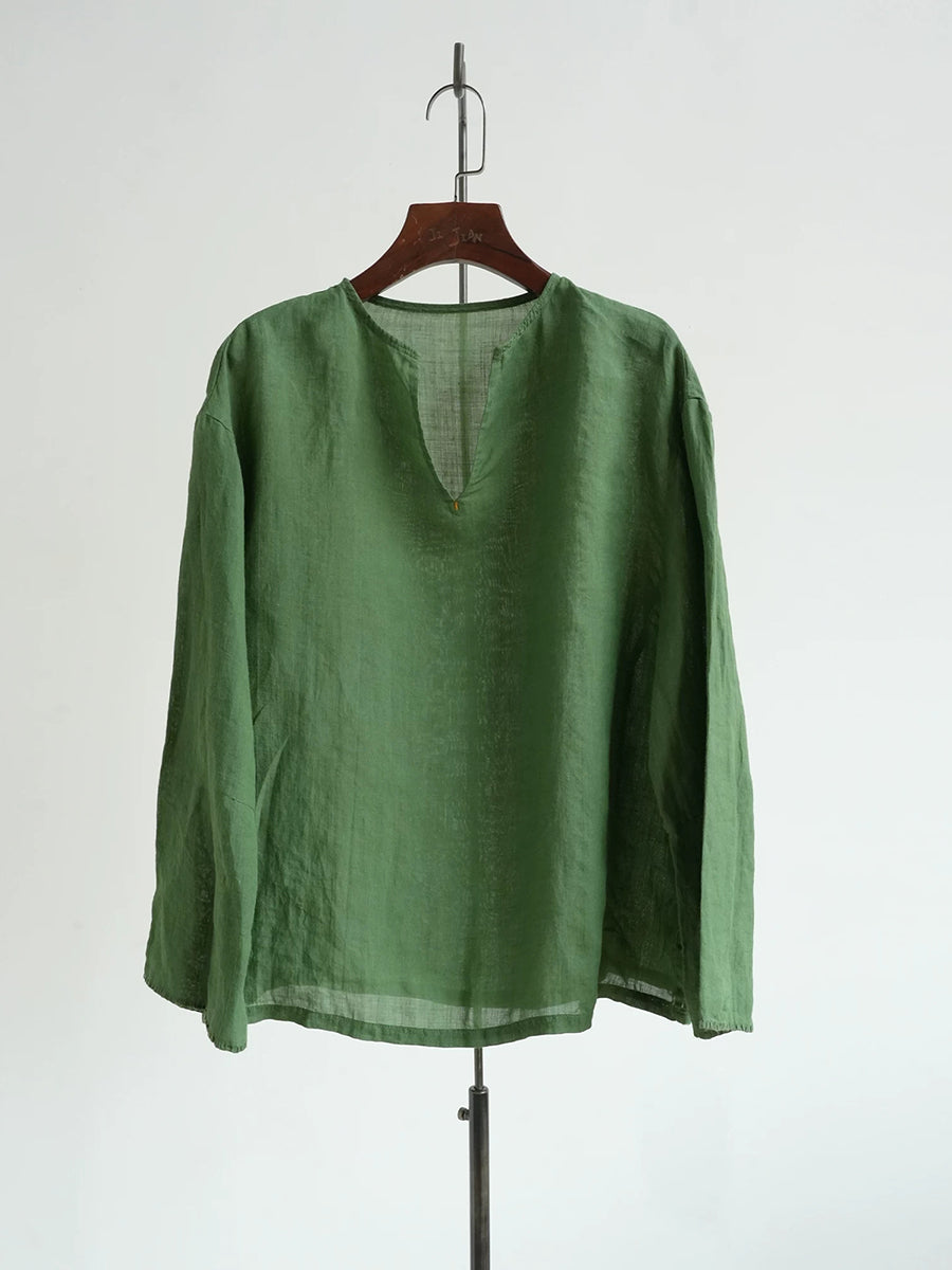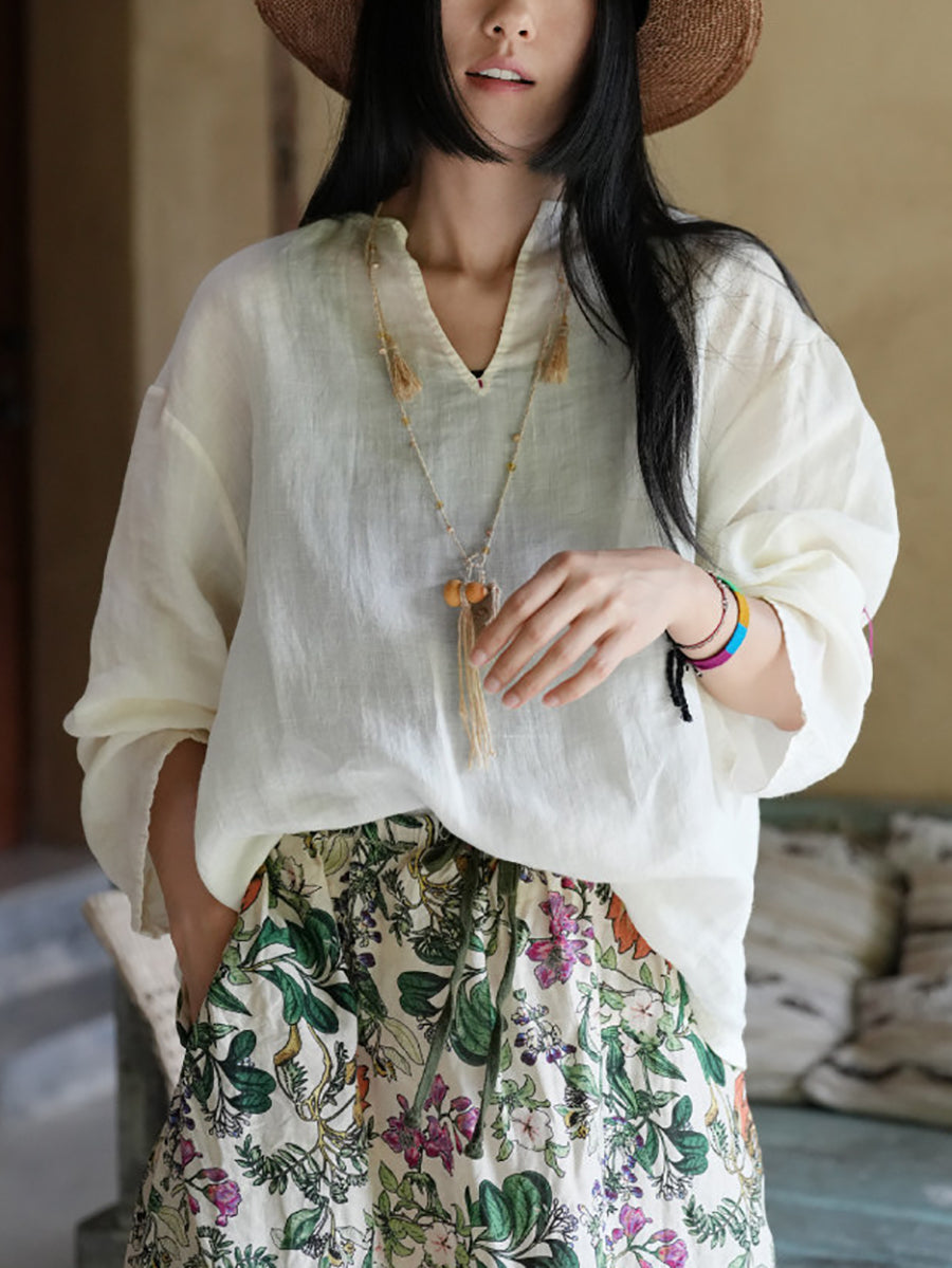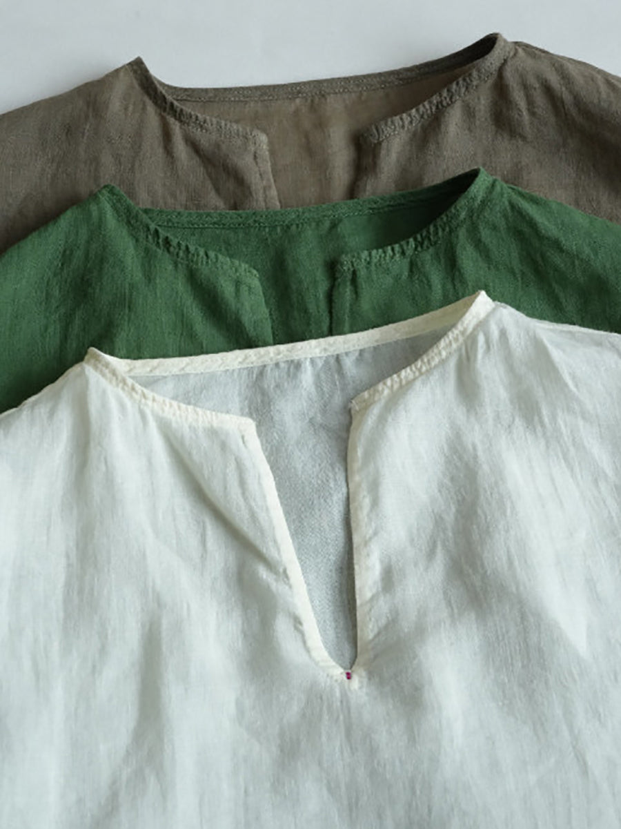 Women Summer Casual Pure Color 100%Ramie V-Neck Blouse