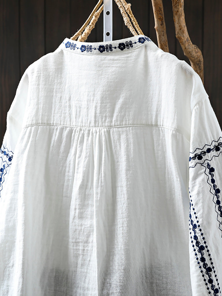Women Summer Embroidery Stand Collar 100%Cotton Shirt