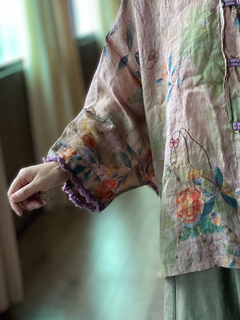 Women Summer Ethnic Flower Button Linen Shirt