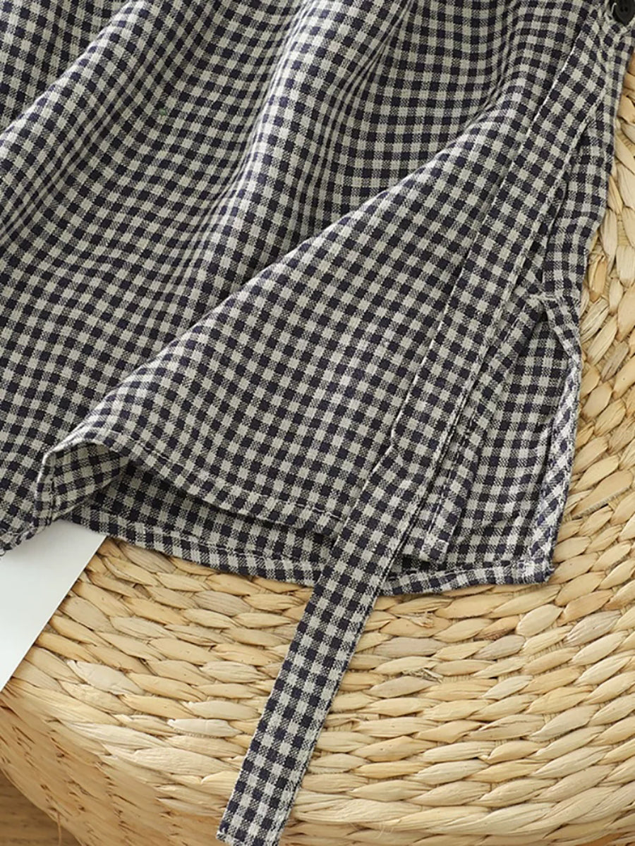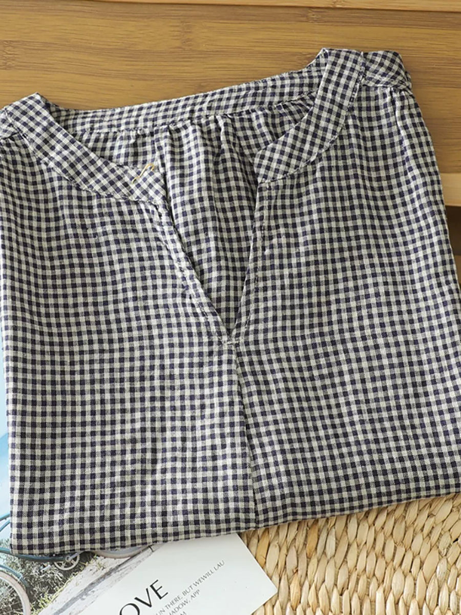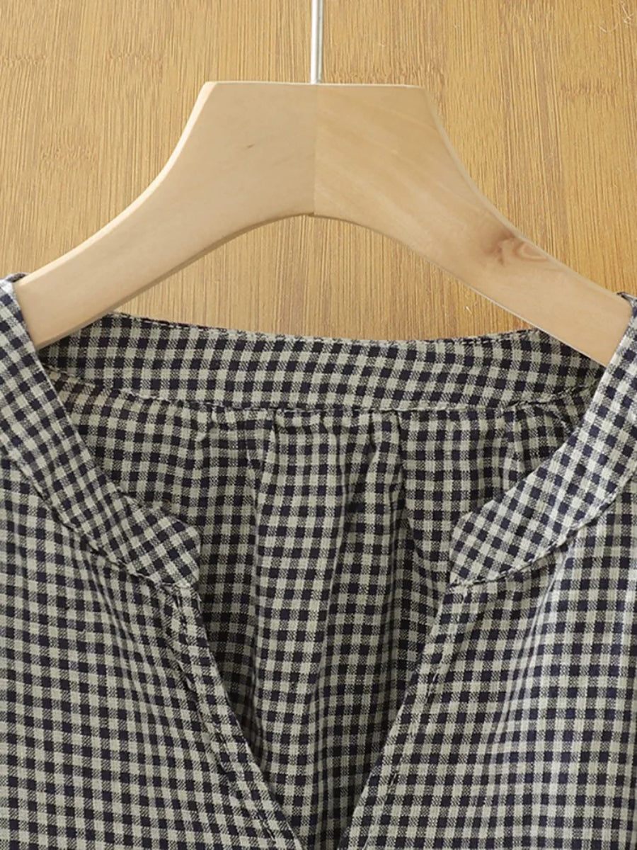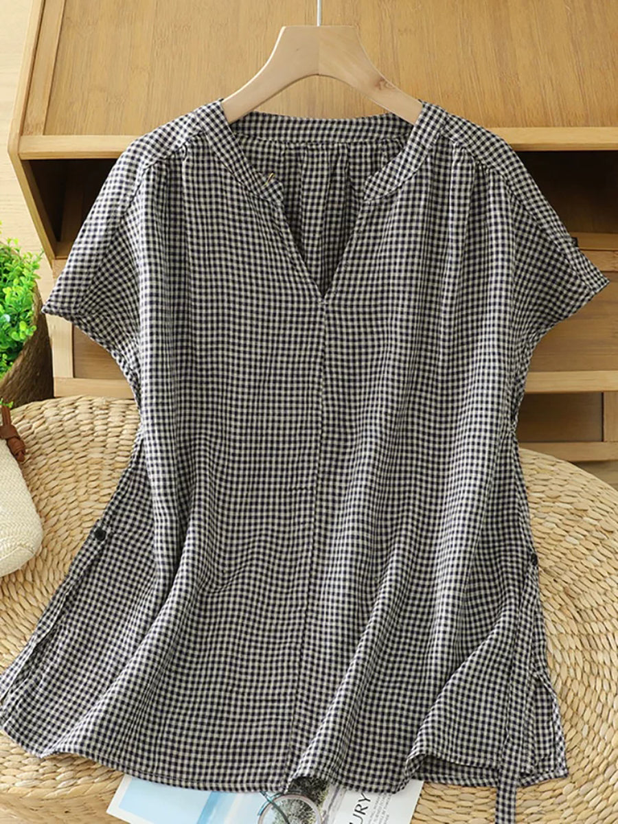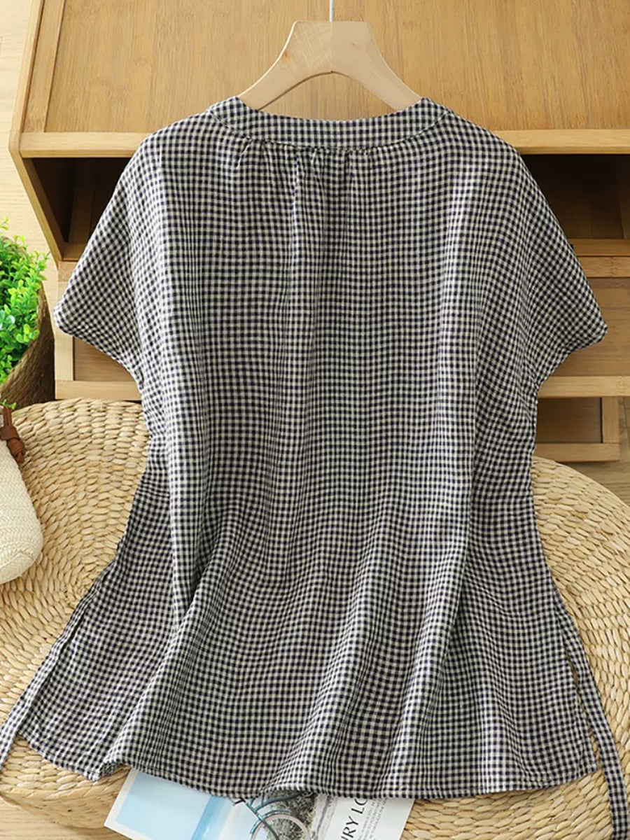 Women Summer Retro Plaid V-Neck Blouse