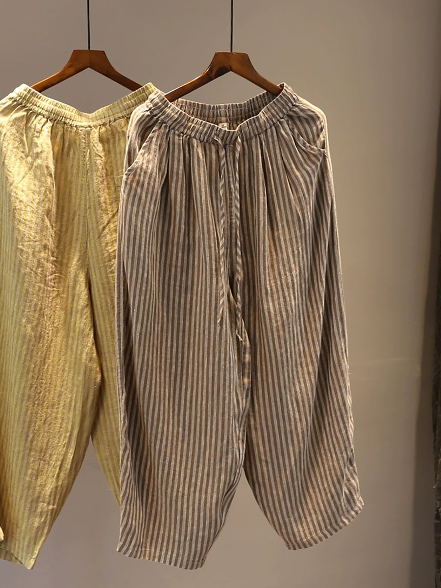Plus Size Women Summer Stripe Straight 100%Linen Pants