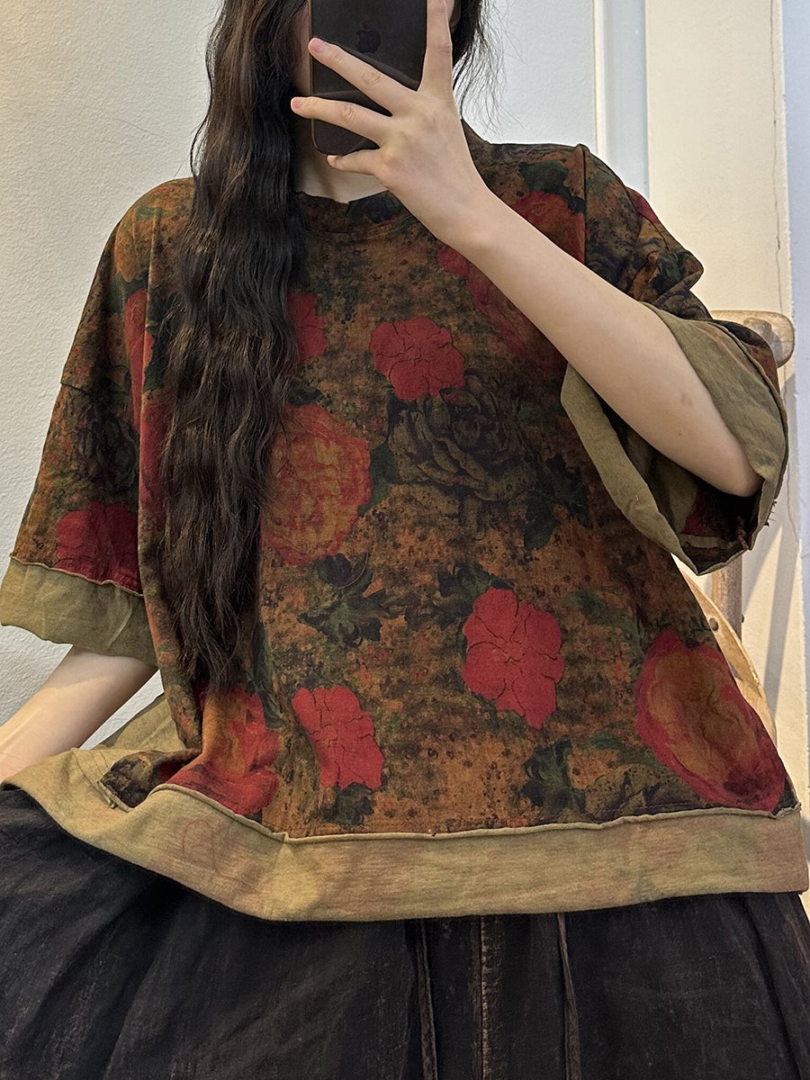 Plus Size Women Vintage Flower Spliced Worn Loose Shirt