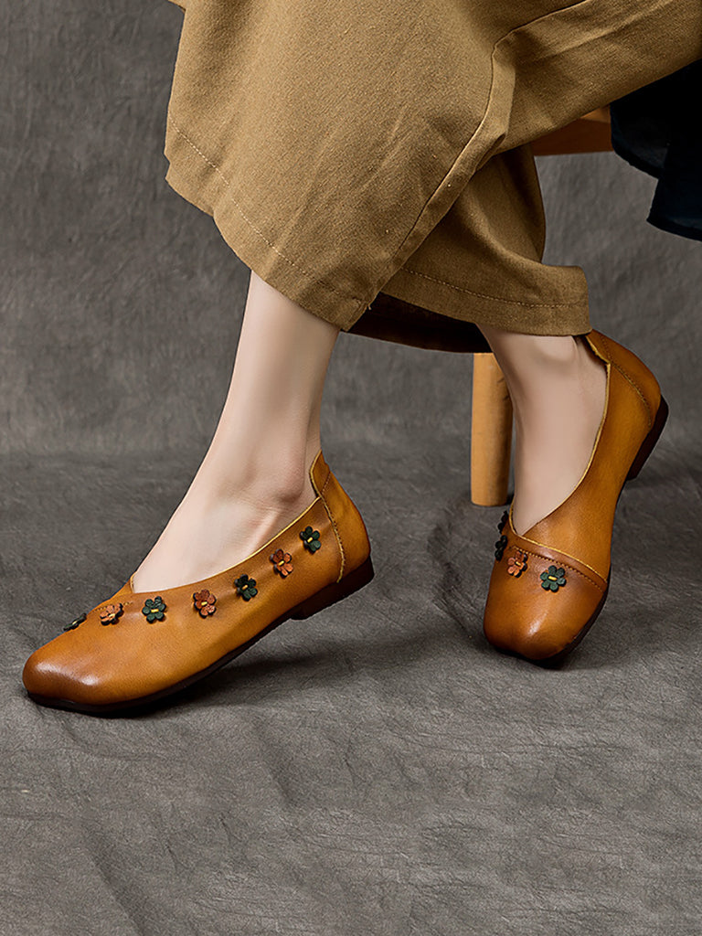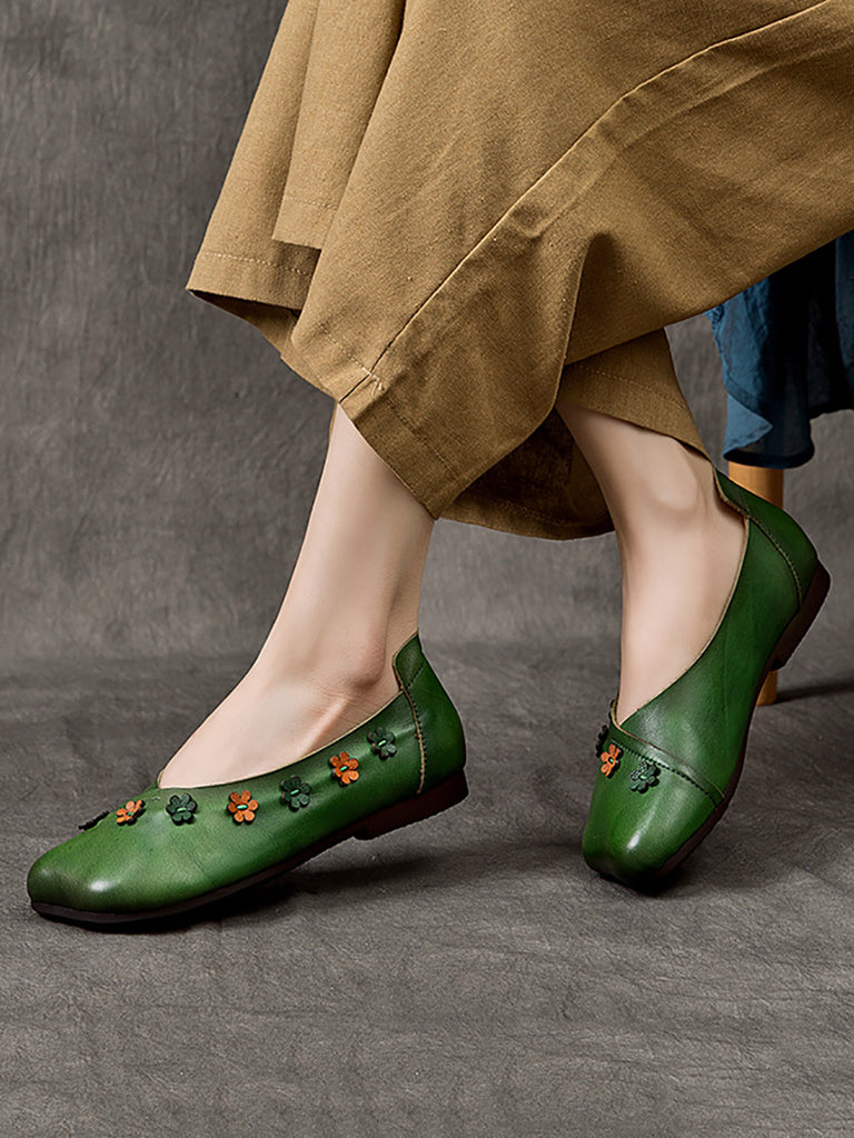 Women Vintage Summer Leather Flower Spliced Flat Shoes