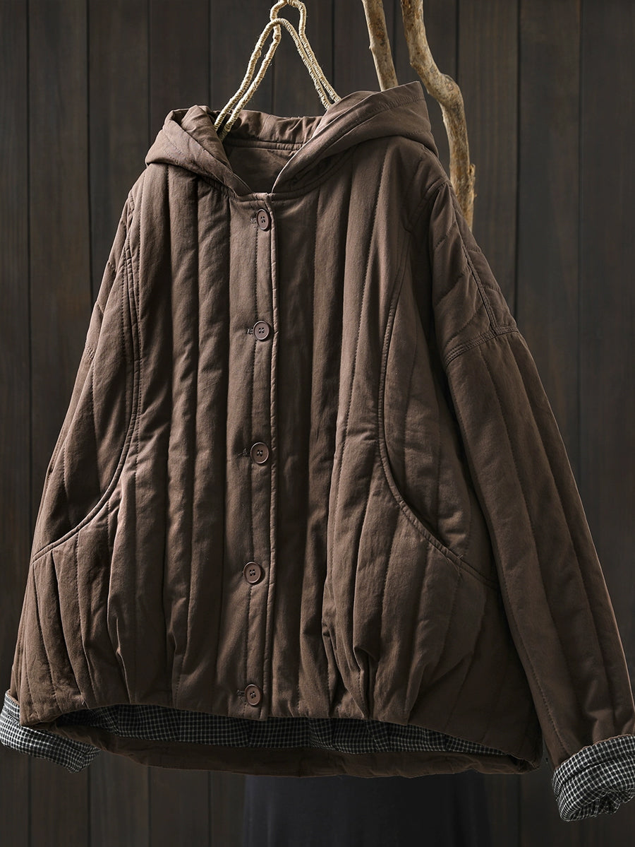 Casaco feminino de inverno casual com capuz e acolchoado em cor lisa.